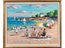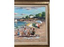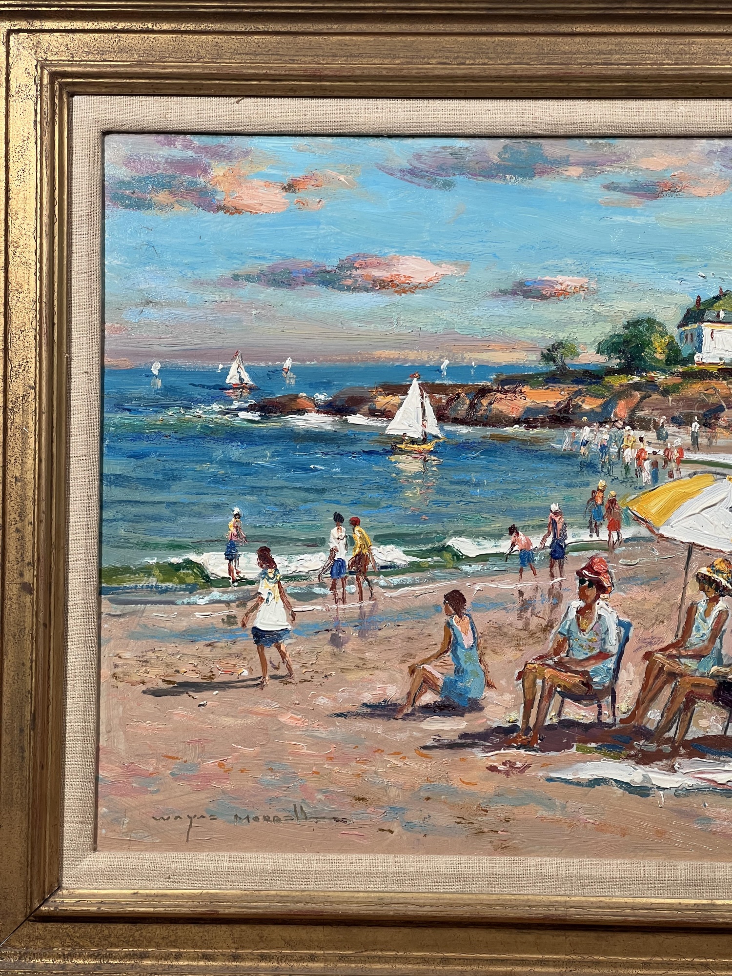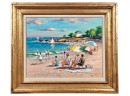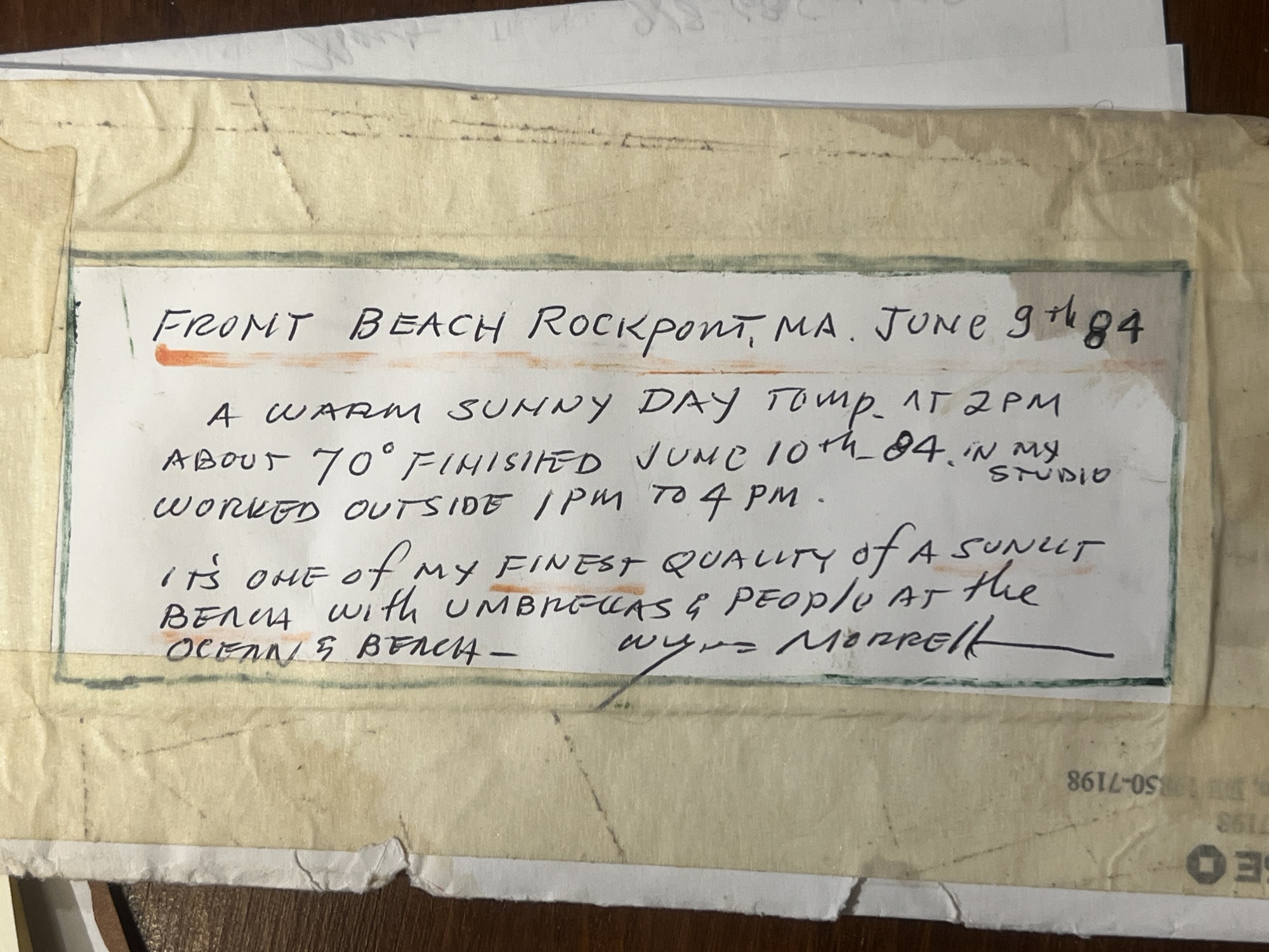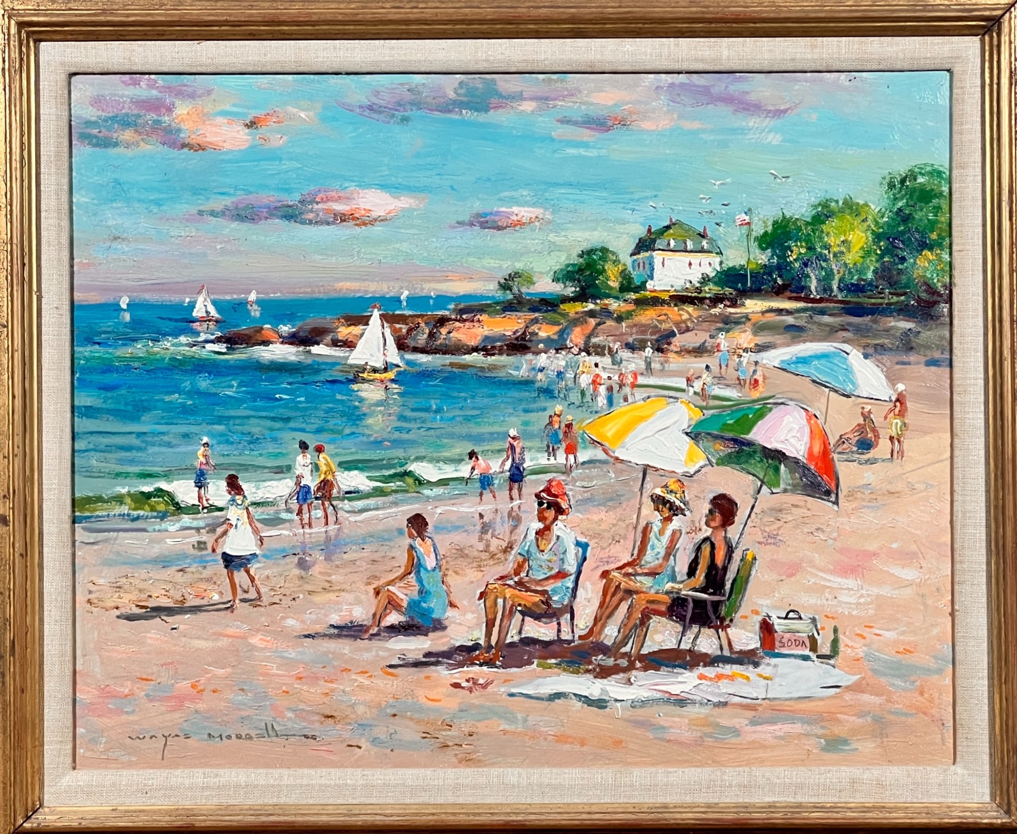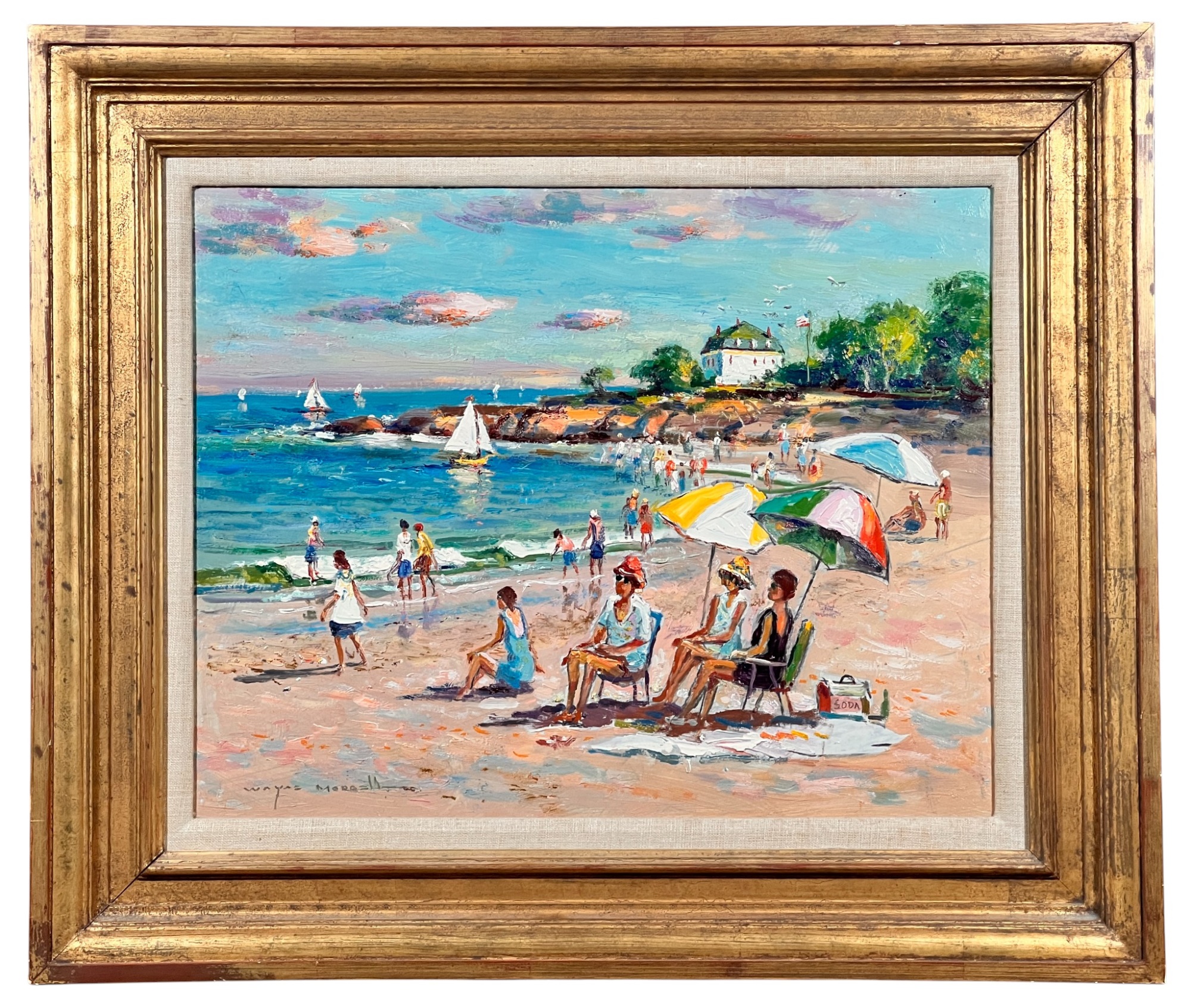 Front Beach (Rockport, MA), oil on Masonite 16 x 20 inches, signed lower left, inscription "Front Beach Rockport, MA June 9th 1984. A warm sunny day temp at 2PM about 70. Finished June 10th '84 in my studio. Worked outside 1-4PM. It's one of my finest quality of a sunset beach with umbrellas and people at the ocean & beach - Wayne Morrell". 22 3/4 x 26 3/4 inches overall.