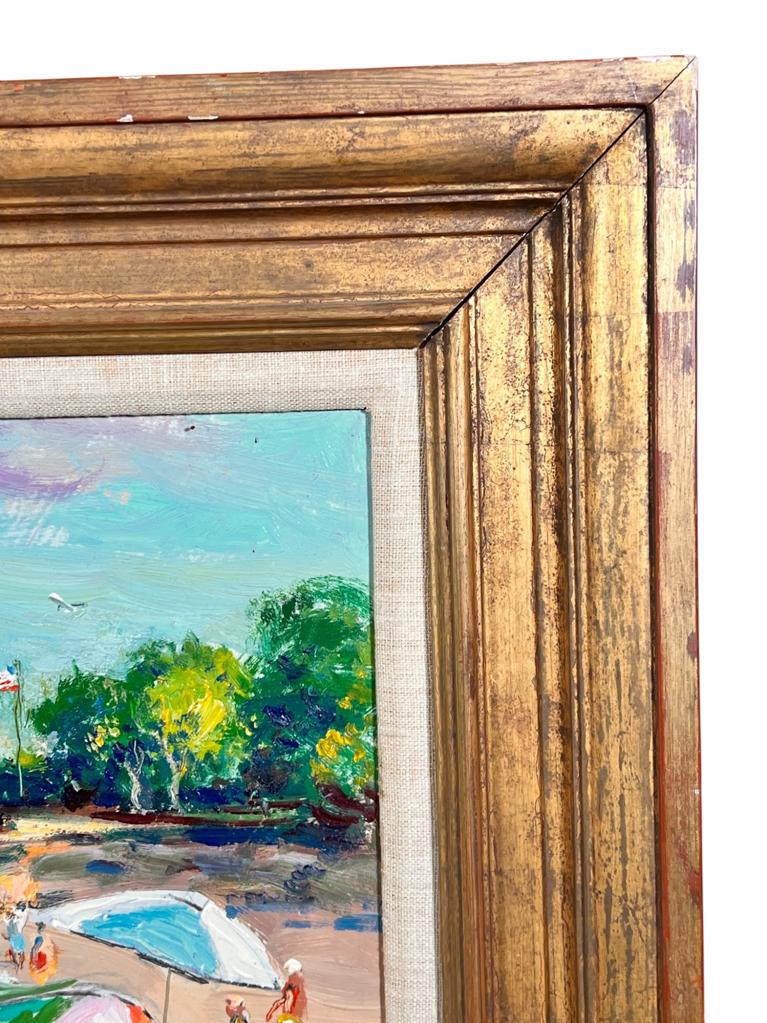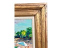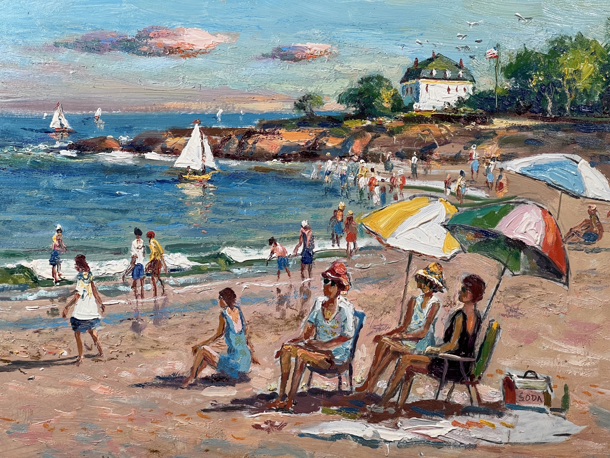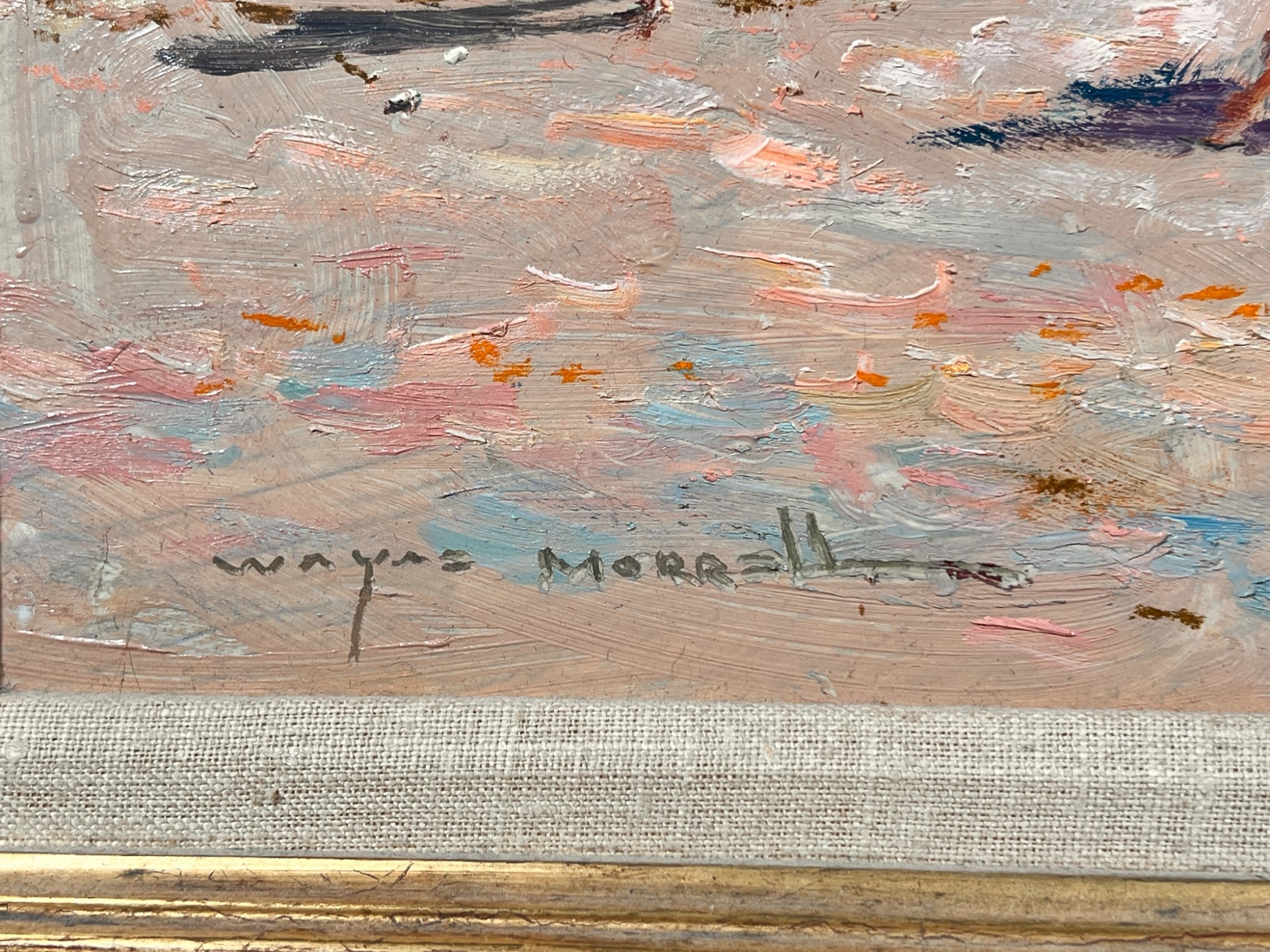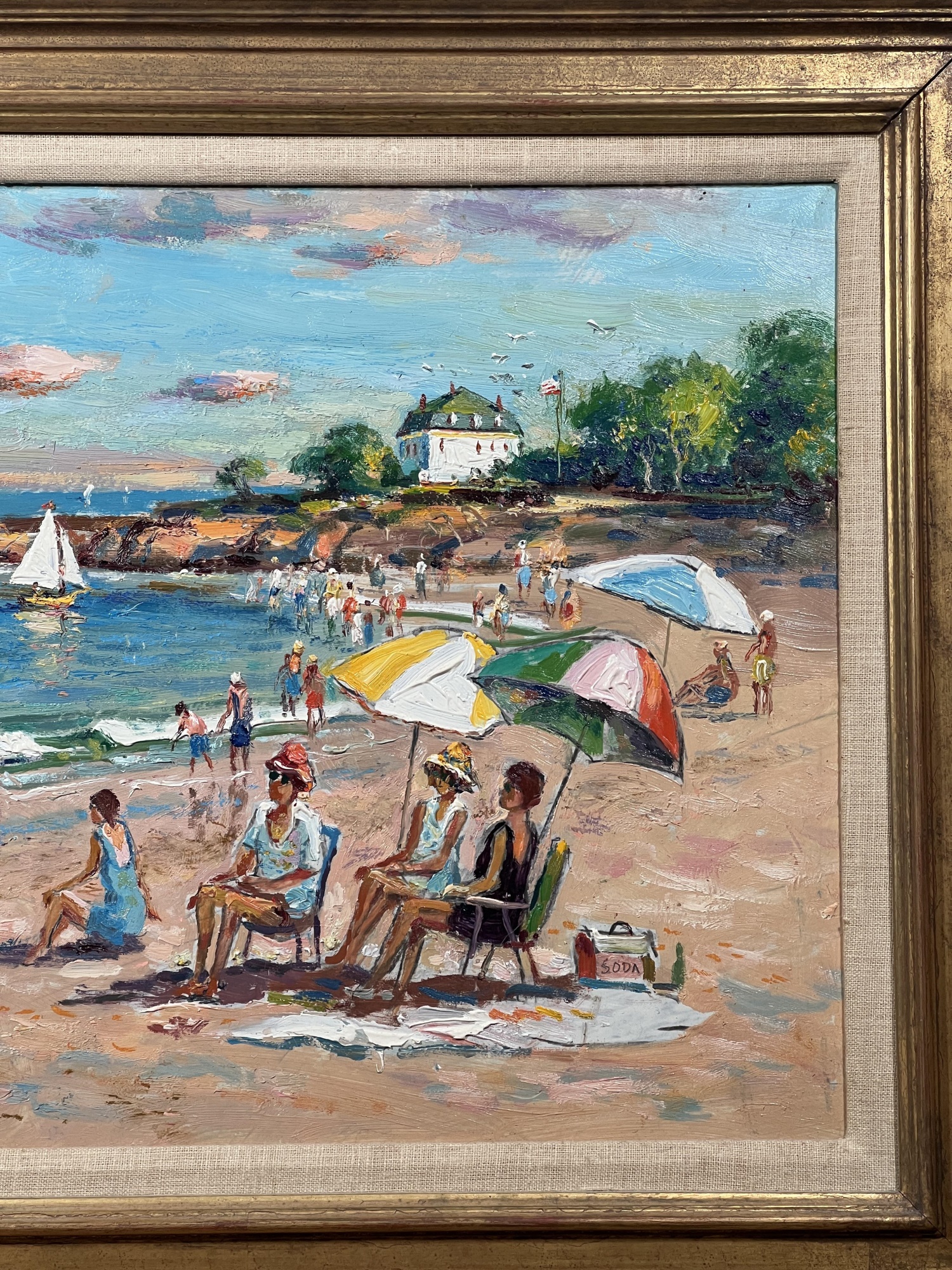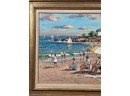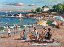 Front Beach (Rockport, MA), oil on Masonite 16 x 20 inches, signed lower left, inscription "Front Beach Rockport, MA June 9th 1984. A warm sunny day temp at 2PM about 70. Finished June 10th '84 in my studio. Worked outside 1-4PM. It's one of my finest quality of a sunset beach with umbrellas and people at the ocean & beach - Wayne Morrell". 22 3/4 x 26 3/4 inches overall.