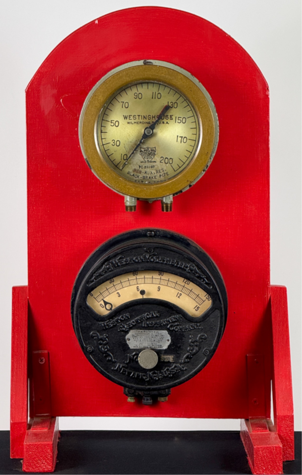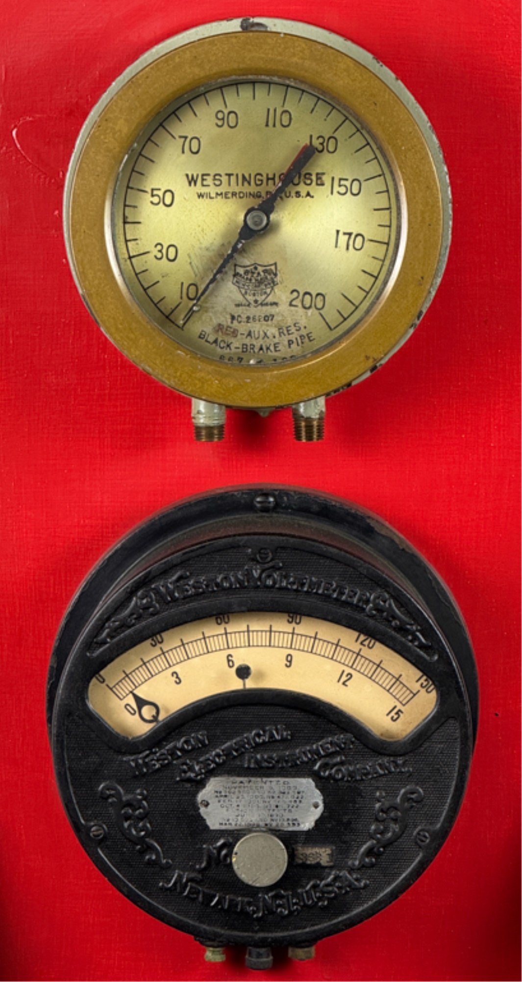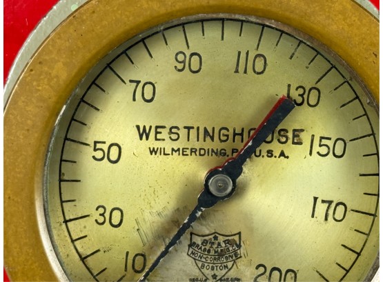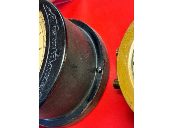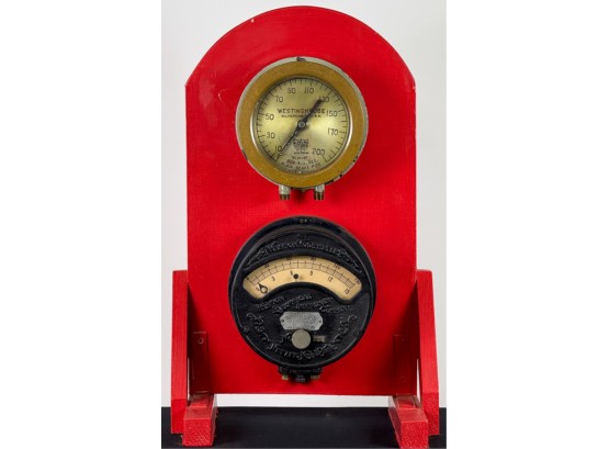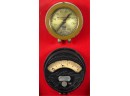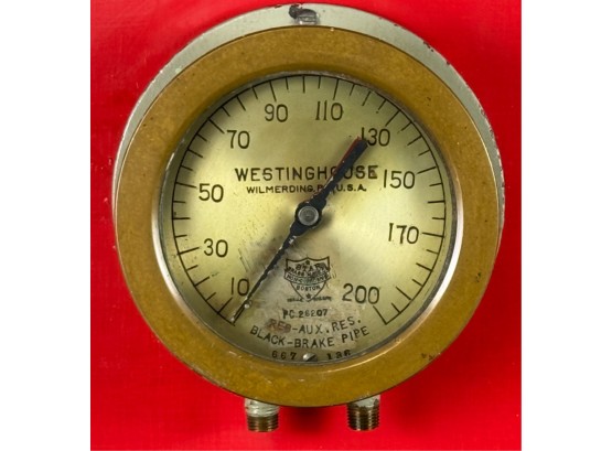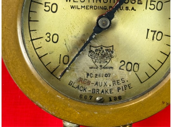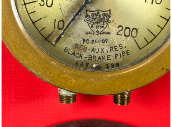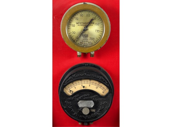 Airbrake steam pressure gauge and voltmeter. Largest measures 7 inches. Condition: Good. Age expected wear. Temp No 43a