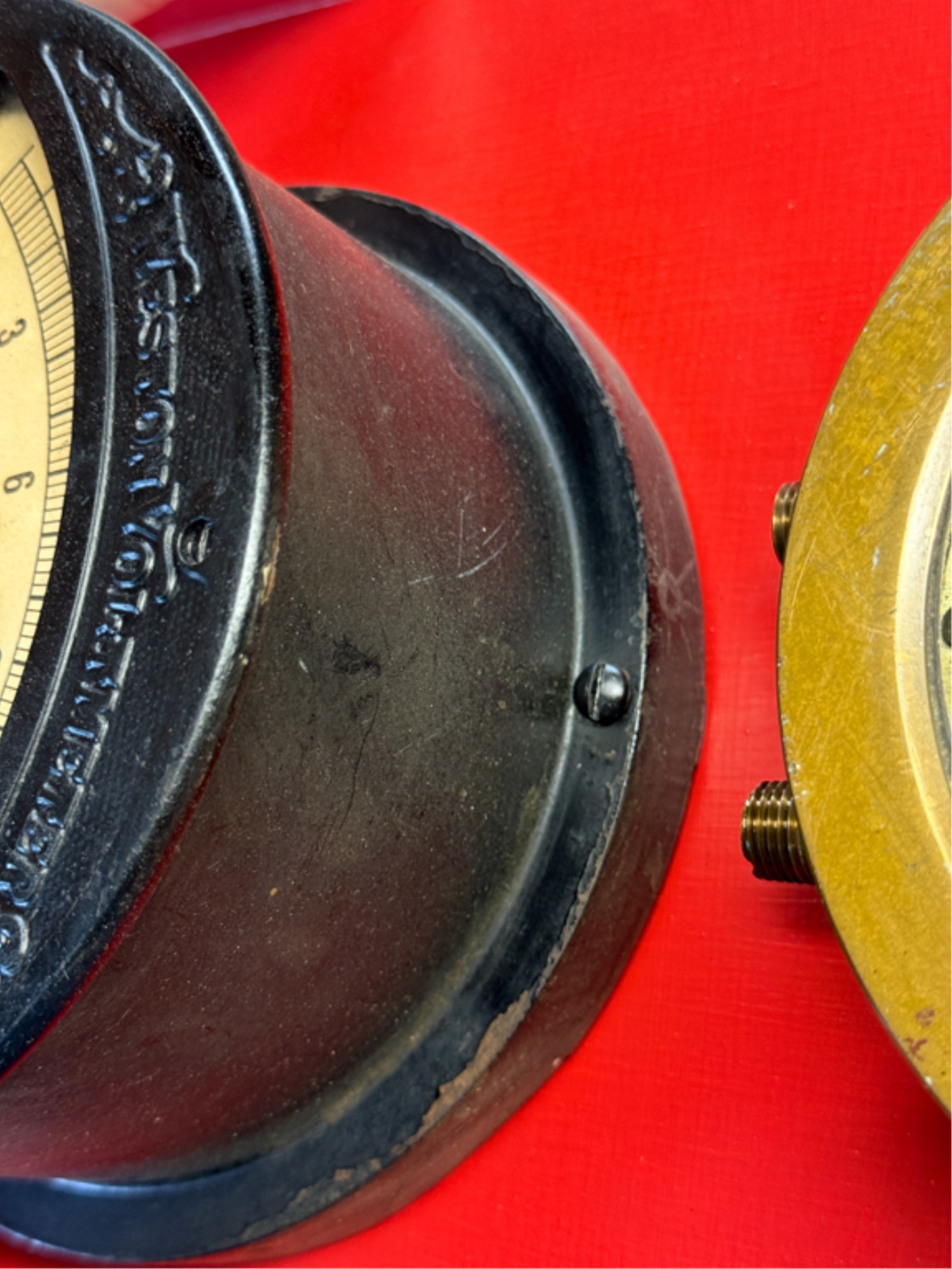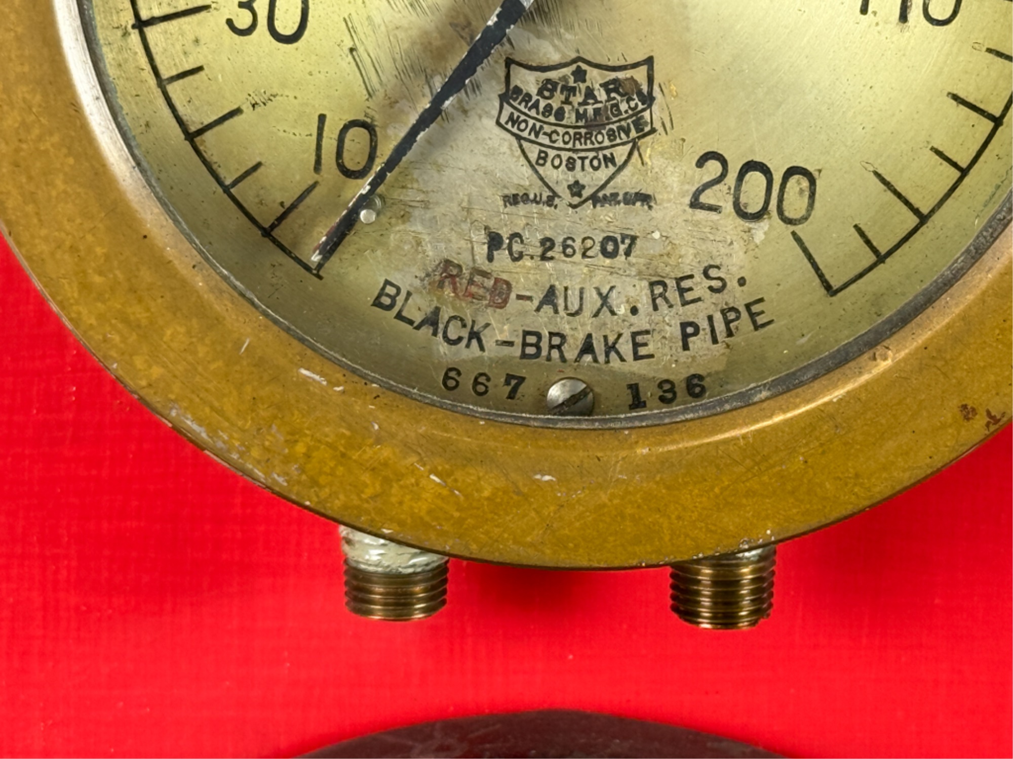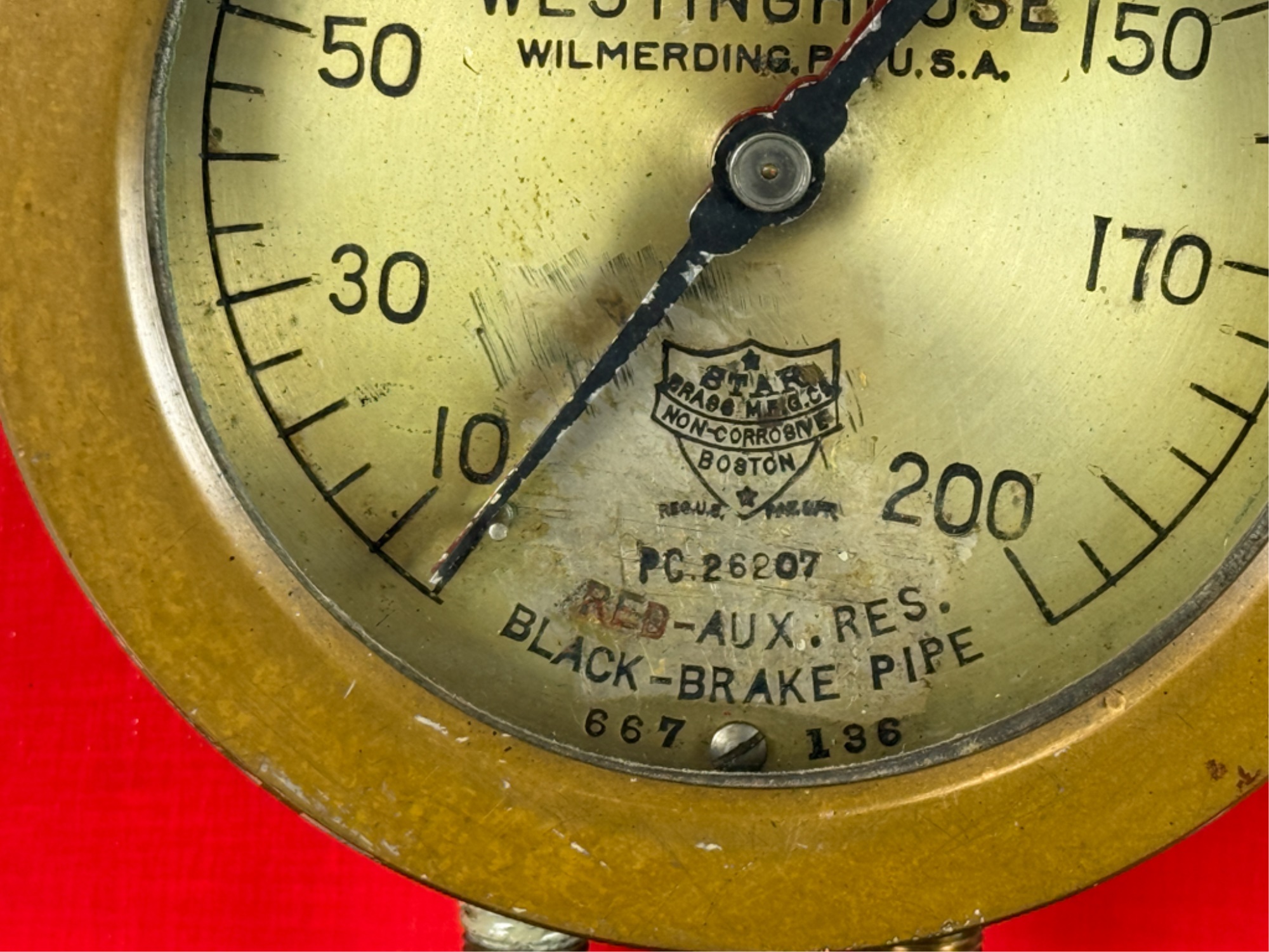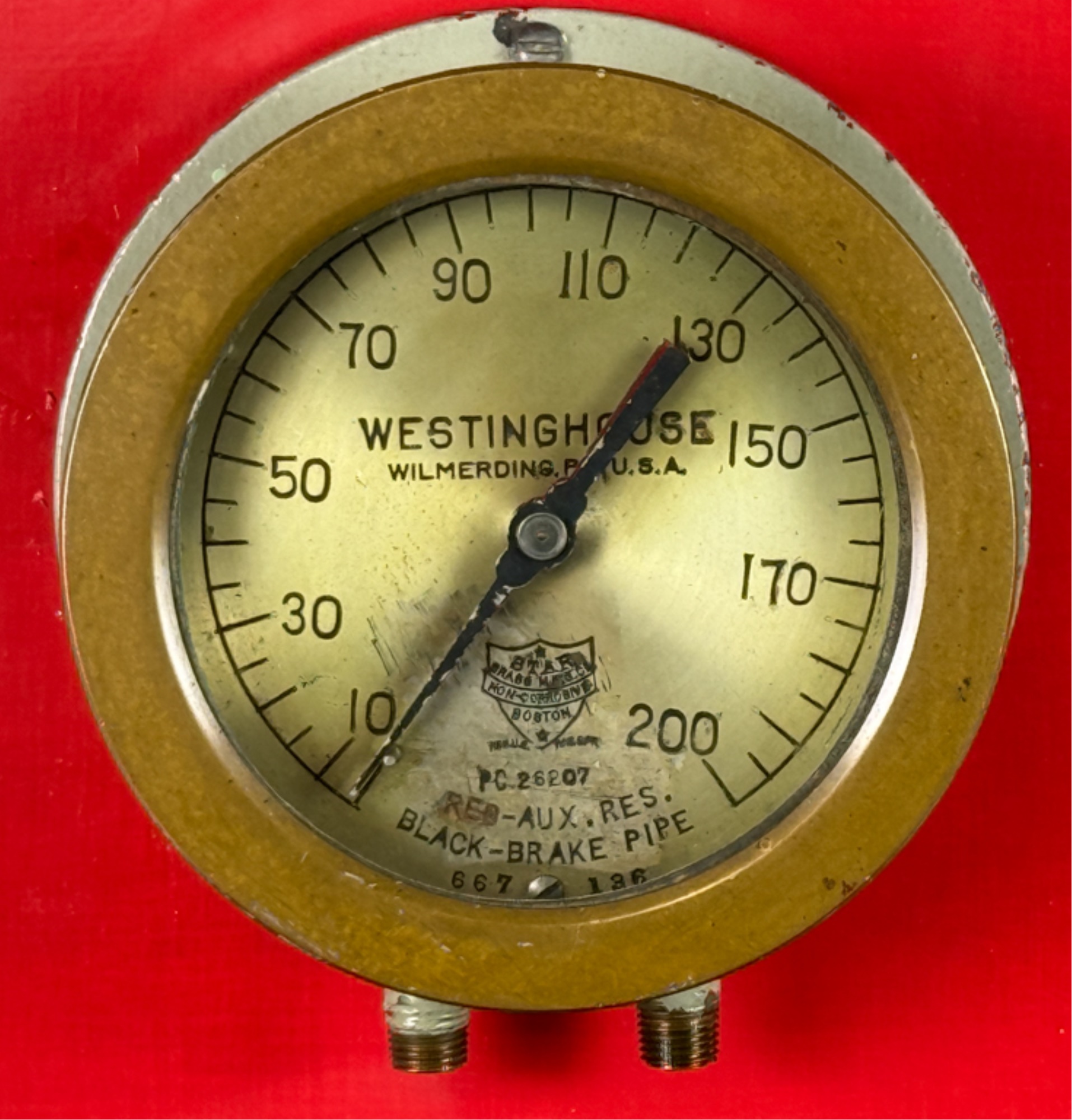 Airbrake steam pressure gauge and voltmeter. Largest measures 7 inches. Condition: Good. Age expected wear. Temp No 43a