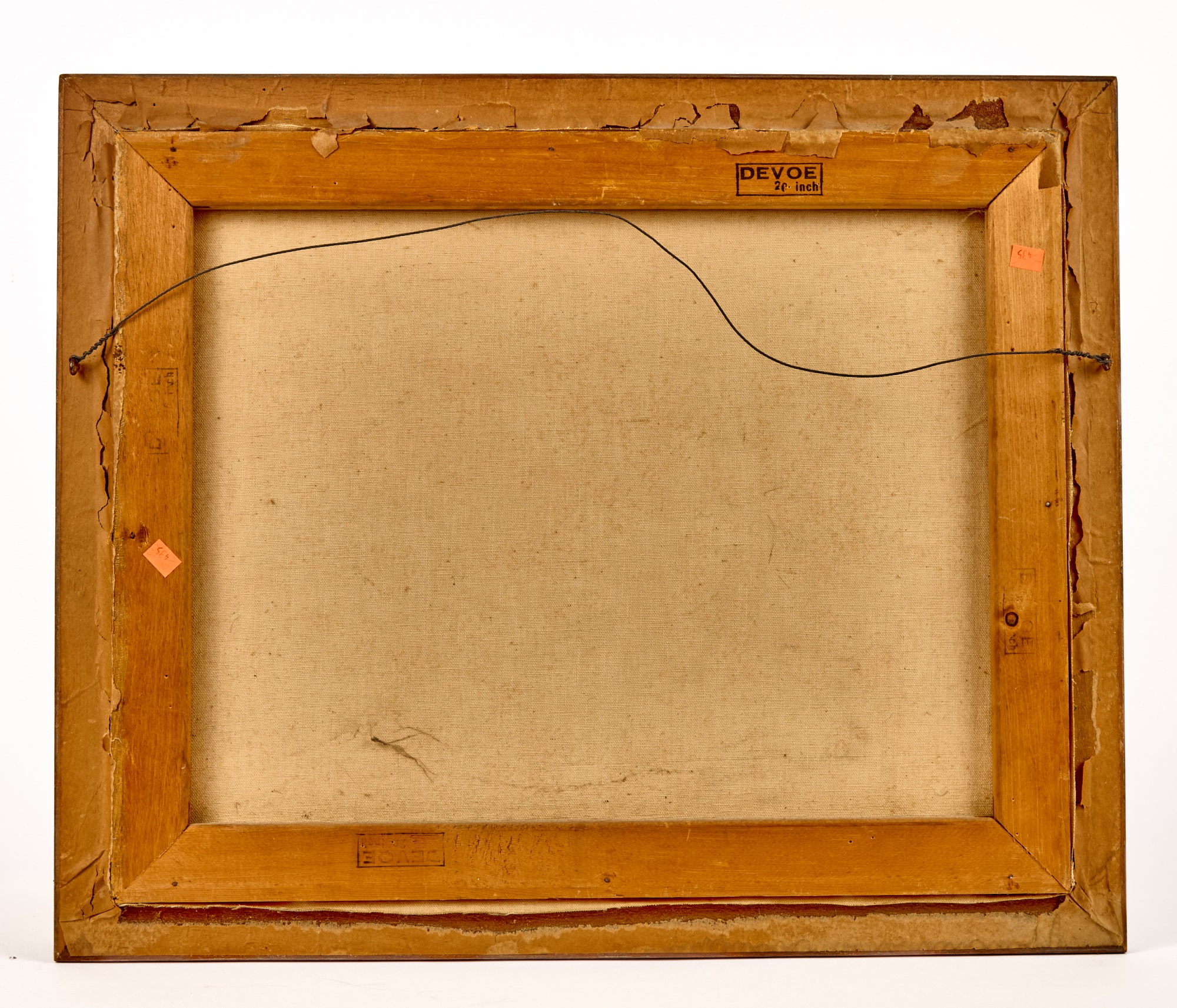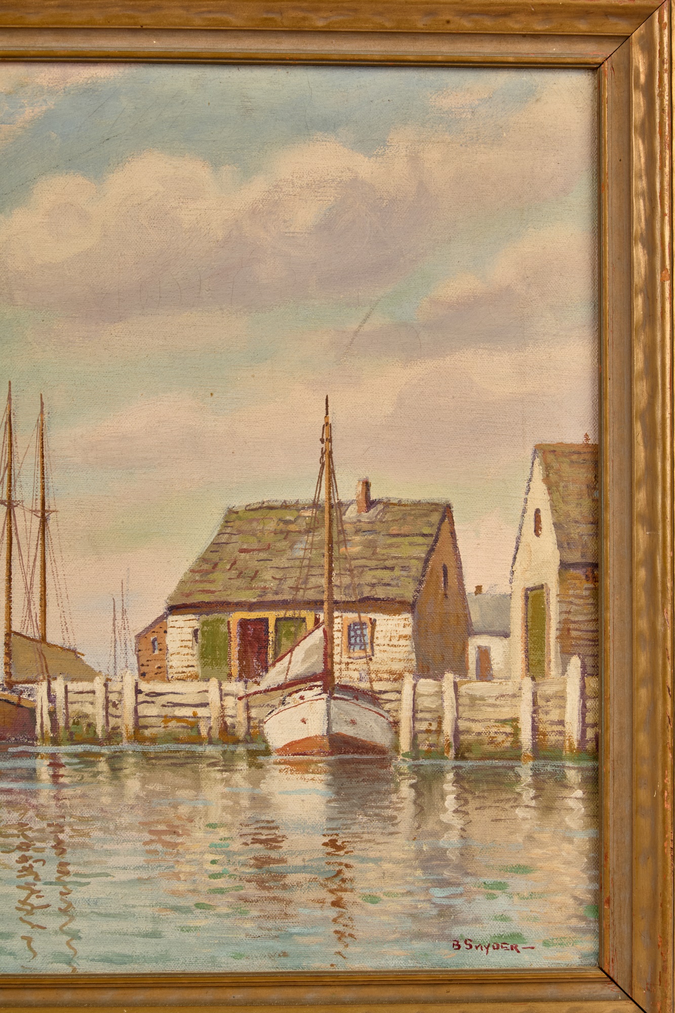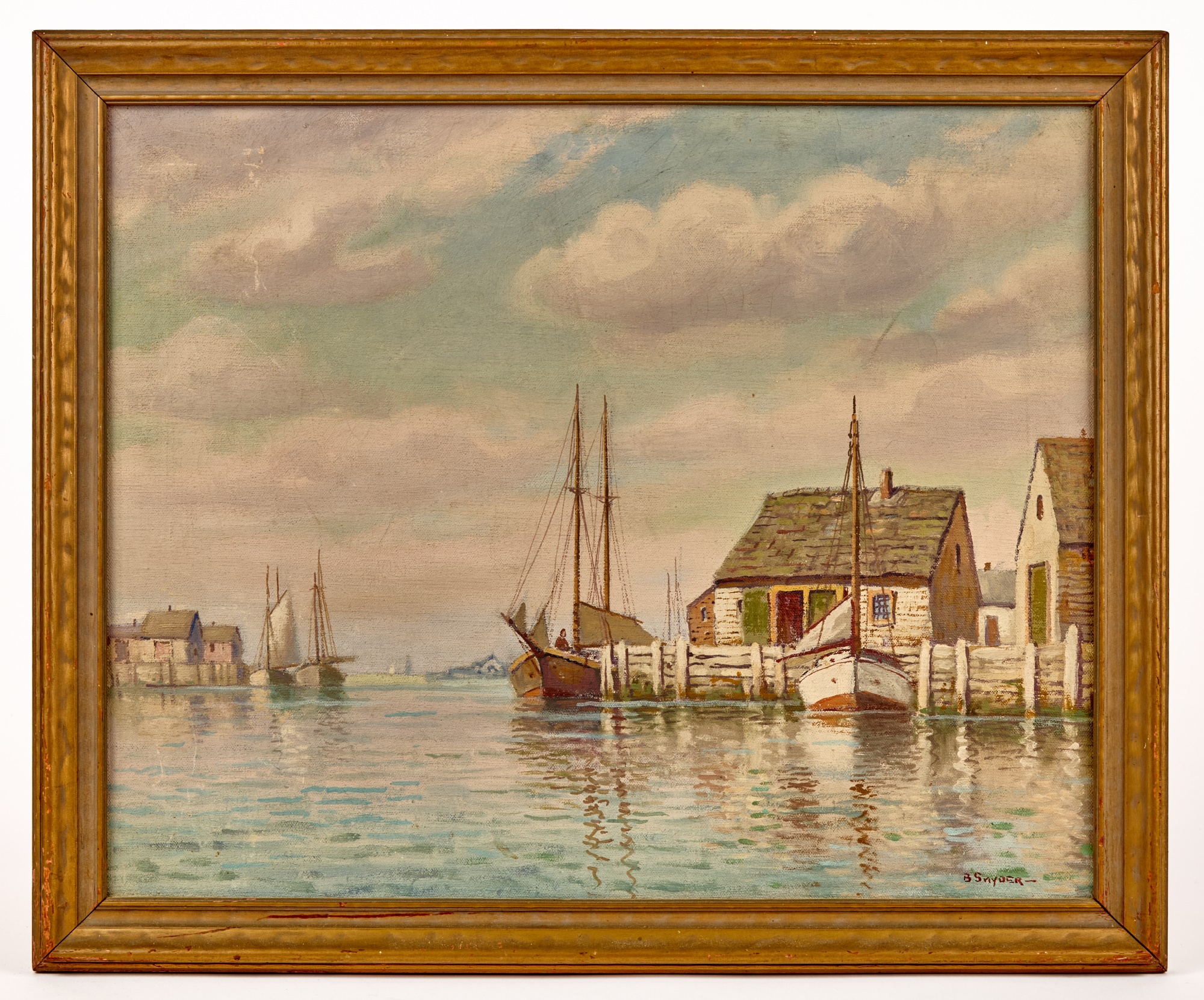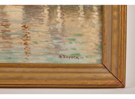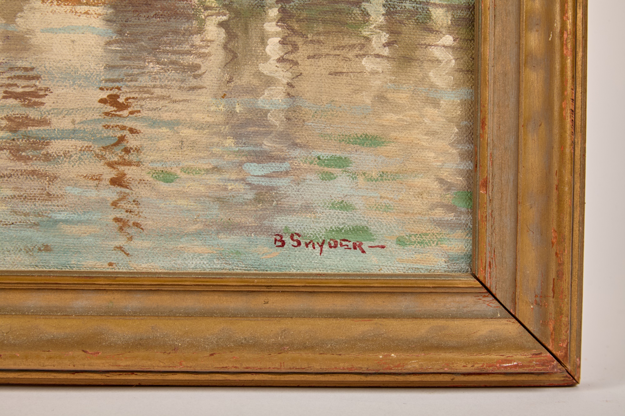 Oil on canvas 19 x 22.5 inches (overall including frame). Painting is signed B. Snyder who is most likely a pseudonym for William Paskell. Condition: Good, light soft abrasions upper left Temp No 6165