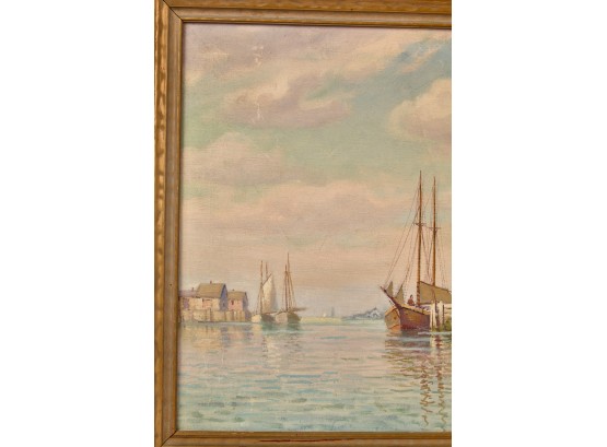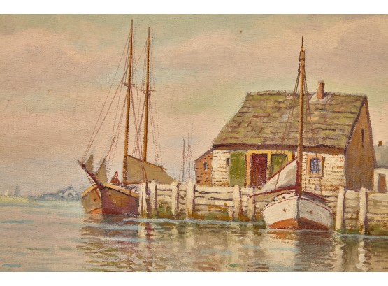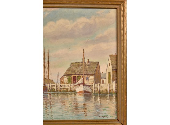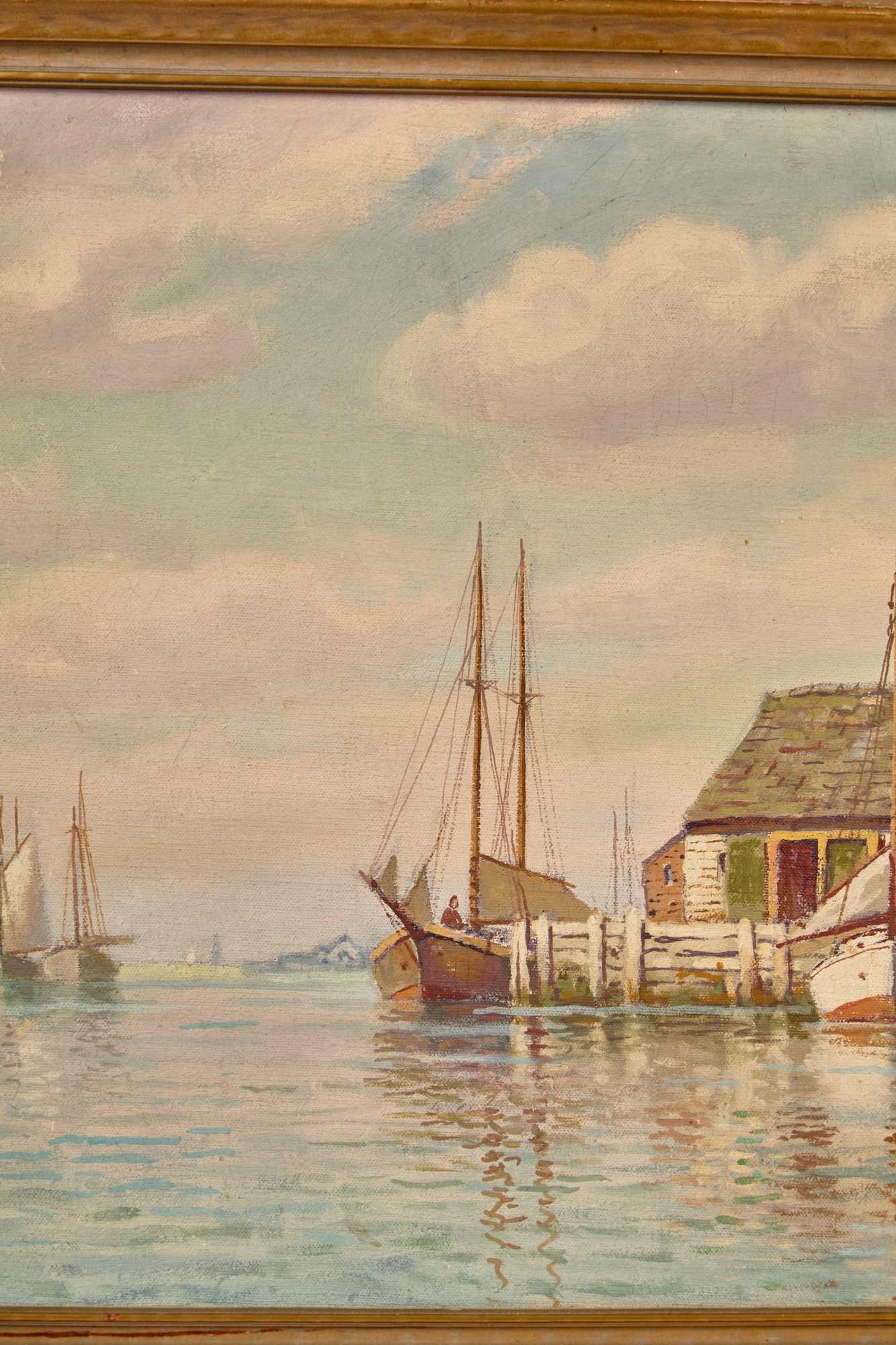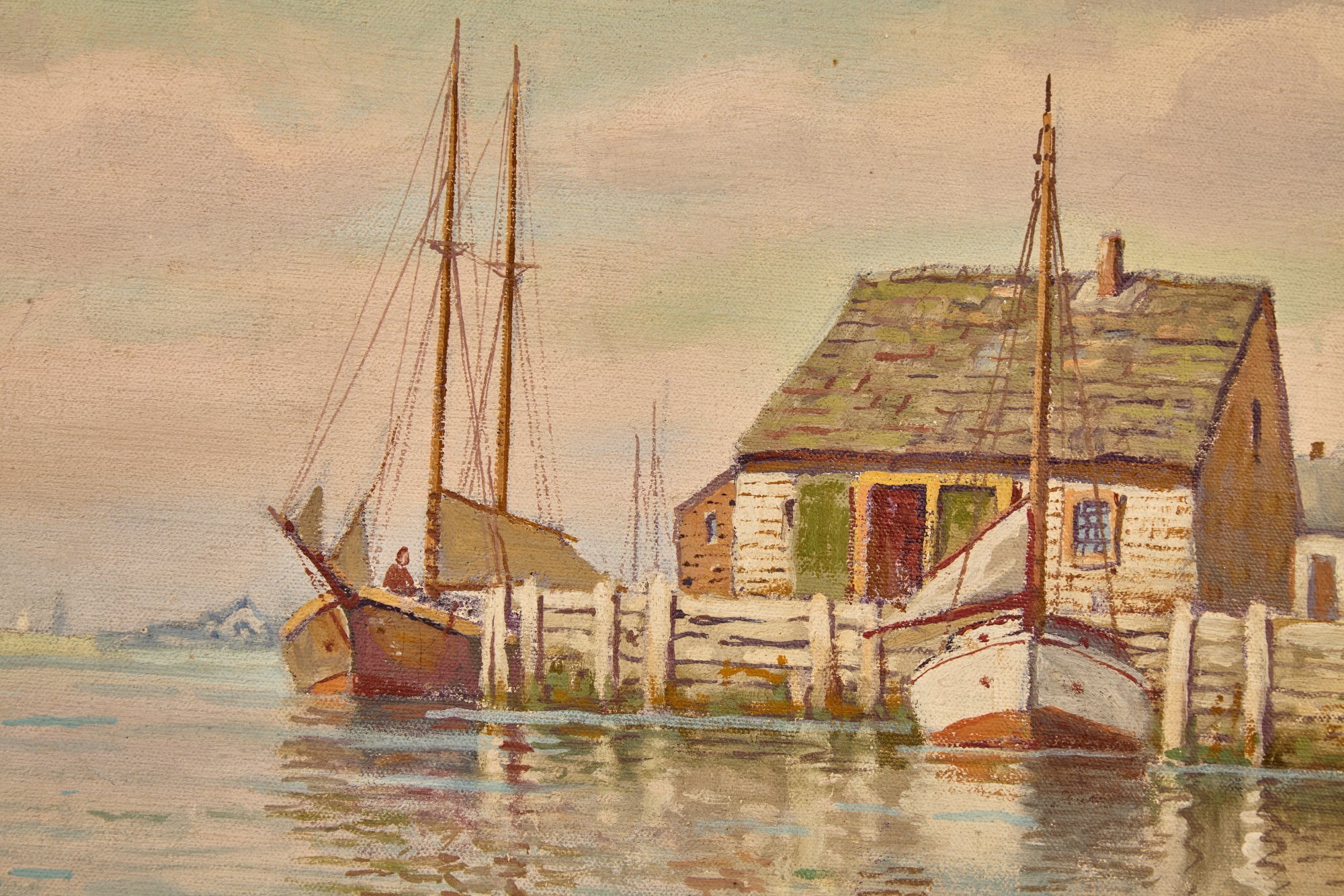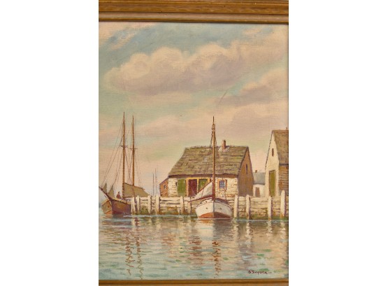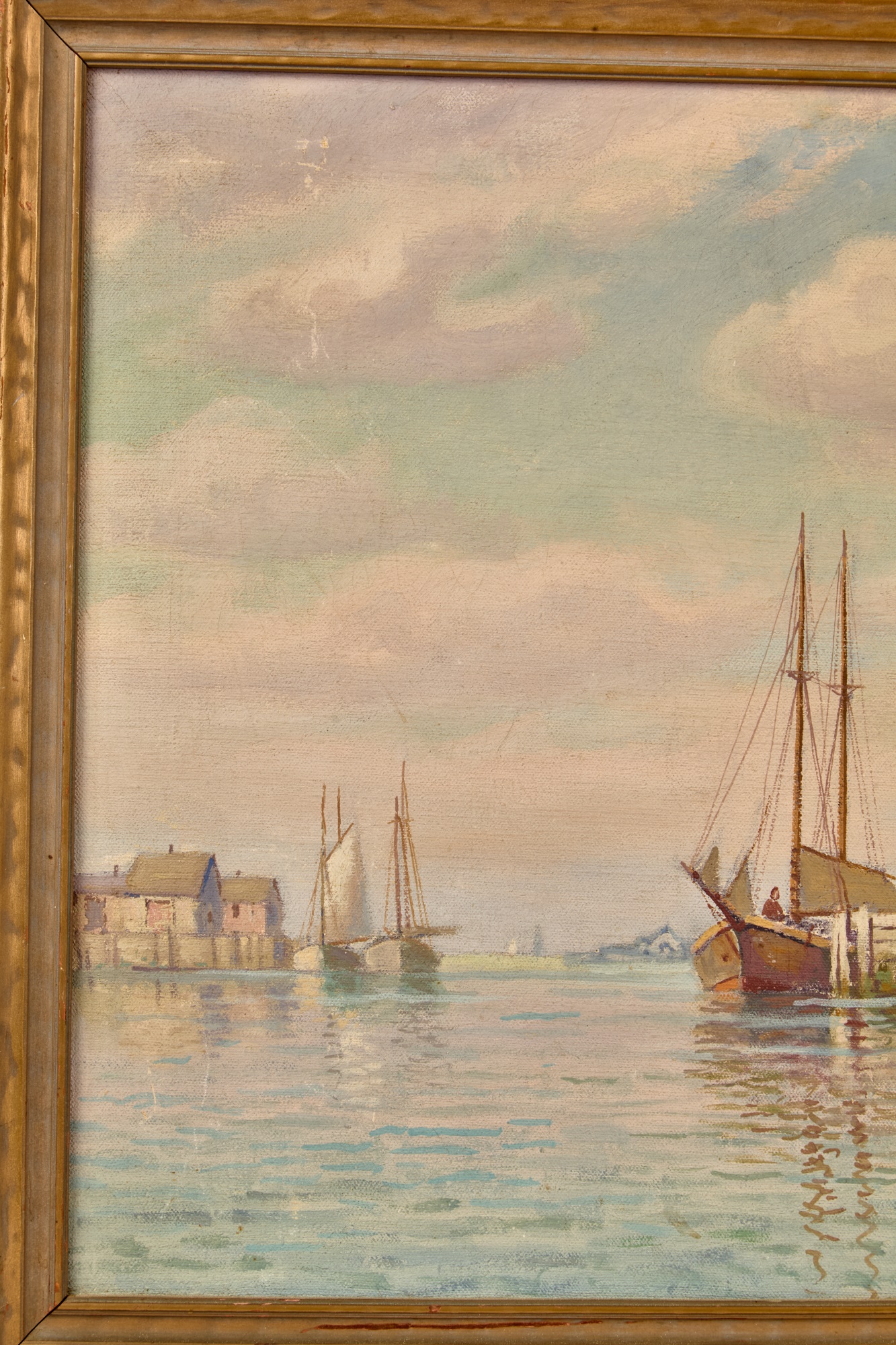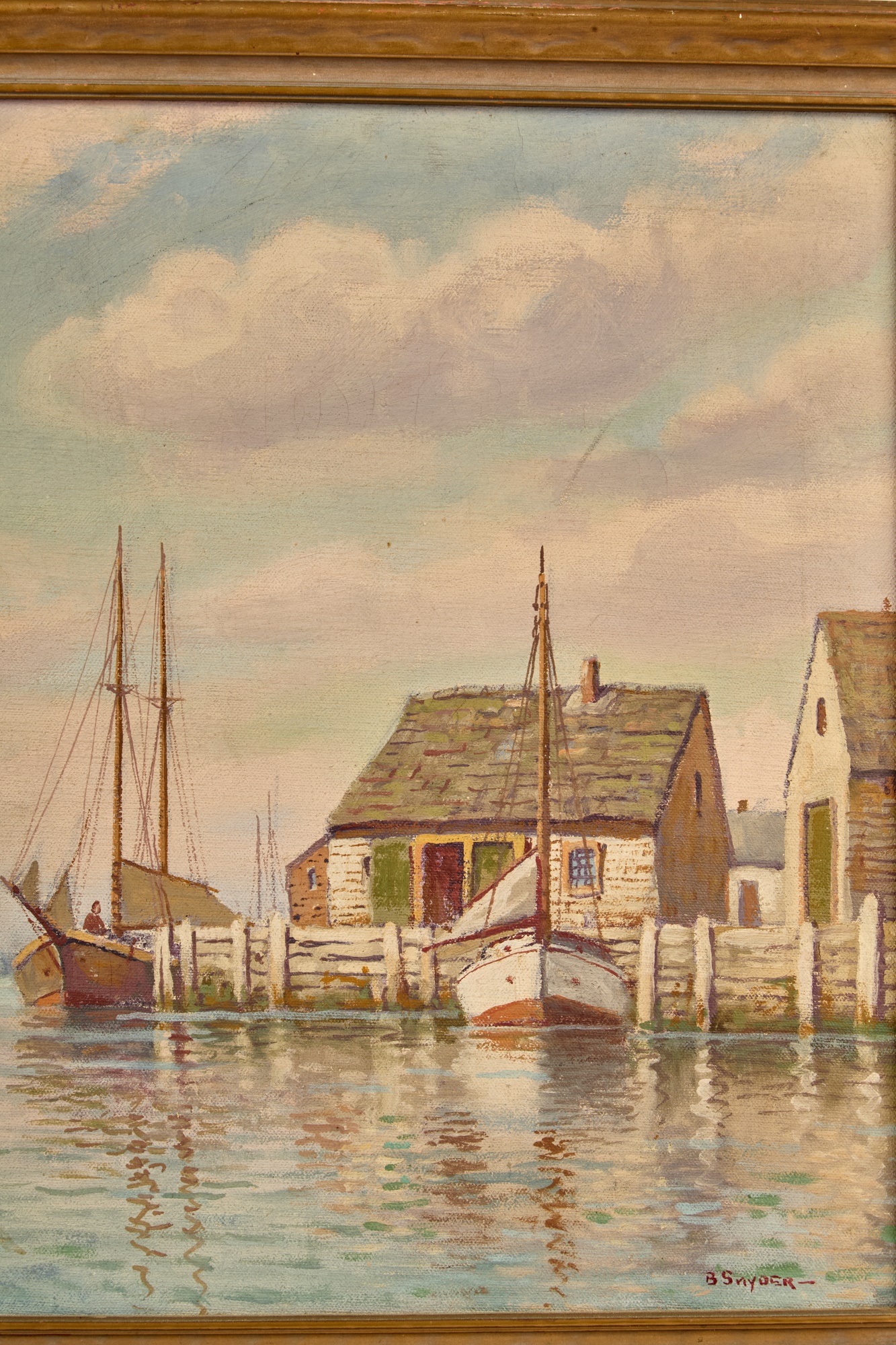 Oil on canvas 19 x 22.5 inches (overall including frame). Painting is signed B. Snyder who is most likely a pseudonym for William Paskell. Condition: Good, light soft abrasions upper left Temp No 6165
