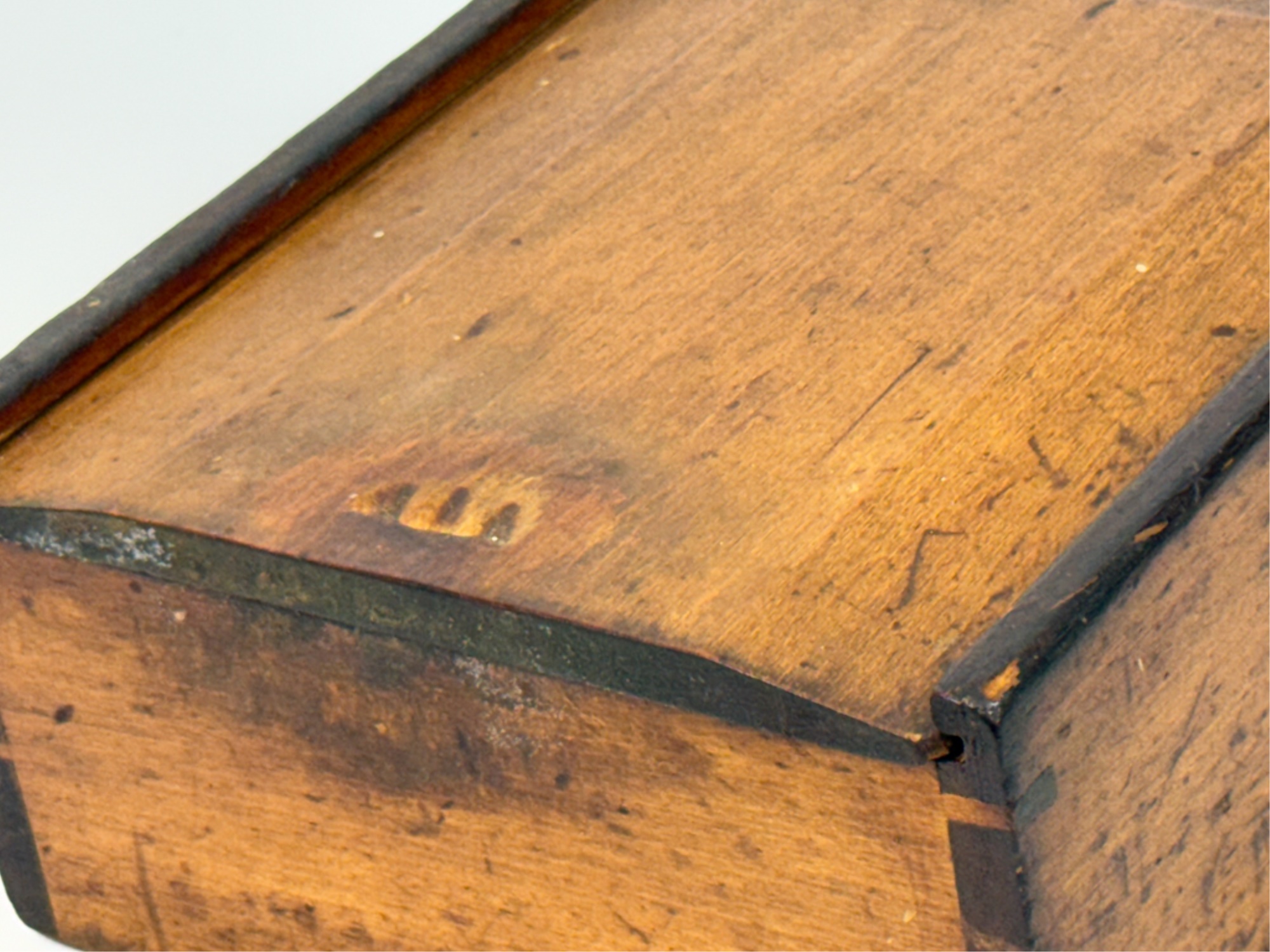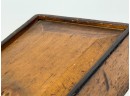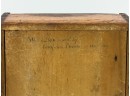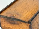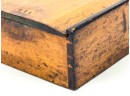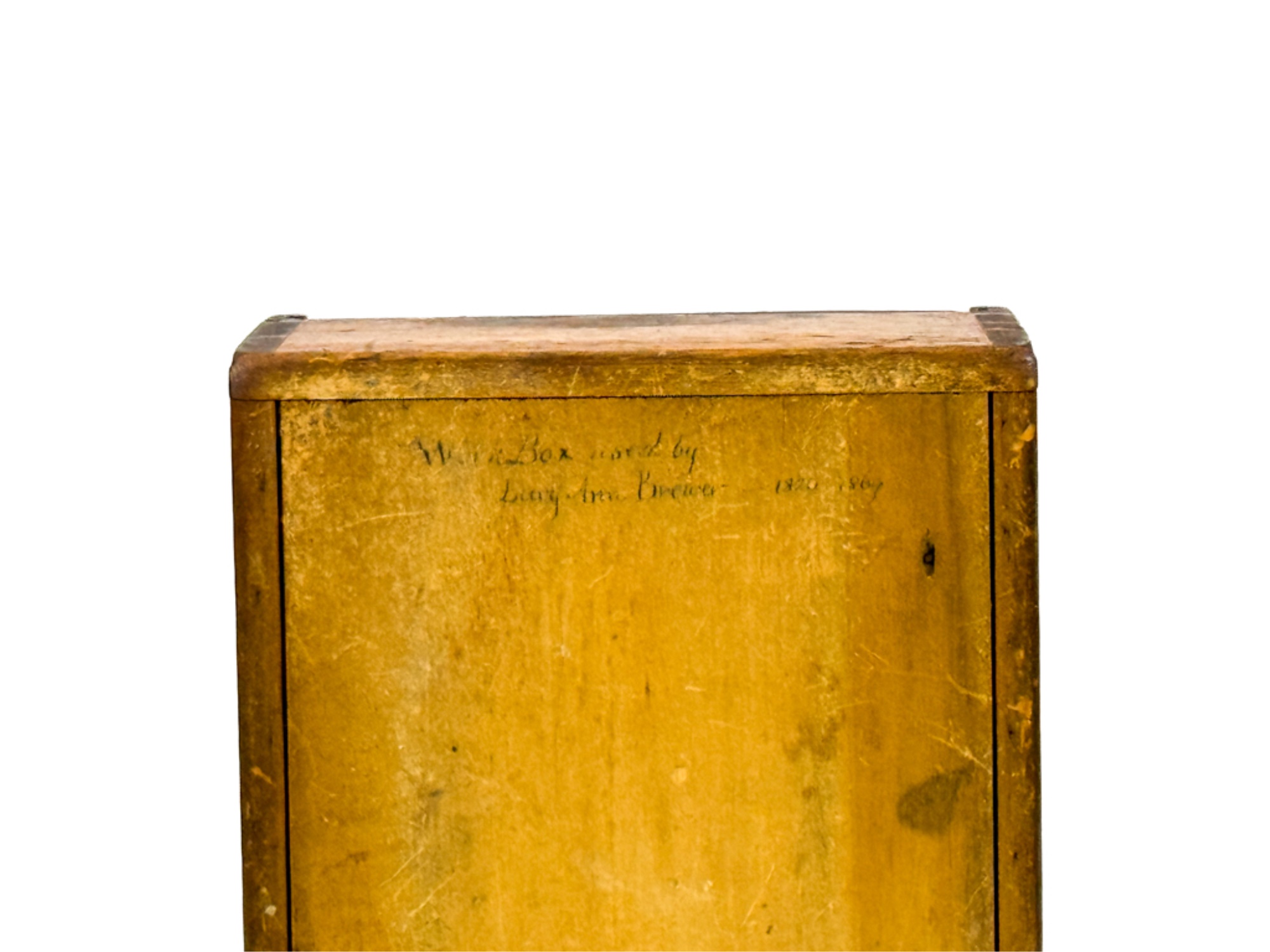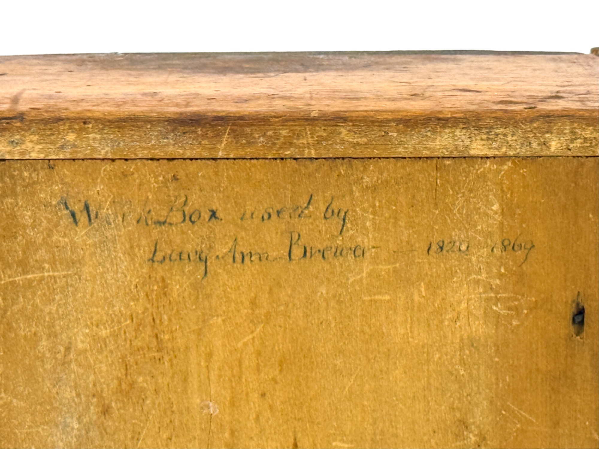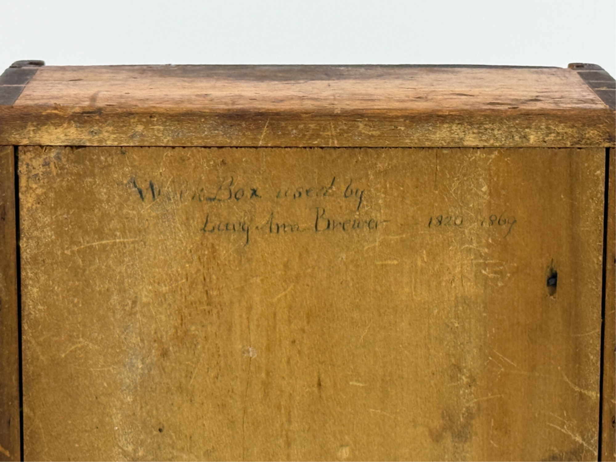 Dovetailed and pine slid top box with "Work box used by Lucy Ann Brewer 1820-1869" written in pencil on bottom. 4 x 10 x 8 inches. Condition: Age expected wear.