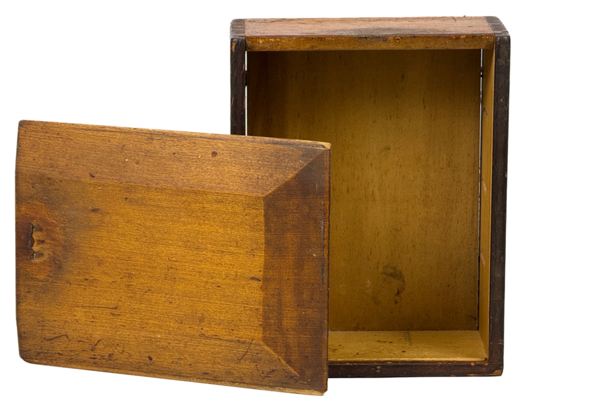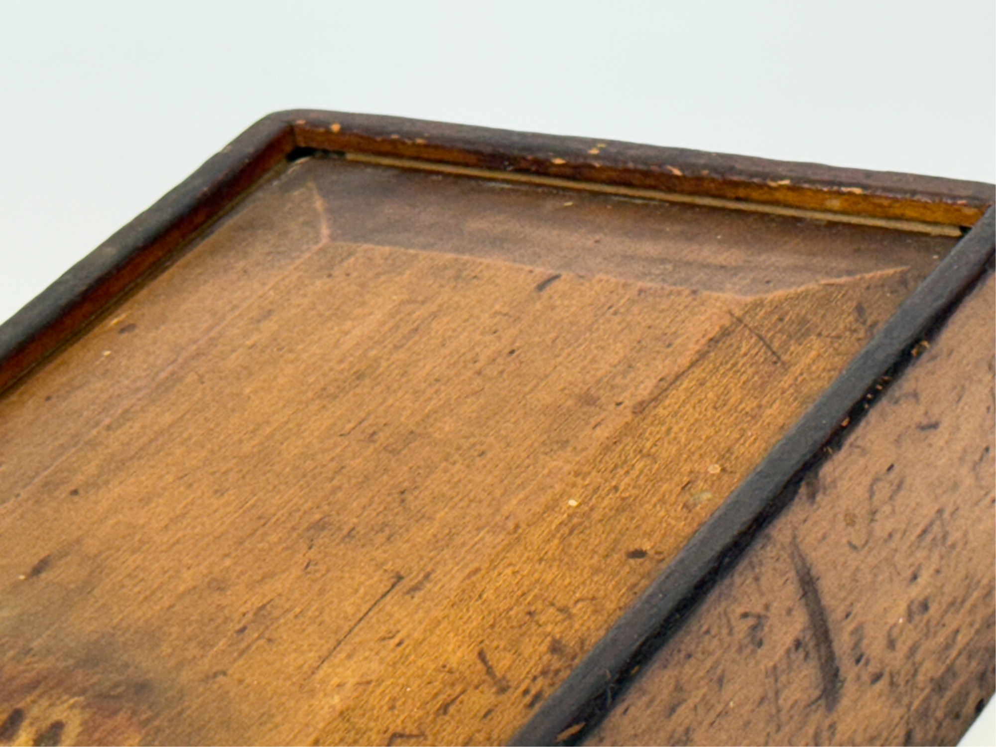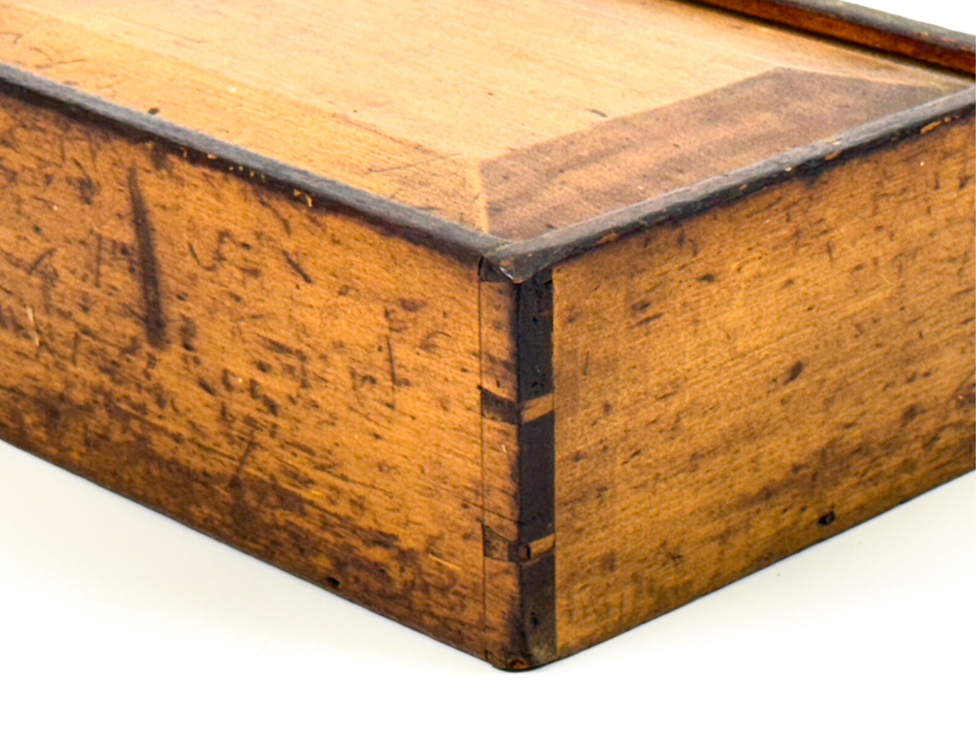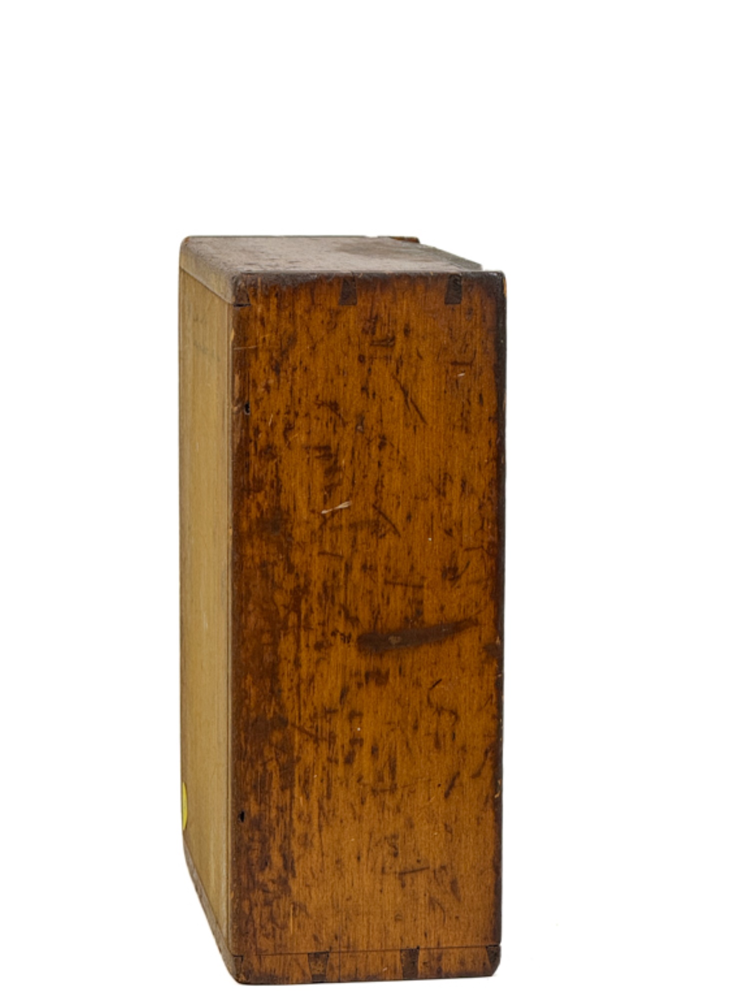 Dovetailed and pine slid top box with "Work box used by Lucy Ann Brewer 1820-1869" written in pencil on bottom. 4 x 10 x 8 inches. Condition: Age expected wear.