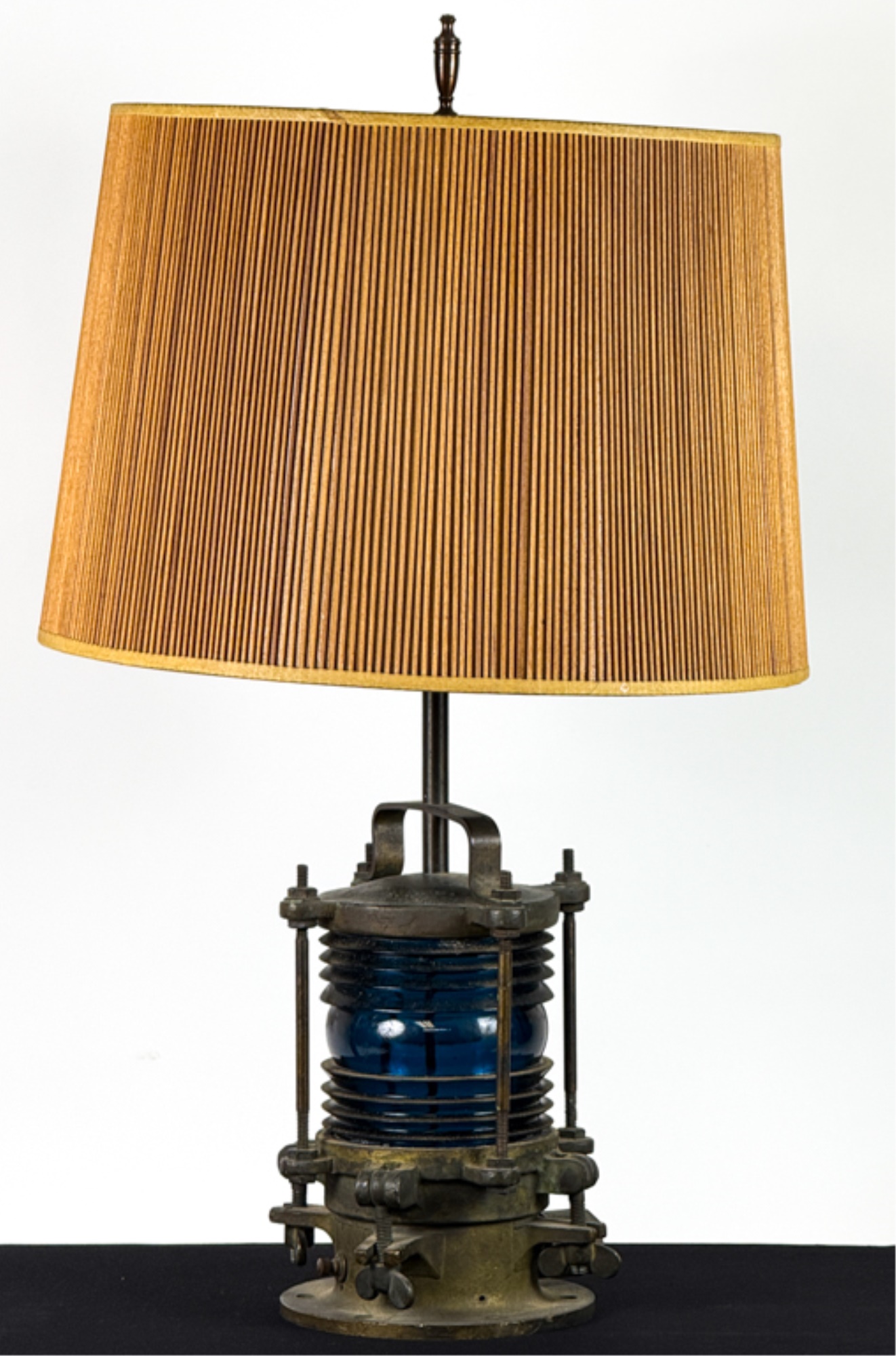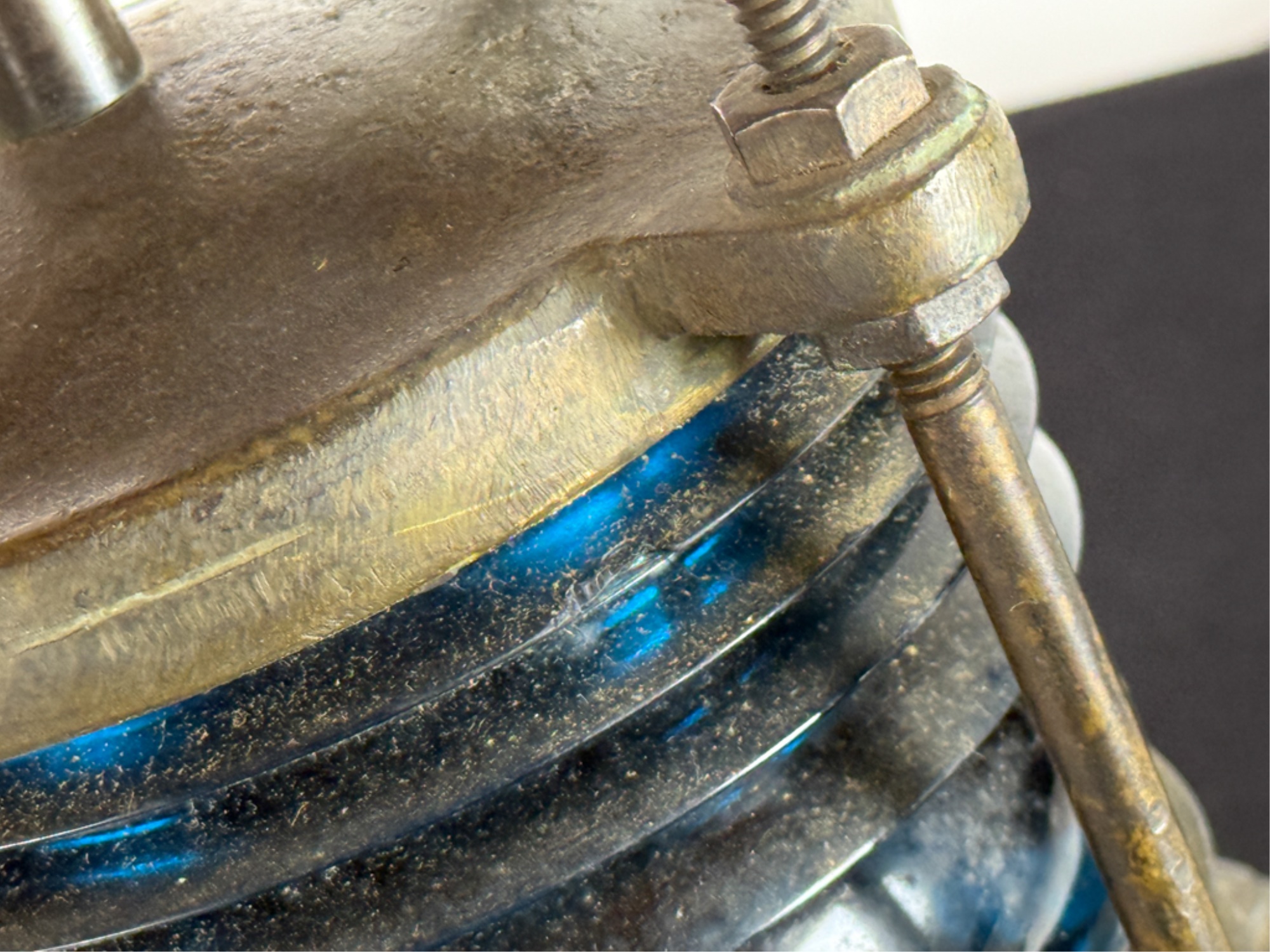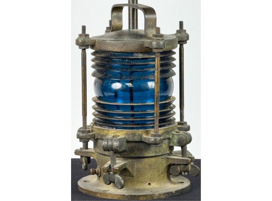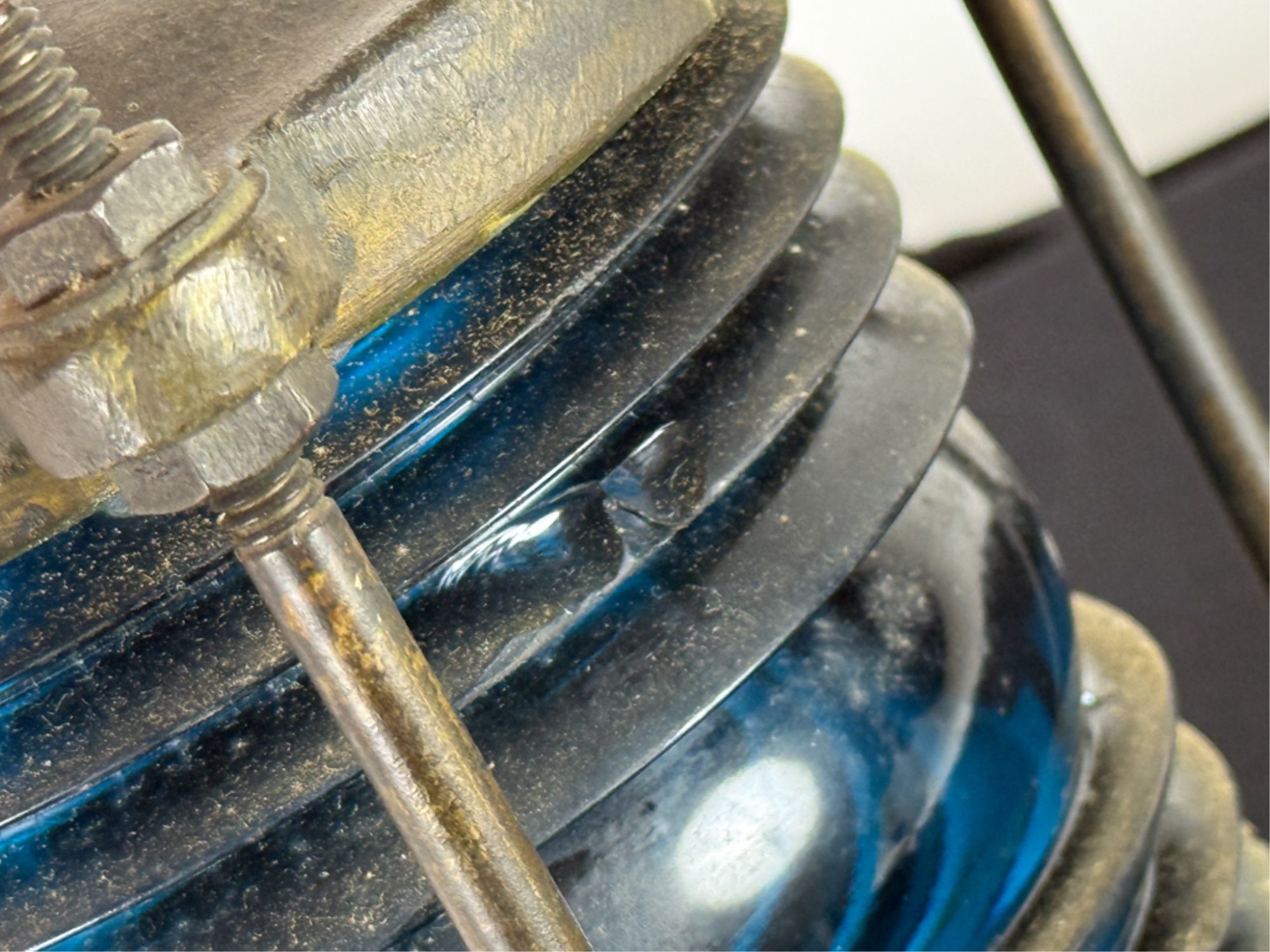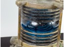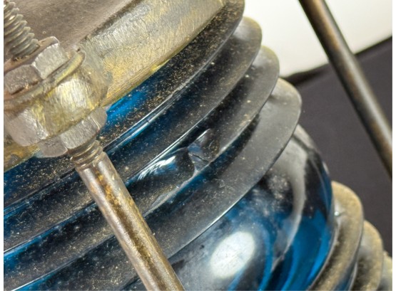 With blue lens. Converted to table lamp. 25 inches to top of finial. Condition: Electrified. Chips to lens. Needs rewire. Temp No 49a