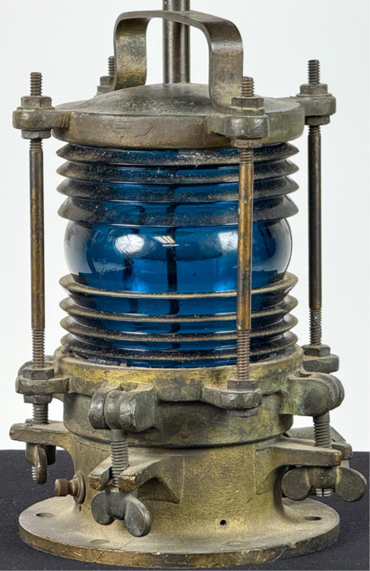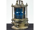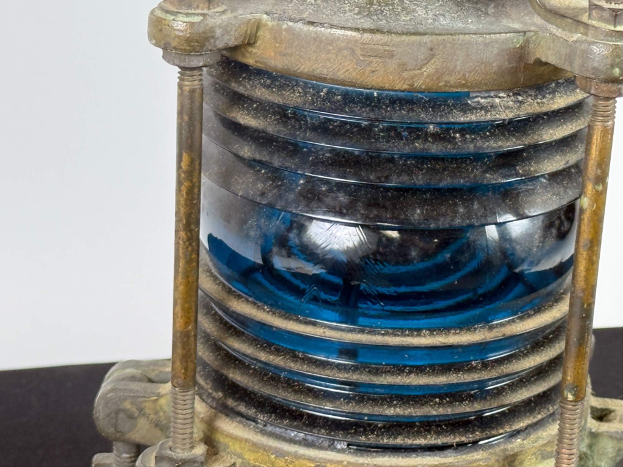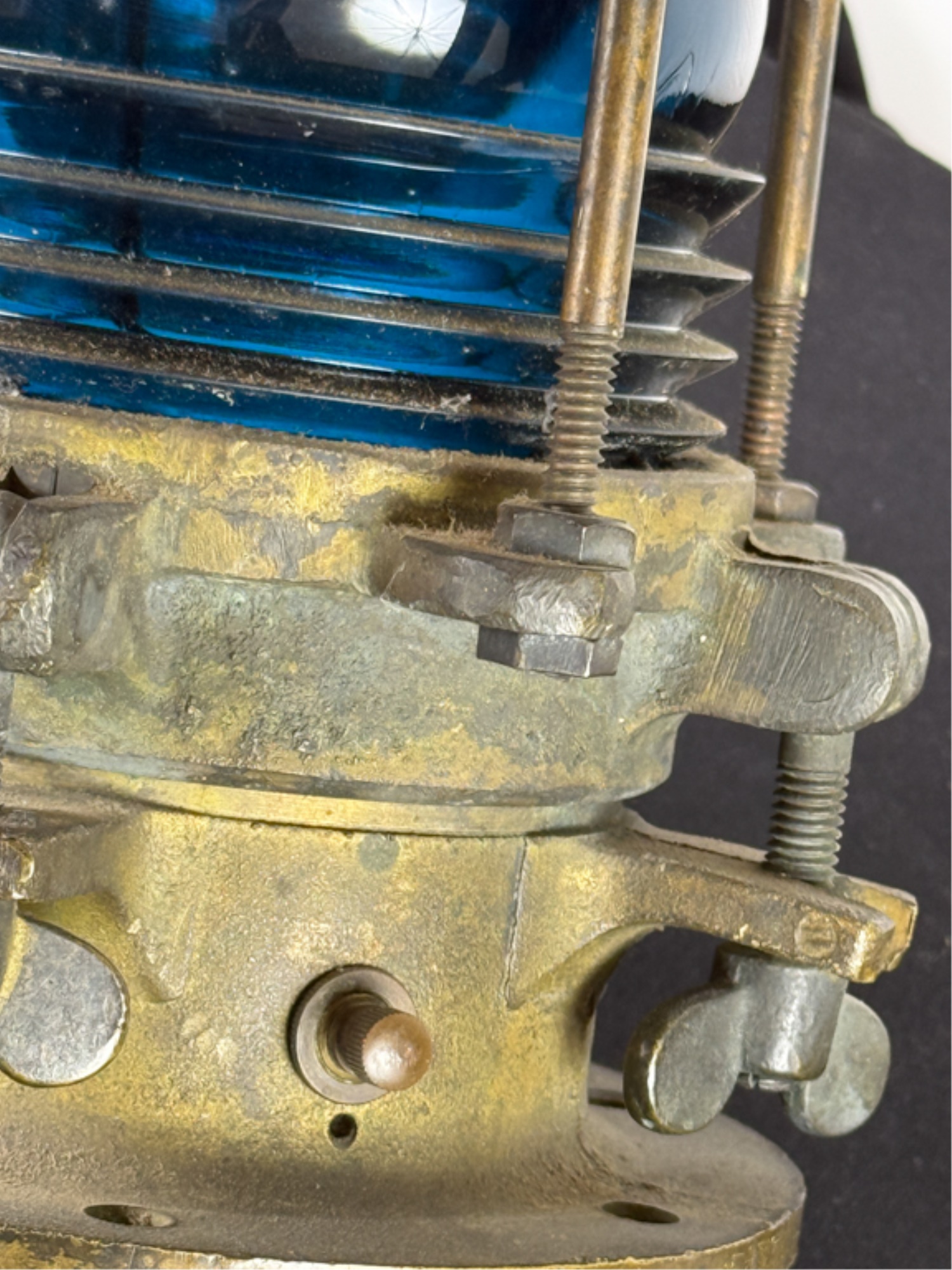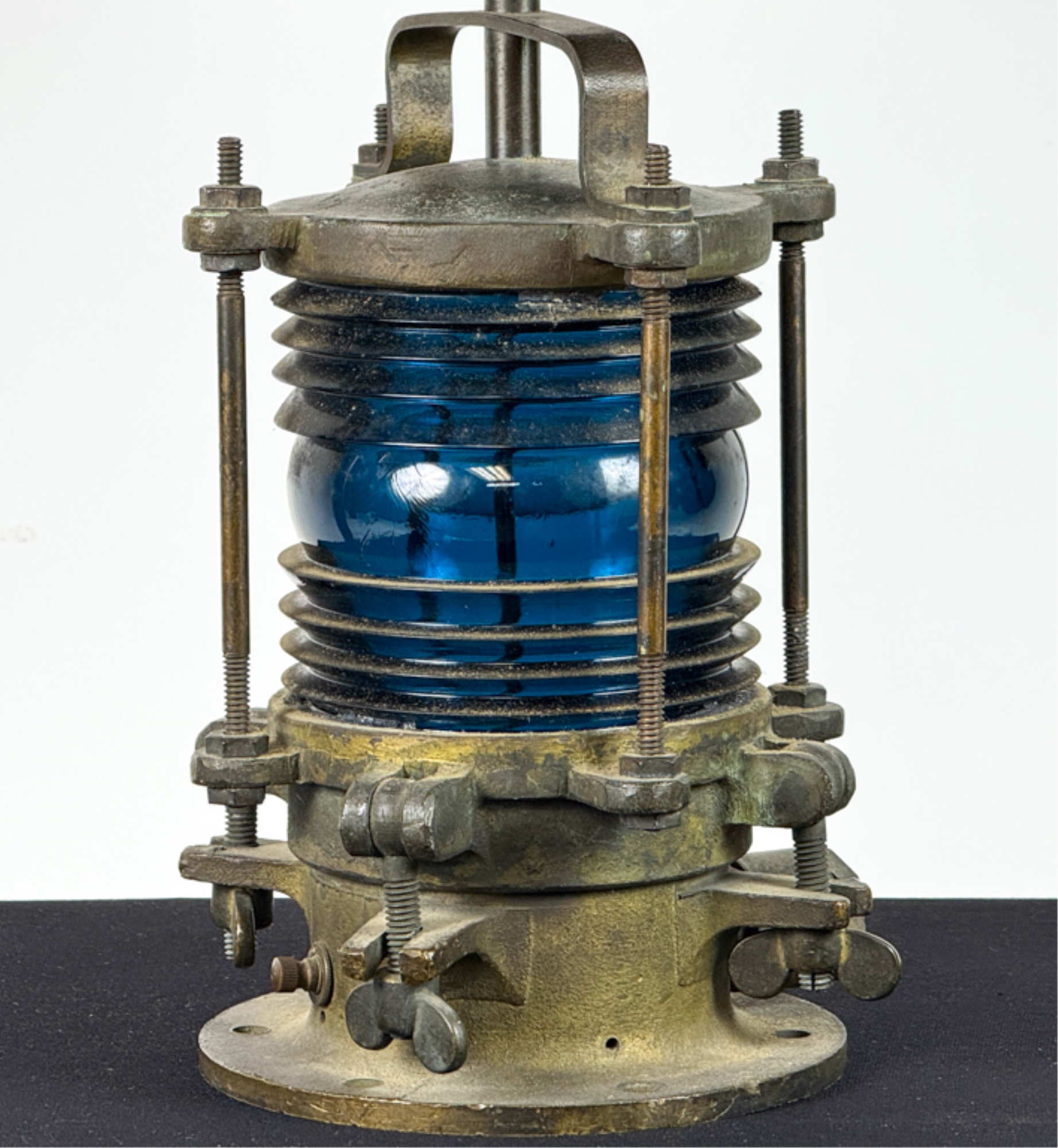 With blue lens. Converted to table lamp. 25 inches to top of finial. Condition: Electrified. Chips to lens. Needs rewire. Temp No 49a