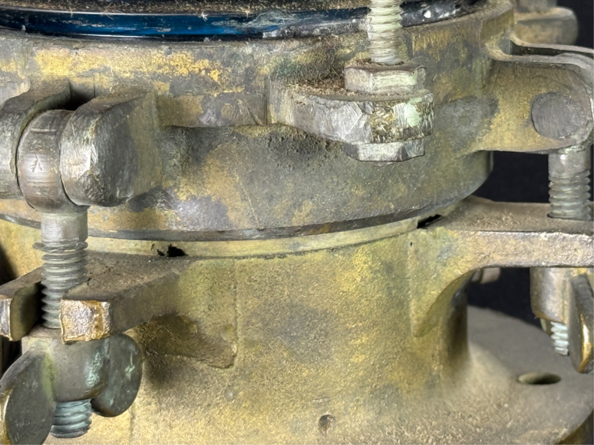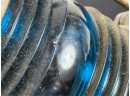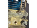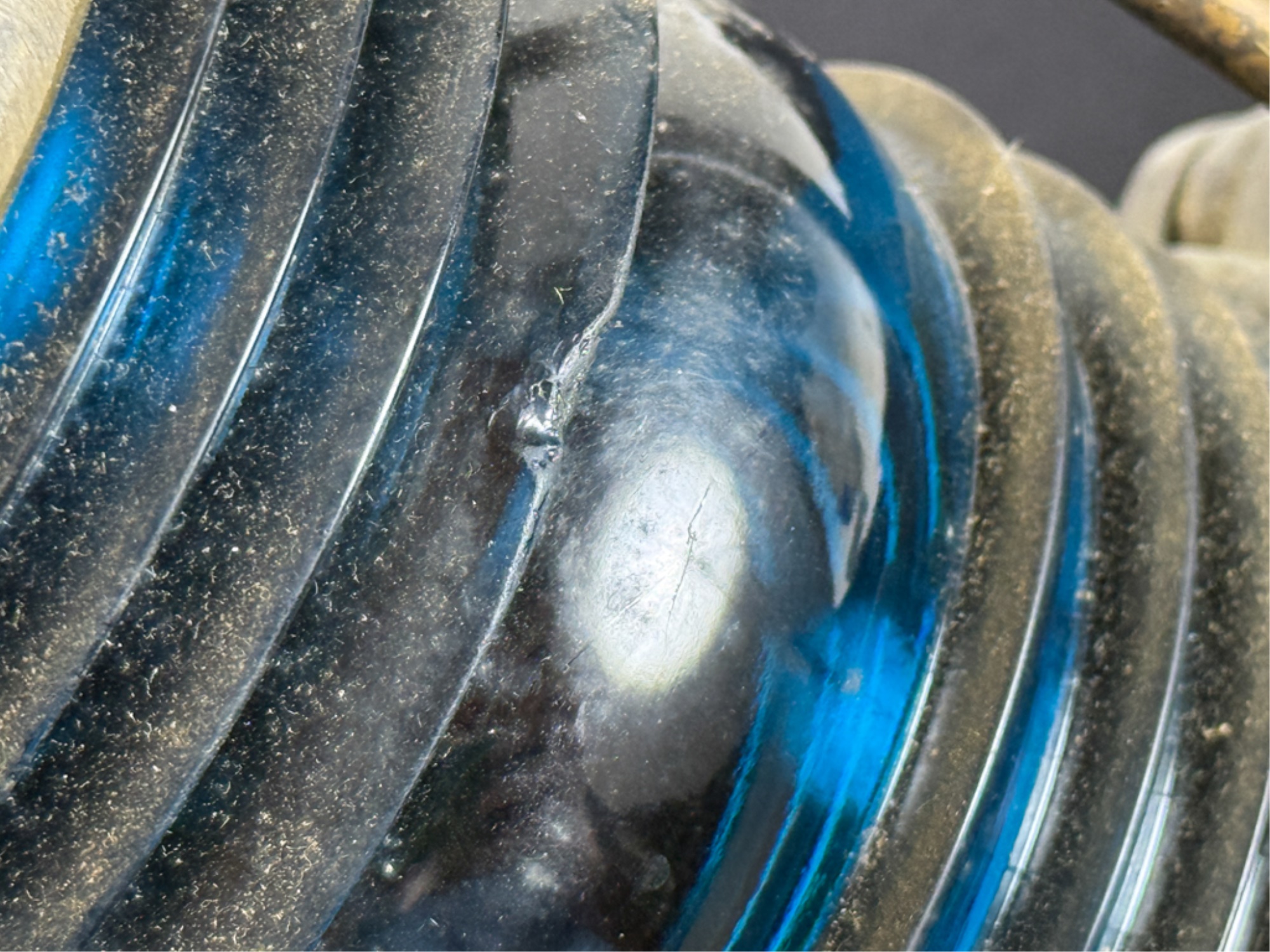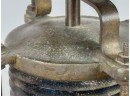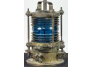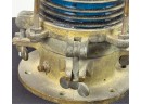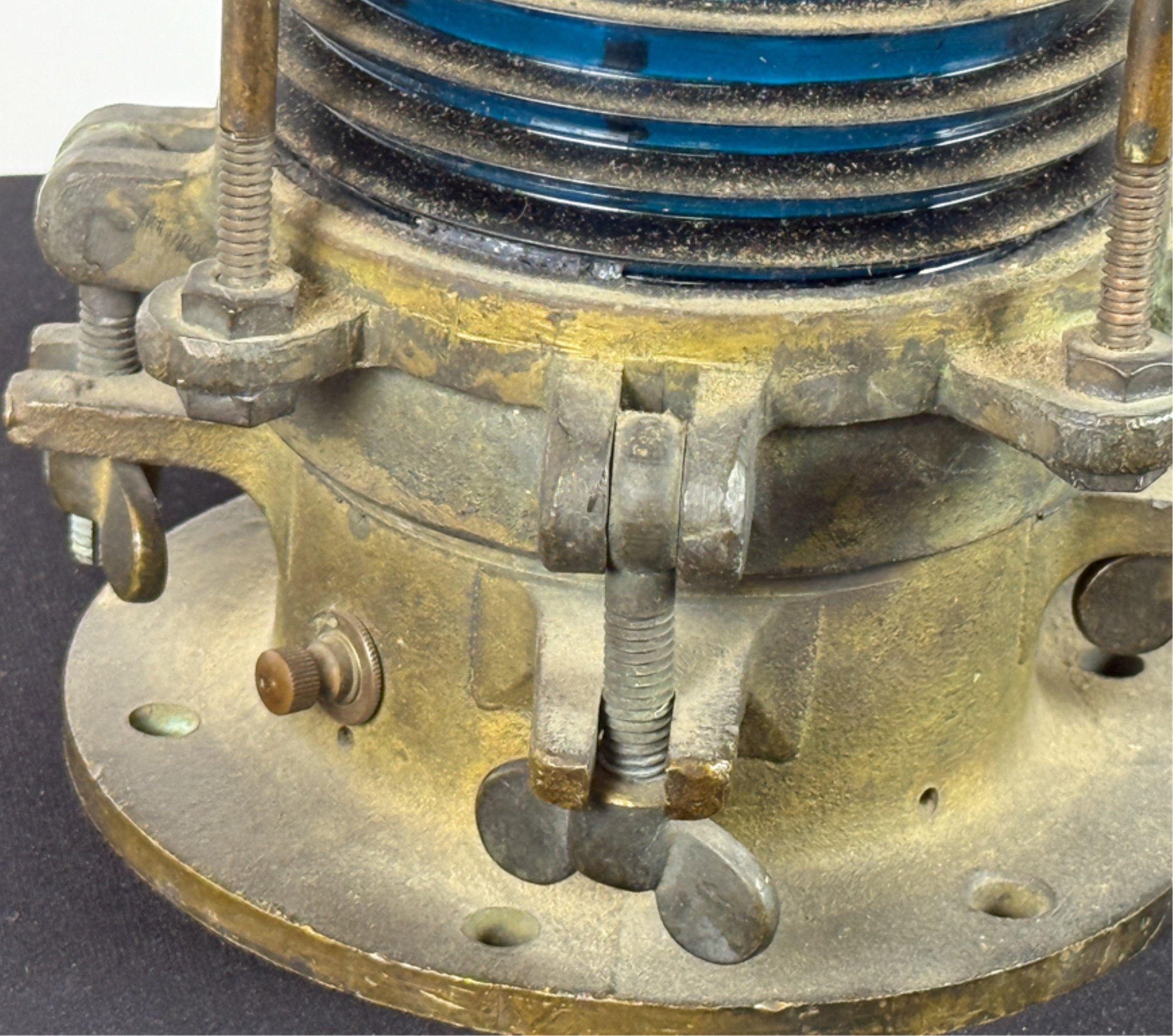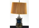 With blue lens. Converted to table lamp. 25 inches to top of finial. Condition: Electrified. Chips to lens. Needs rewire. Temp No 49a