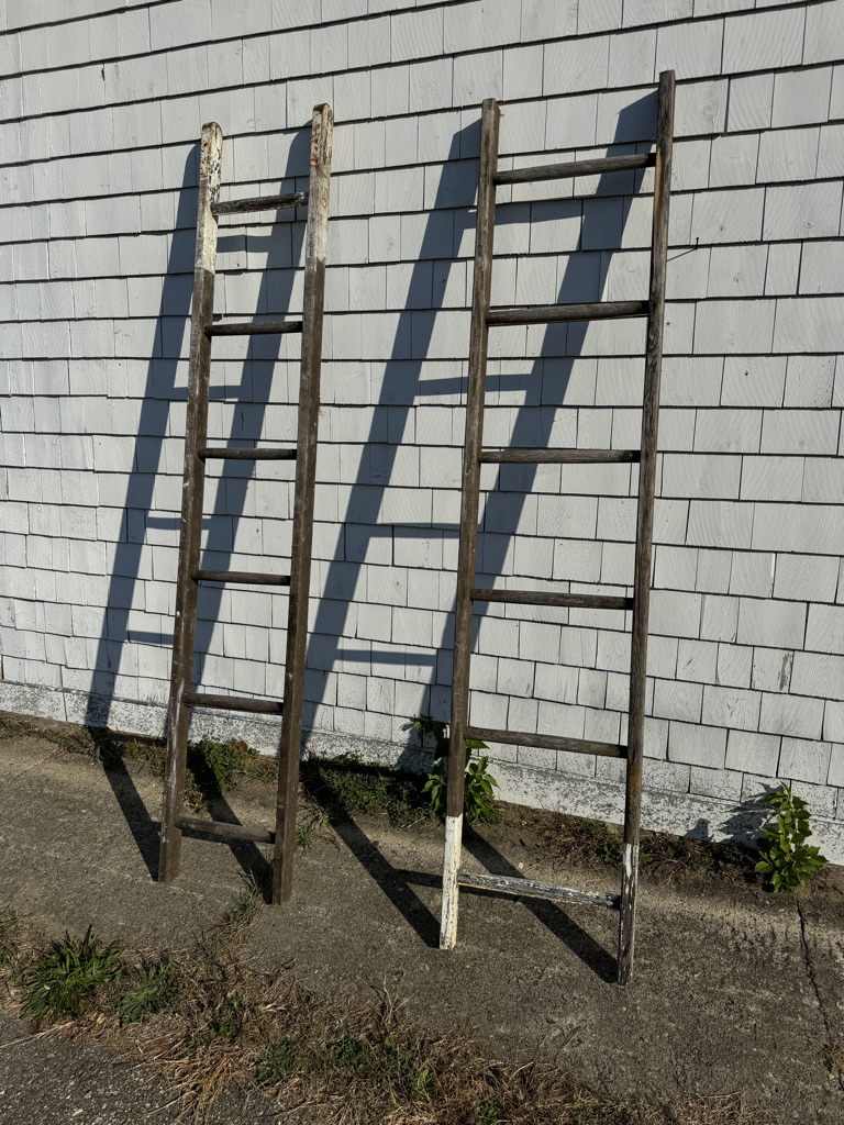 2 old wooden ladders for decoration one is 86" tall 15 1/2" wide and 2 1/2" deep the other 84" long 18 1/2" wide and deep2 1/2" .They are made of wood so can be cut to fit easily