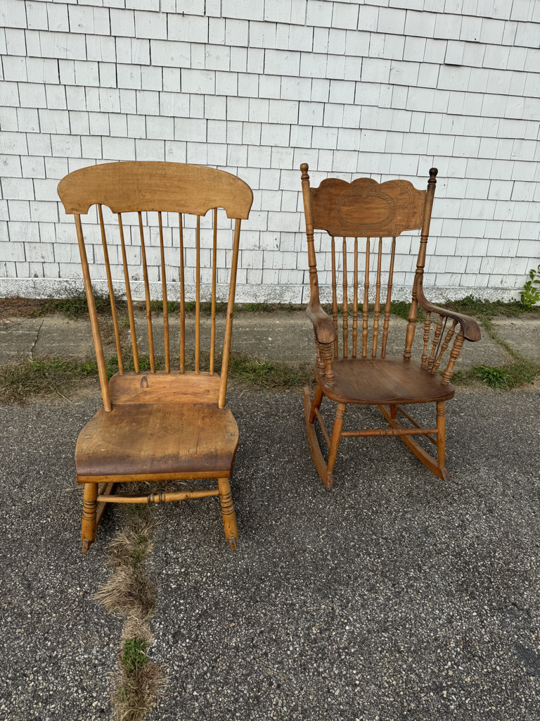 1 pressback arm rocking chair and a early rocking chair that was used as a nursing rocker
