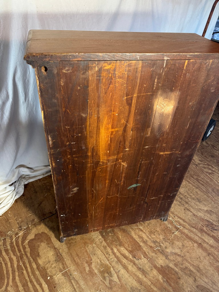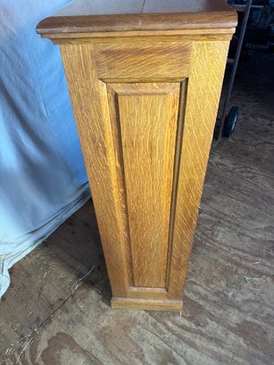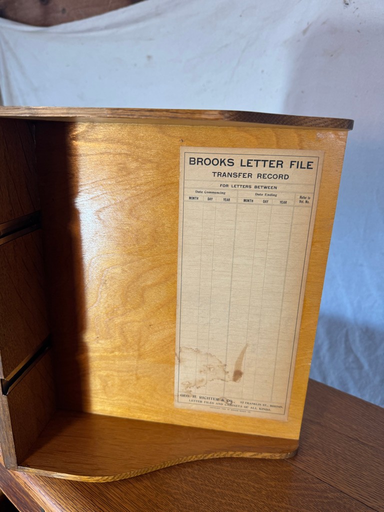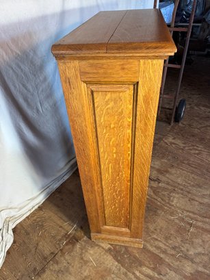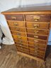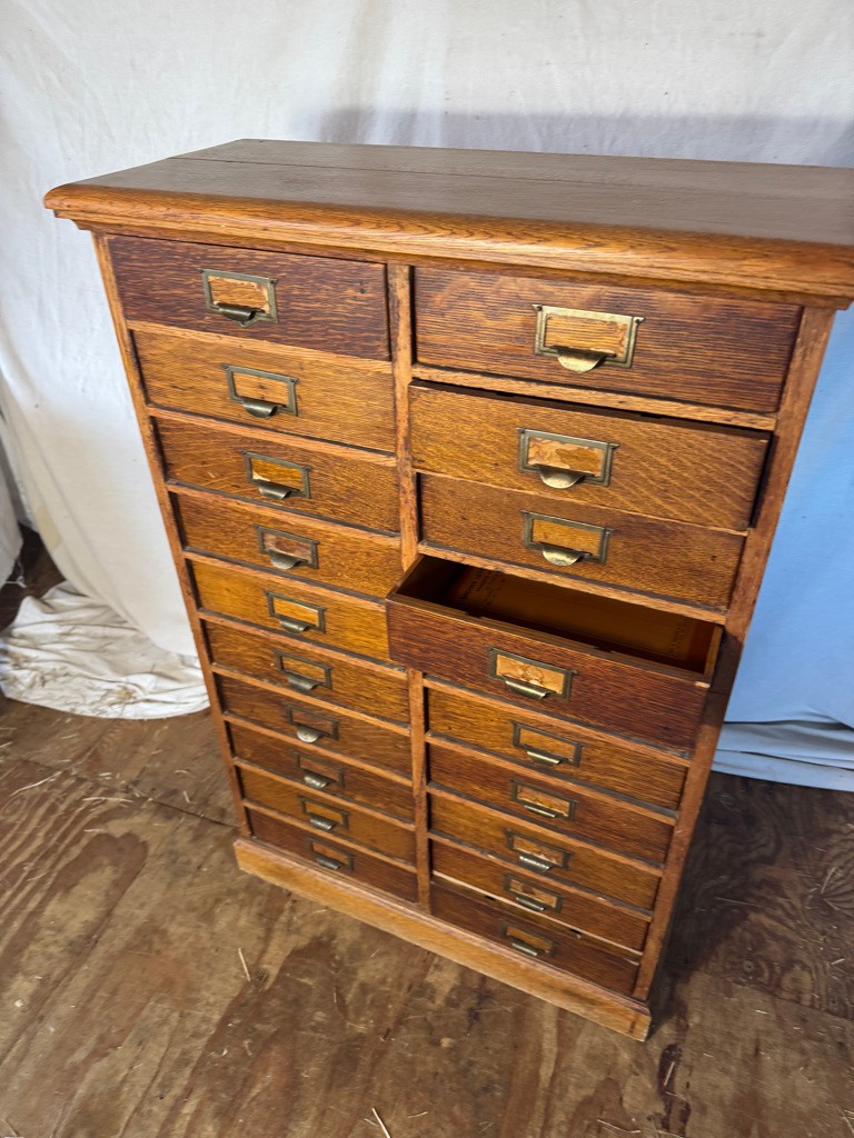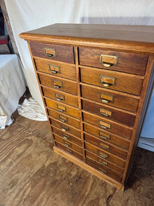 20 Drawer quartered oak cabinet with raised panel sides . Has label in drawer Brooks letter file . Nice cabinet that has many possible uses .