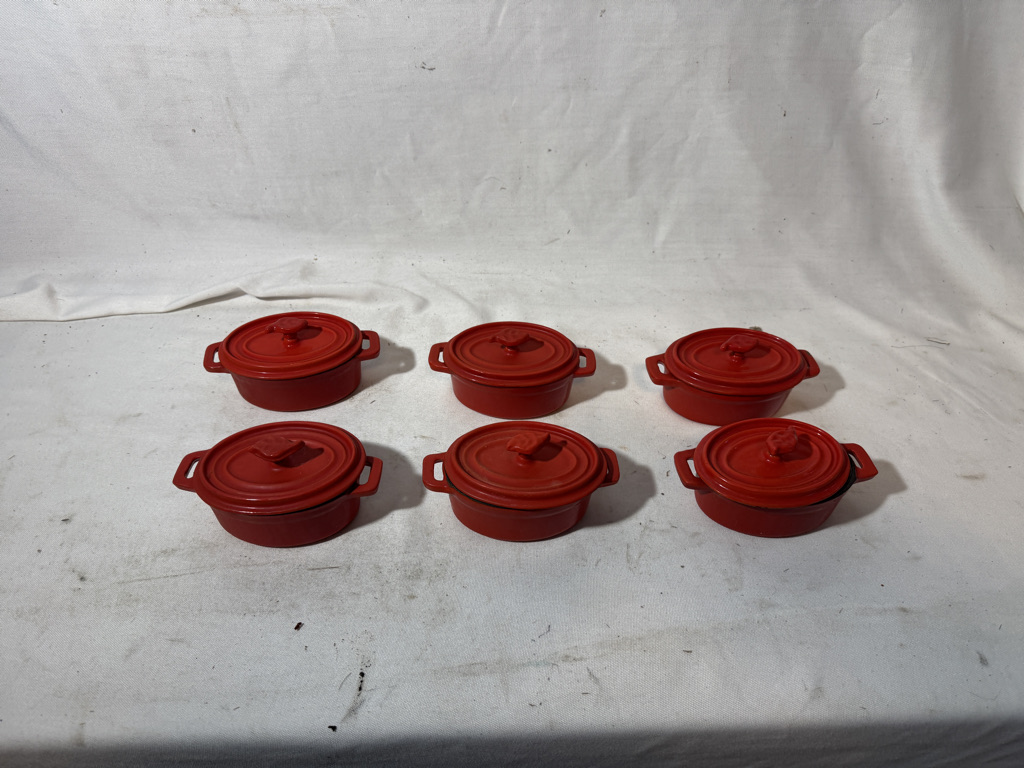 6 covered casserole dishes red enamel cast iron 6 1/2" long 4" deep and 3 1/4"tall .