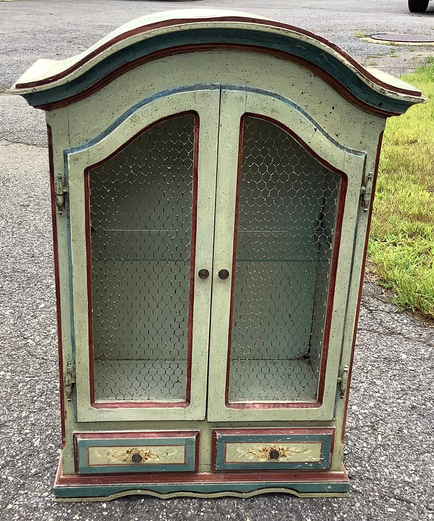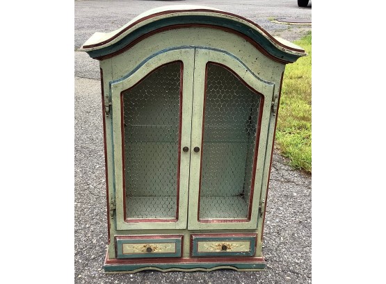 Very attractive small table top paint decorated curio cabinet . The 2 doors with wire instead of of glass open to an interior light at top of cabinet. Cabinet is set up to also be hung on the wall.Cabinet has has 2 small drawers in the base. Piece is not old but very attractive Piece is 28 1/2" tall by 20" wide and 8" deep Good condition