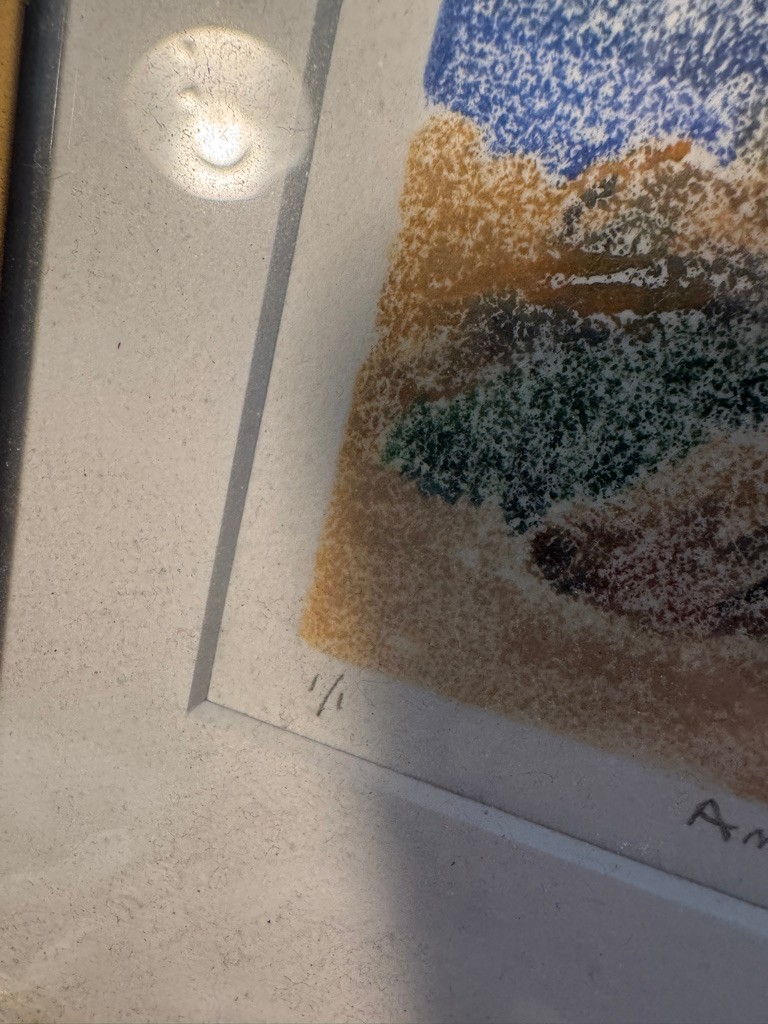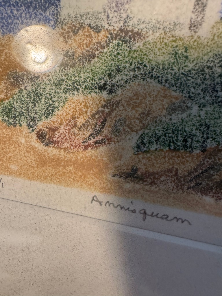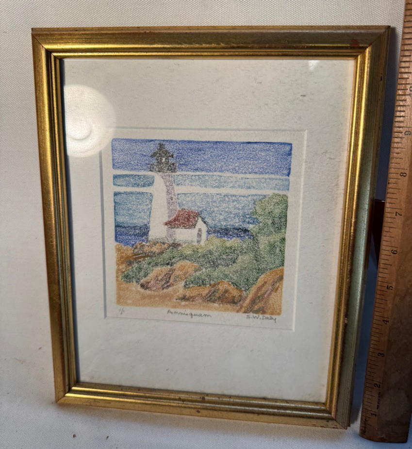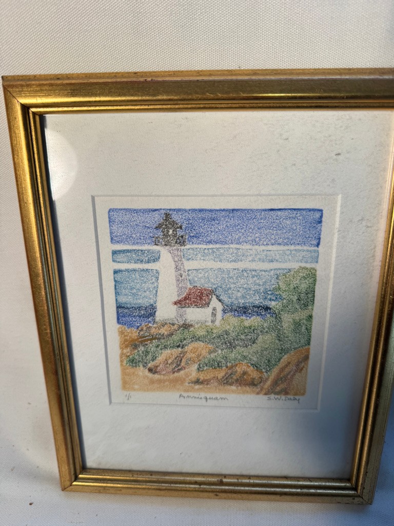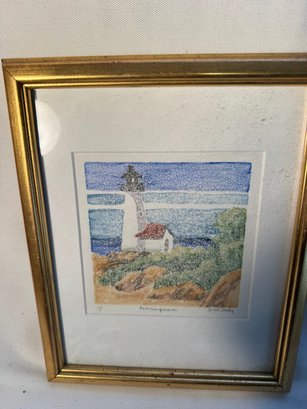 A Monotype by Susan Daly of a Annisquam lighthouse scene 5 1/2" x 5 1/2". See photos