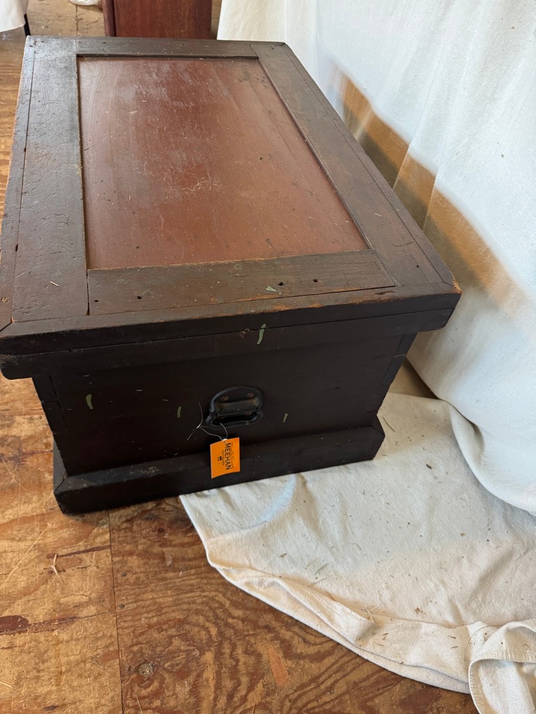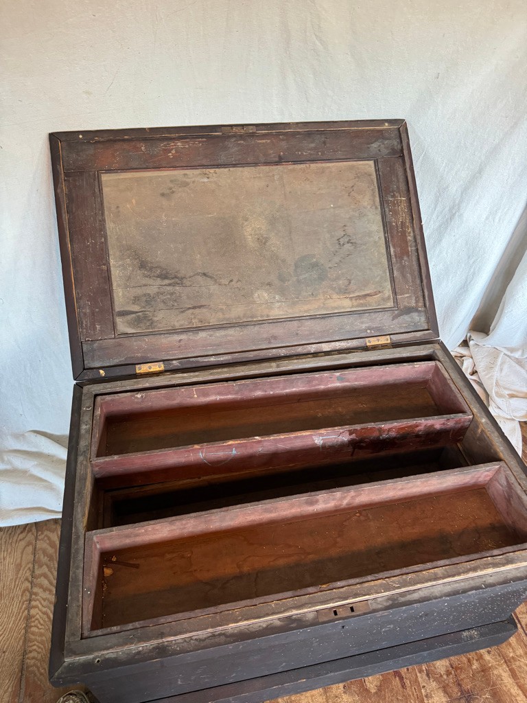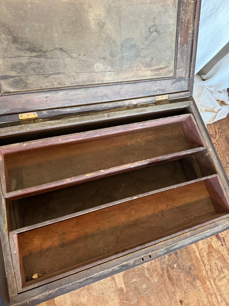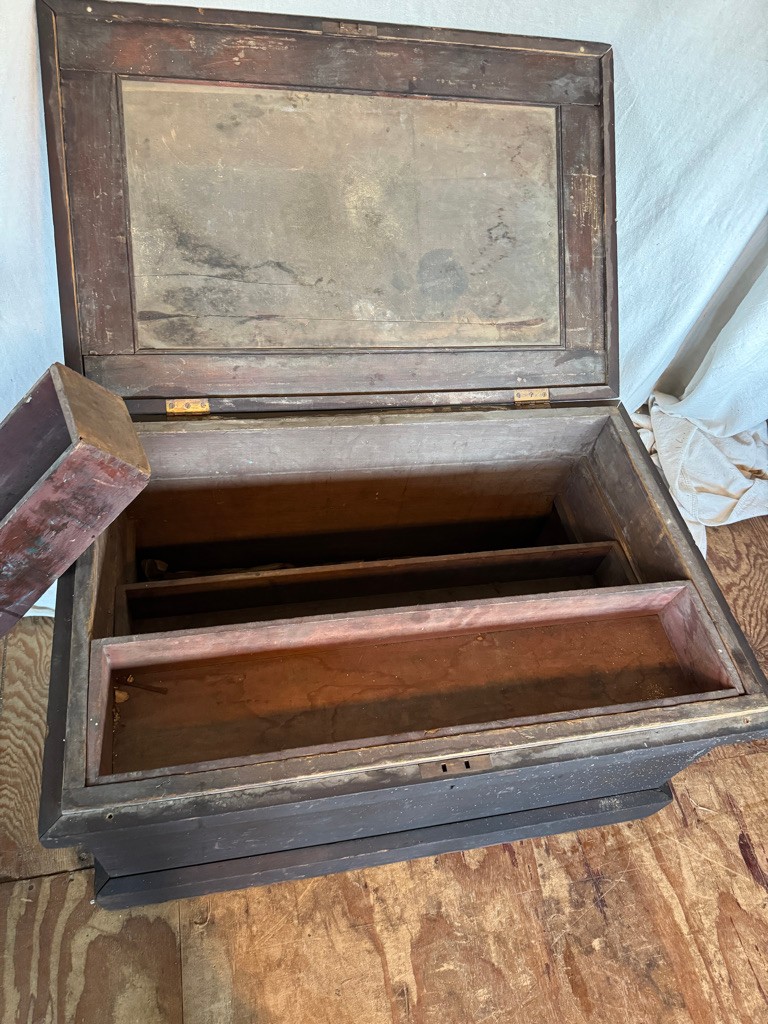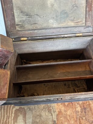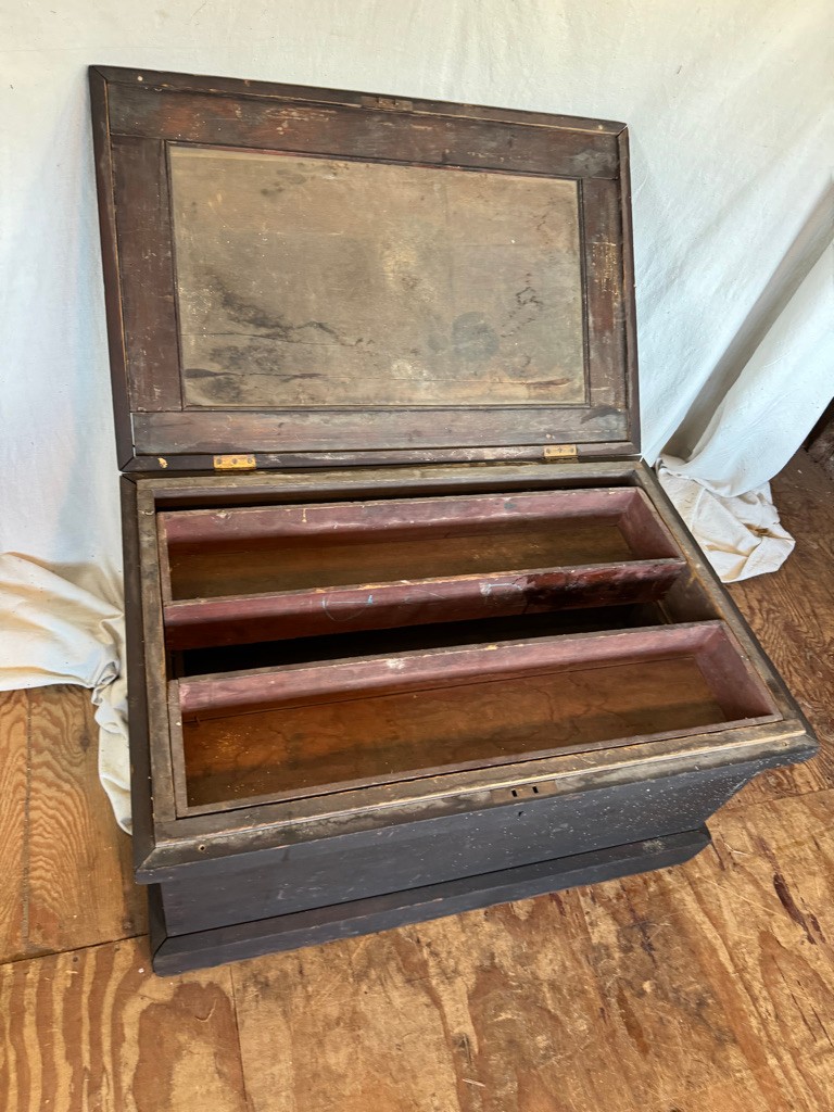 Antique carpenters tool chest 18 1/2 inches tall 24 inches deep and 36 inches long it has movable compartments inside see photos.