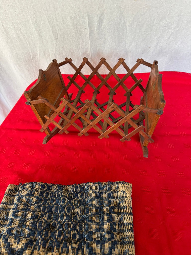 Wooden antique doll cradle 8 1/2 inches tall 10 inches deep and 15 inches long with fabric mattress