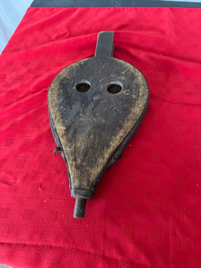 Antique wooden, metal and leather fireplace bellows. 20 inches long 10 inches wide and 2 1/2 inches deep