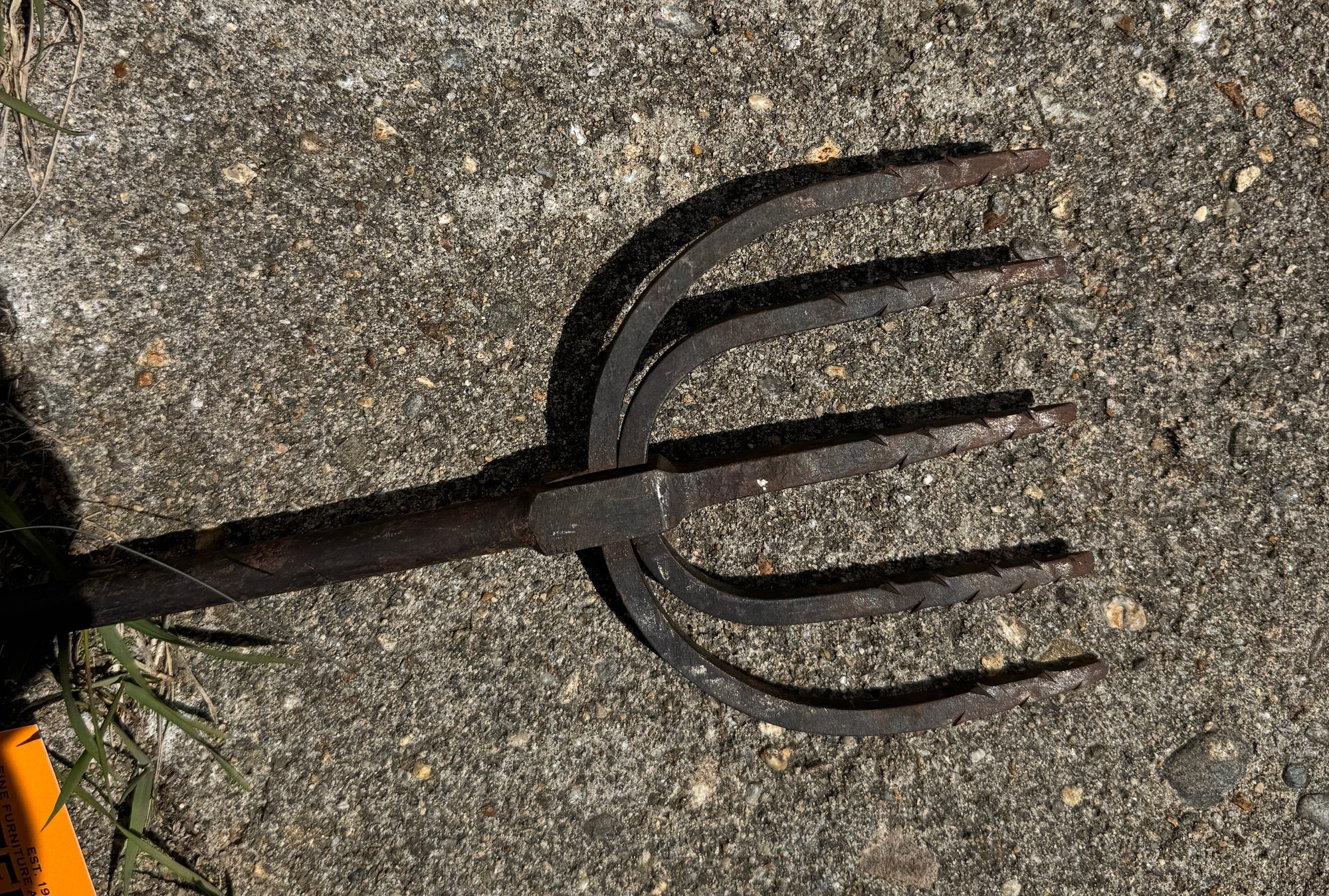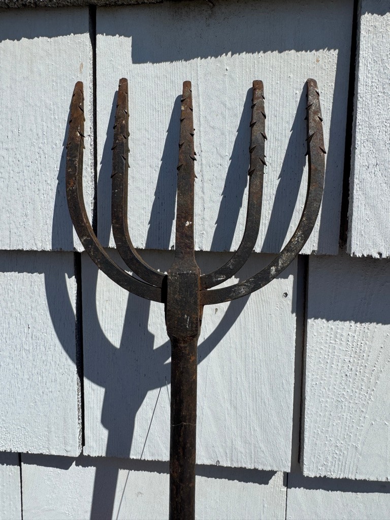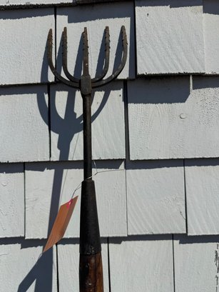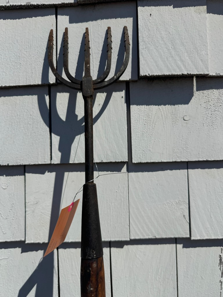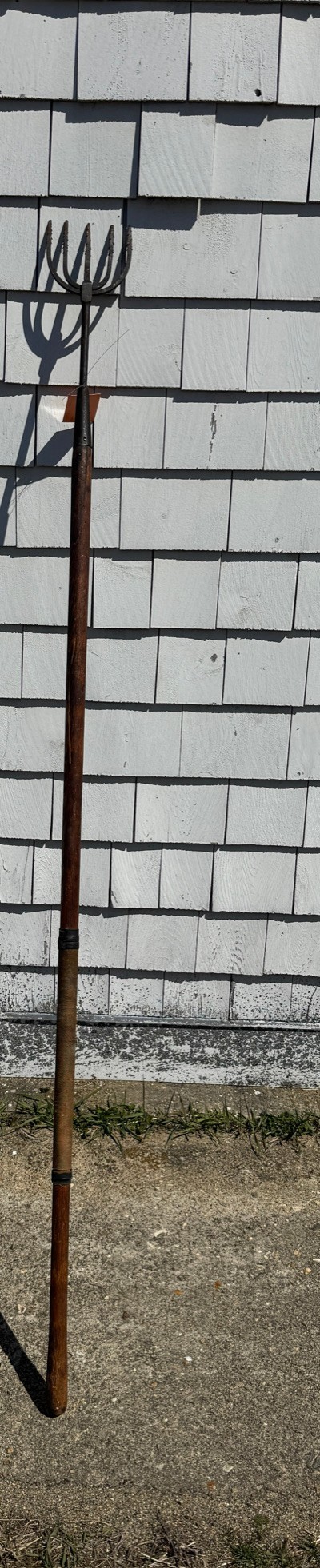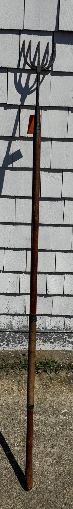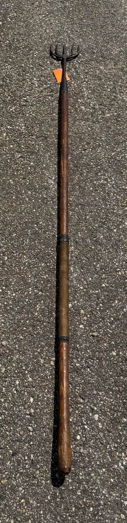 Antique Metal and wood handled spear for fish or eel . The spear is 68" long and about 1" in diameter . a nice piece for decoration in nautical theme.