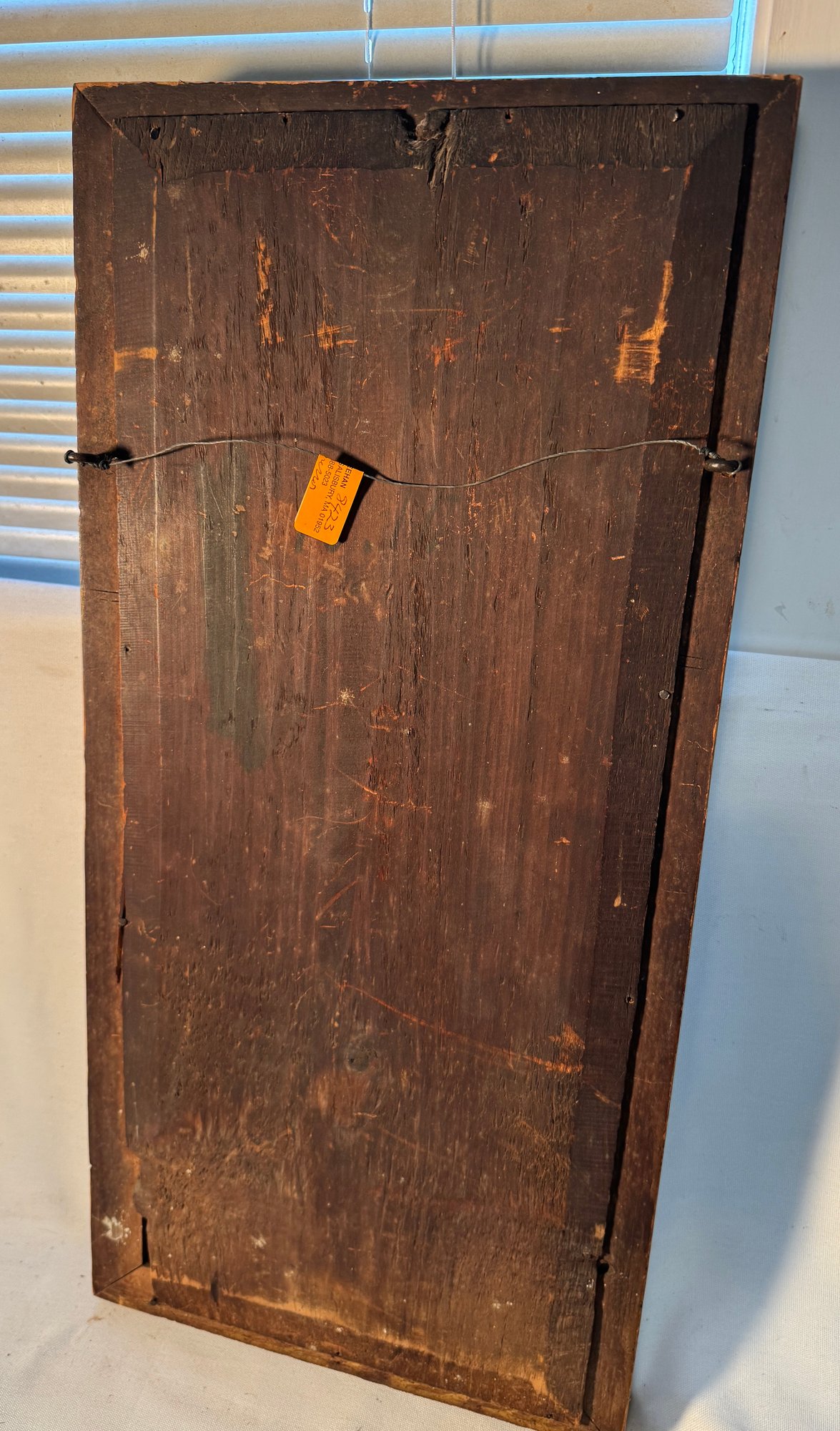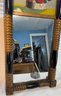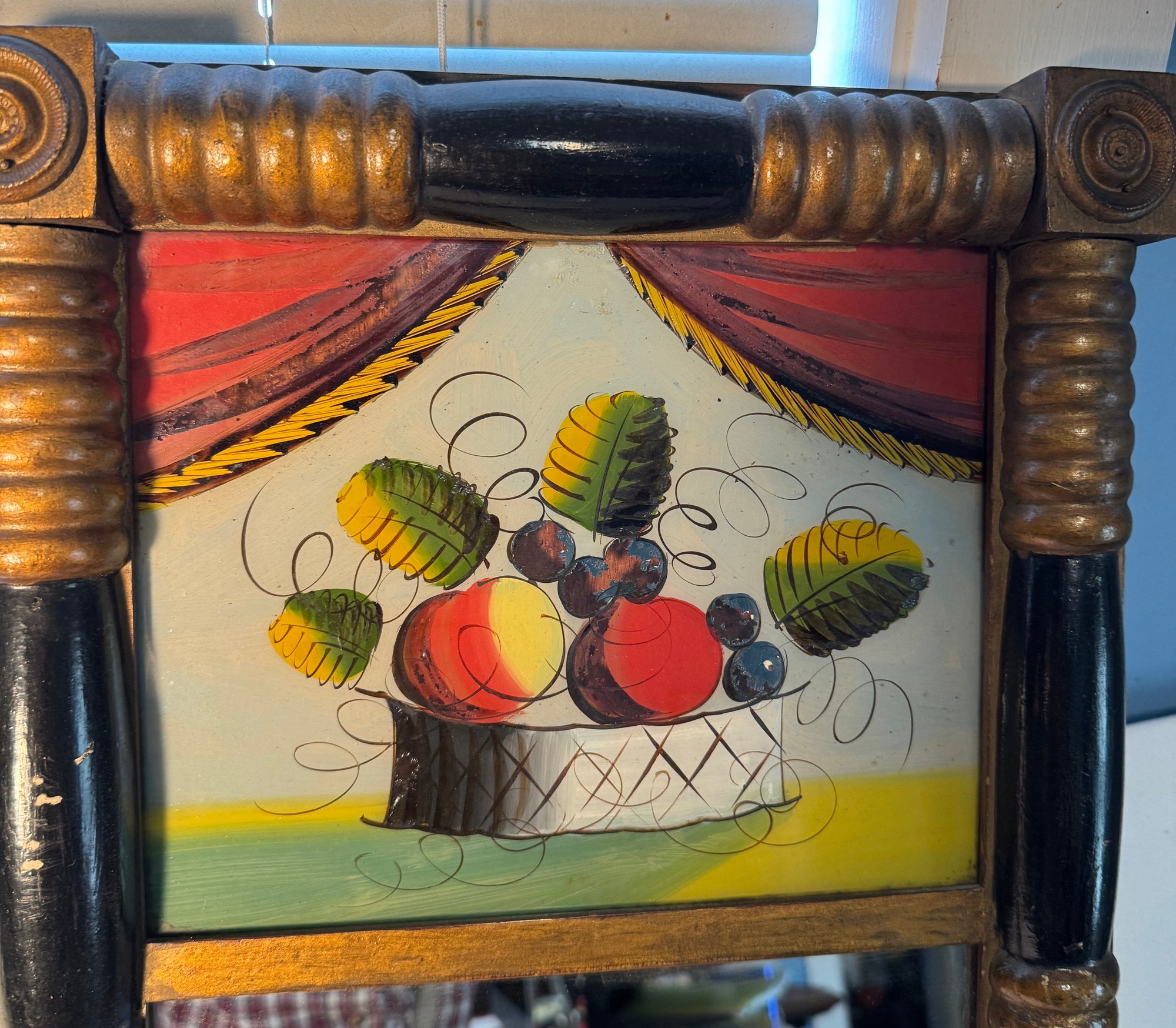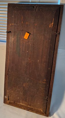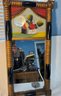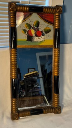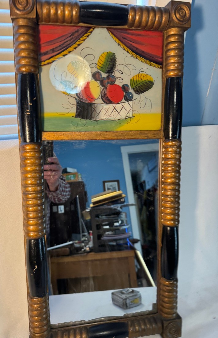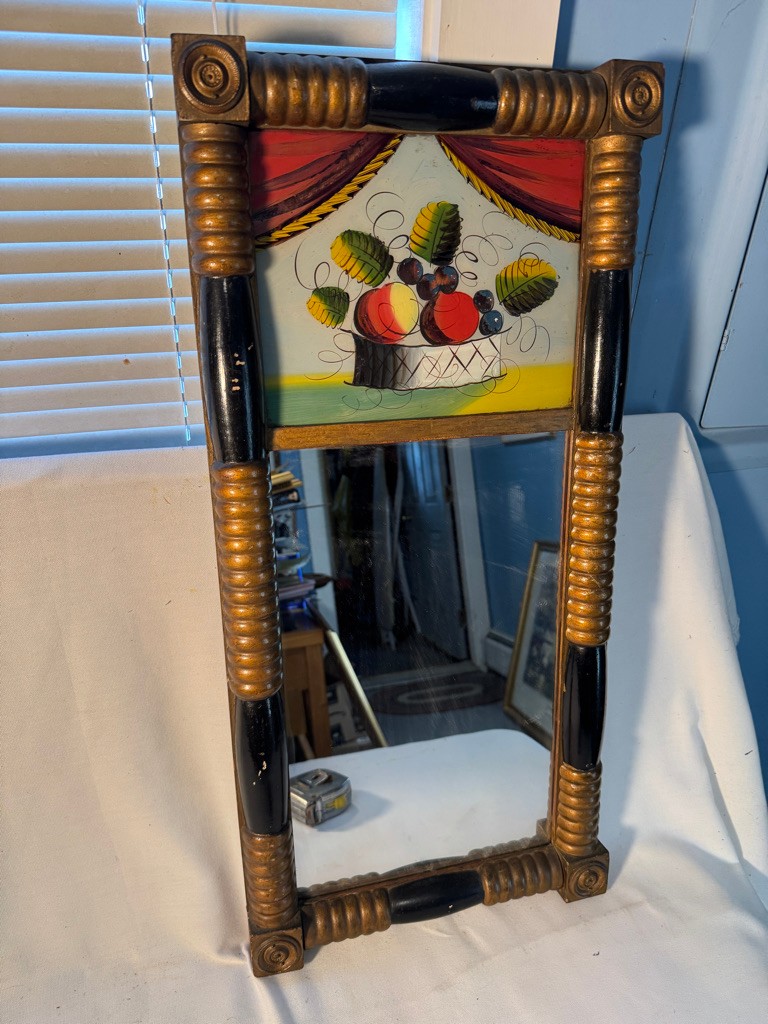 Frame size is 27 1/2" tall and 13" wide . This antique frame has reverse painting on glass and mirror below it .A nice country antique
