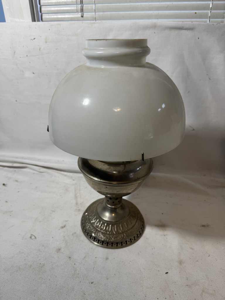 17" tall 10" in diameter made in the USA kerosene lamp and shade . Take a look nice honest lamp