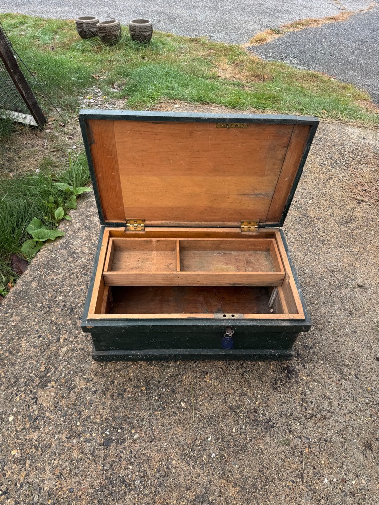 Pine painted green tool box with key.The Tool box is 10 inches tall 16 inches deep and 26 inches wide. the interior has a tool tray in it. See Photos