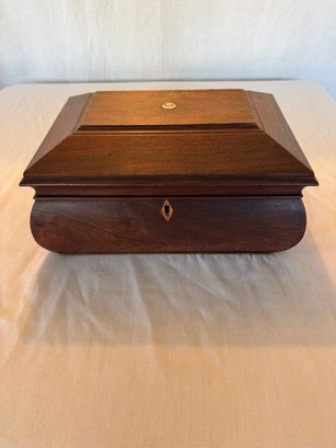 Rosewood tea caddy 13" long 9 1/2" deep and 7 " tall . lock missing and some veneer damage on back corner. see photos