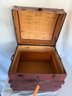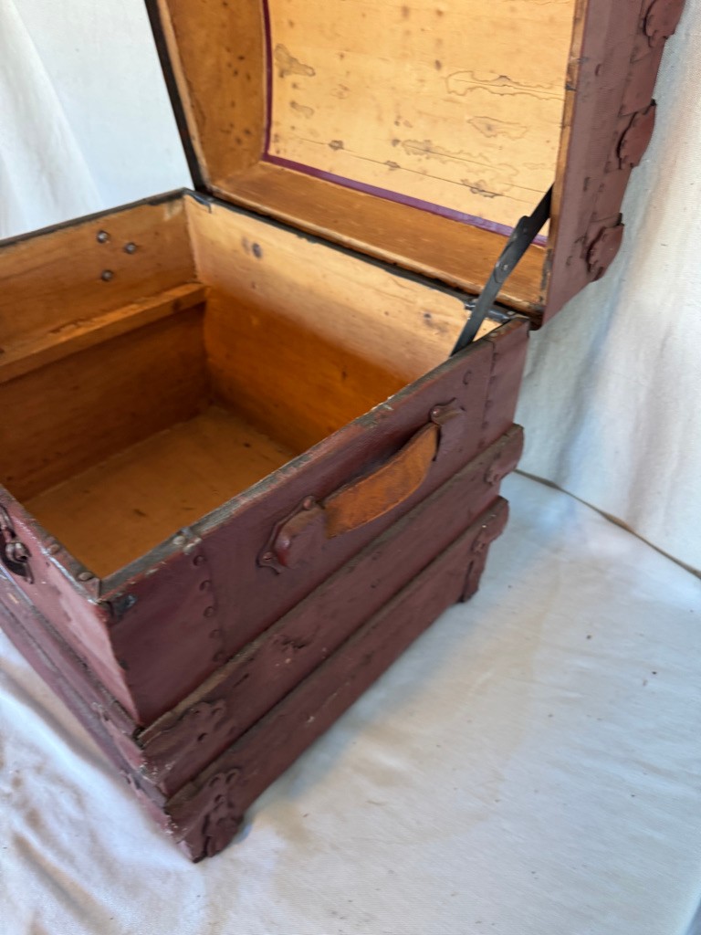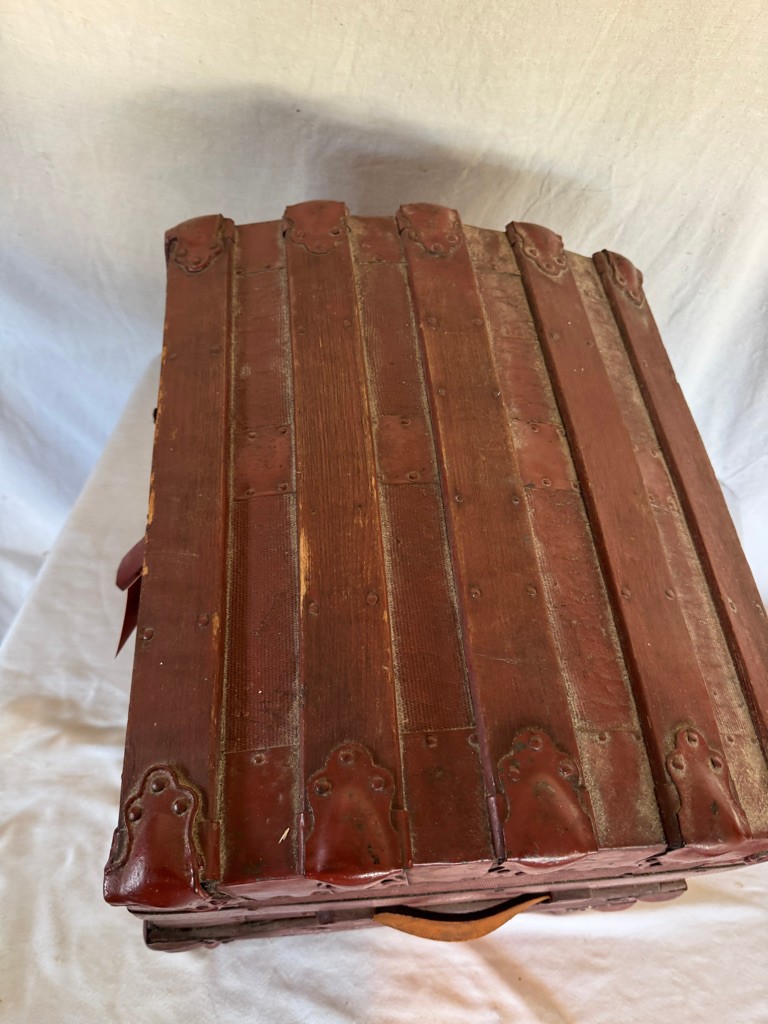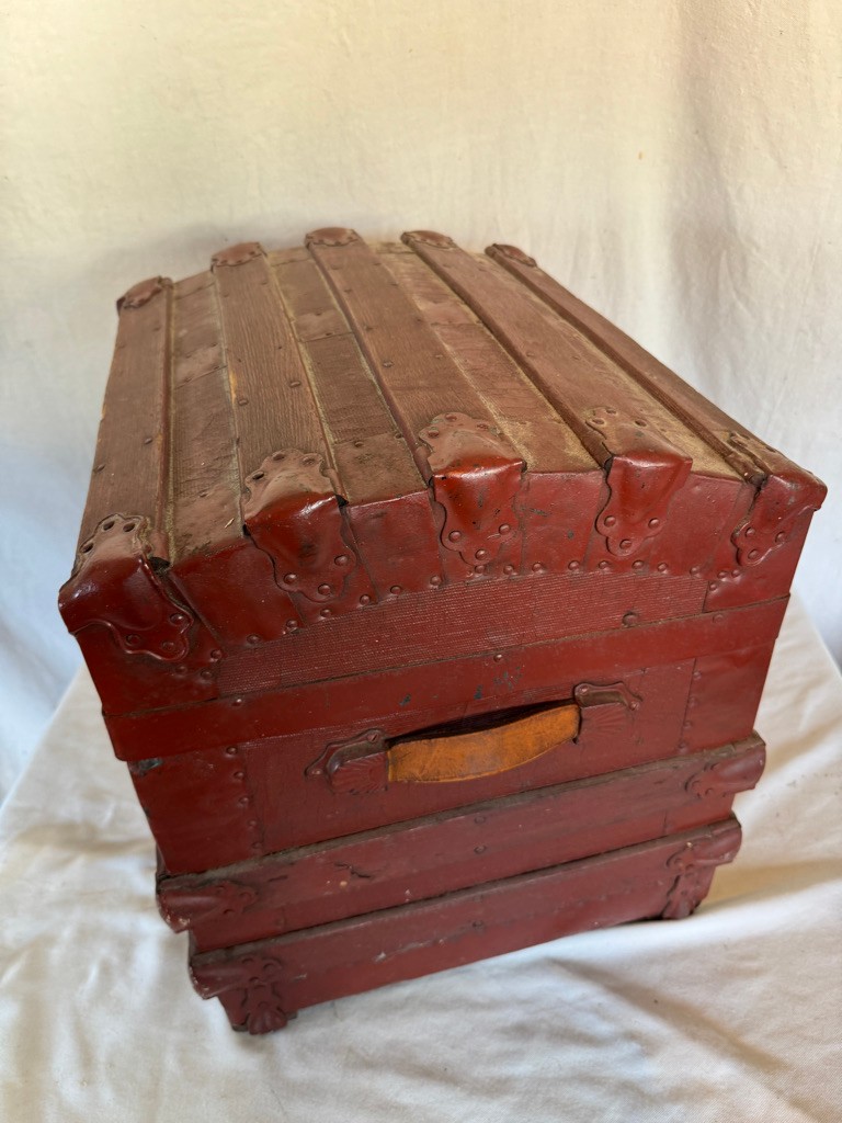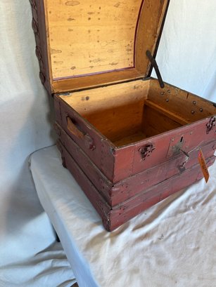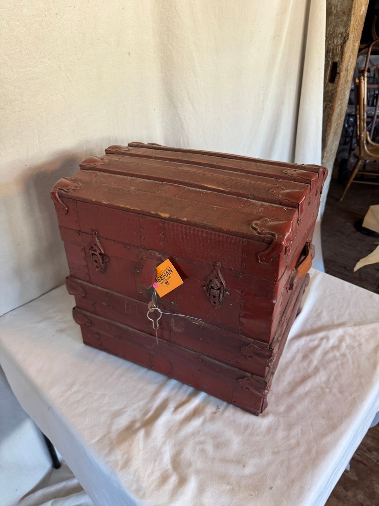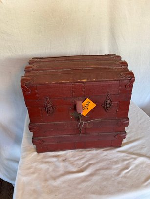 Antique half trunk with key . The trunk is 18" long , 18" tall and 16" deep .