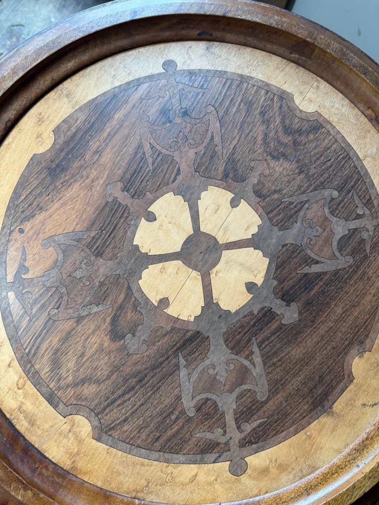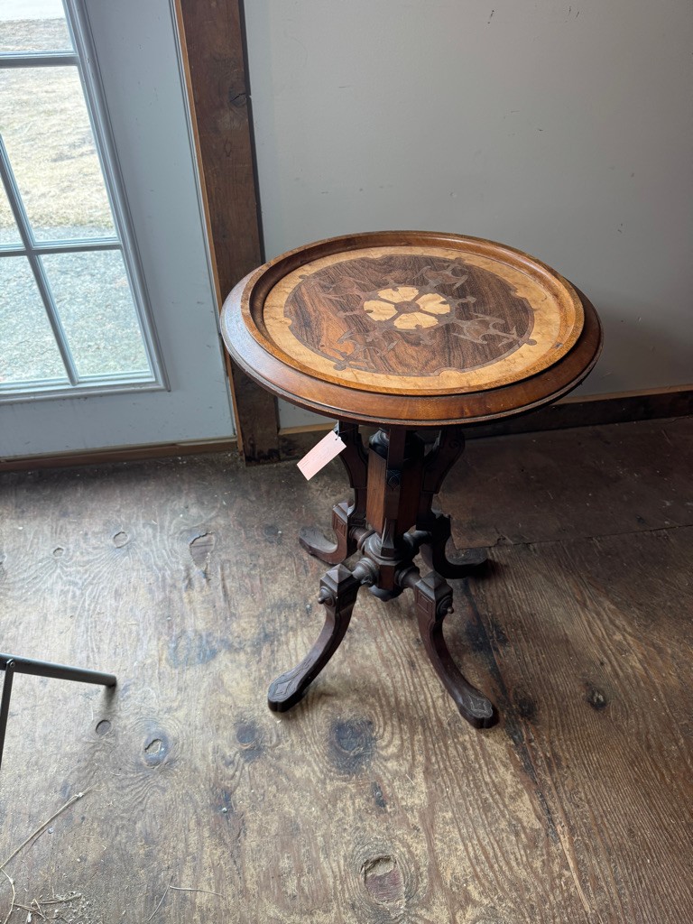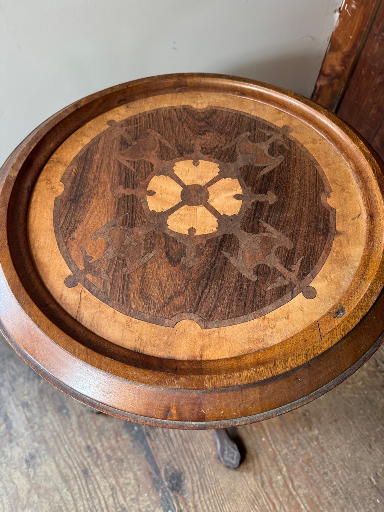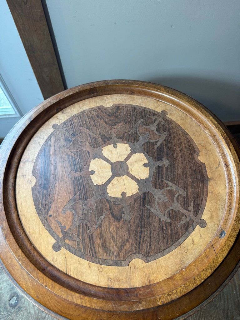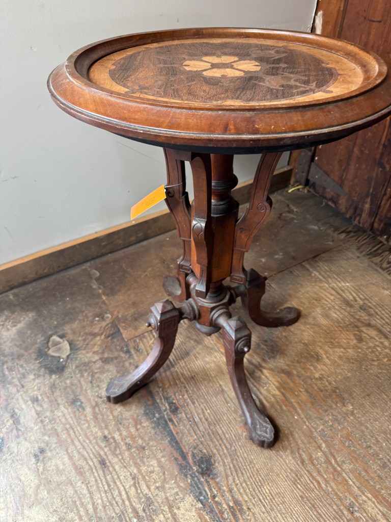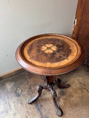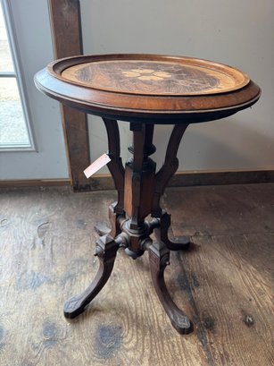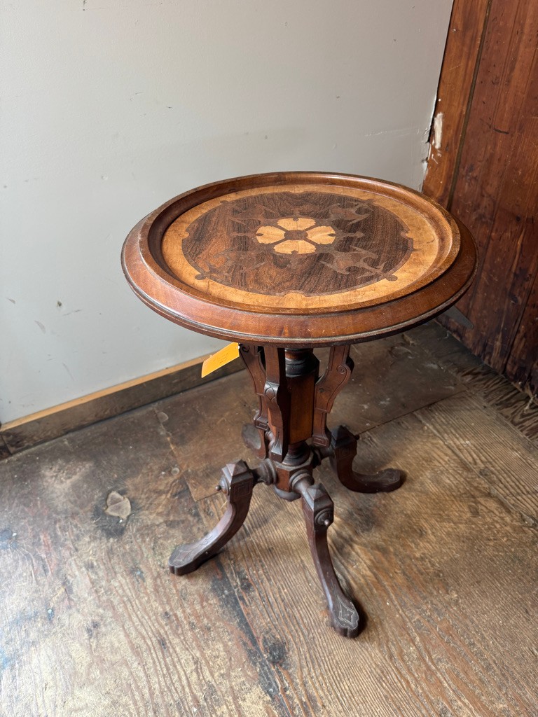 Antique Renaissance Victorian inlaid walnut table. 28 inches tall and 20 inches in diameter take a look at nice table