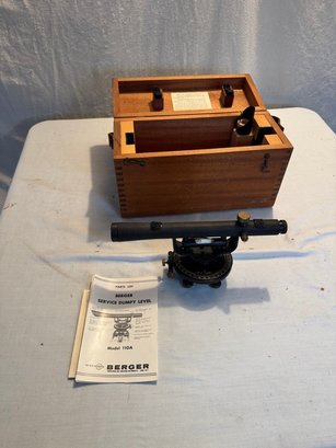 Box size 13" long 6" deep and 7 1/2" tall . A nice Berger transit in wooden box.