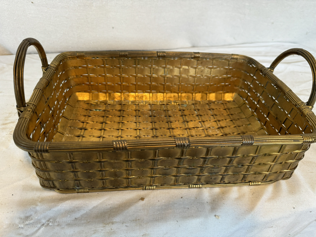 Nice basket made out of brass 16" long 9 1/2" deep and 7" tall at handles. the sides are 4" tall