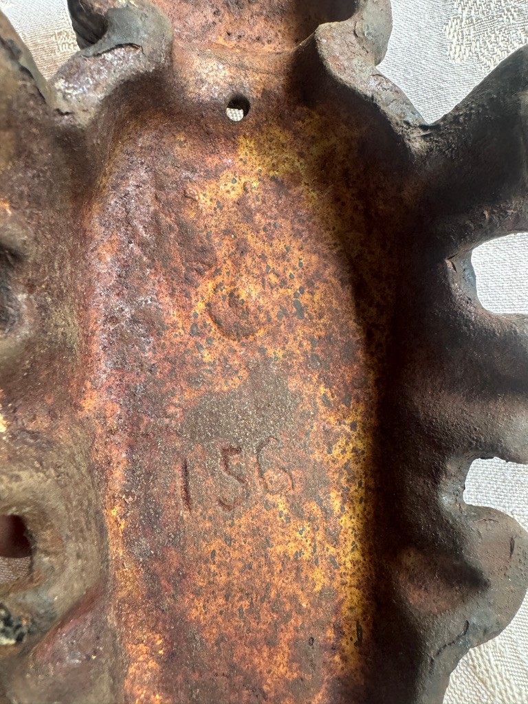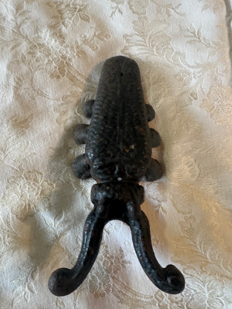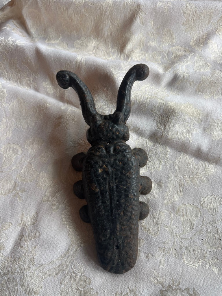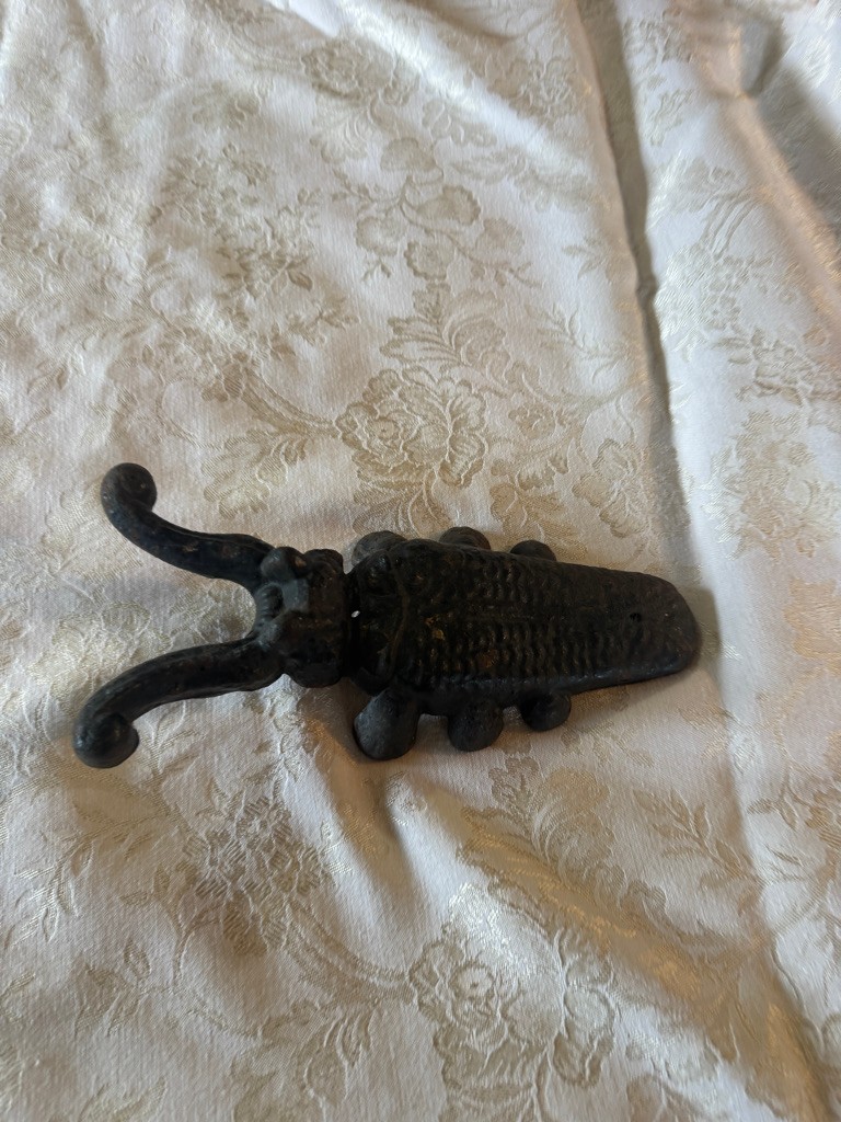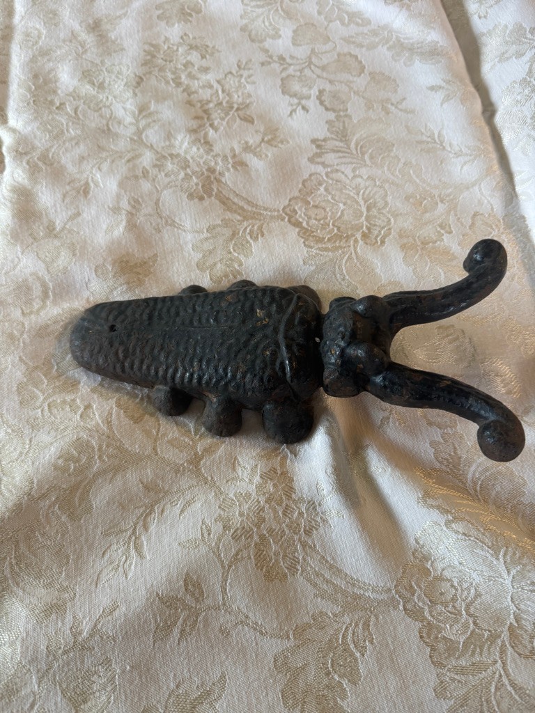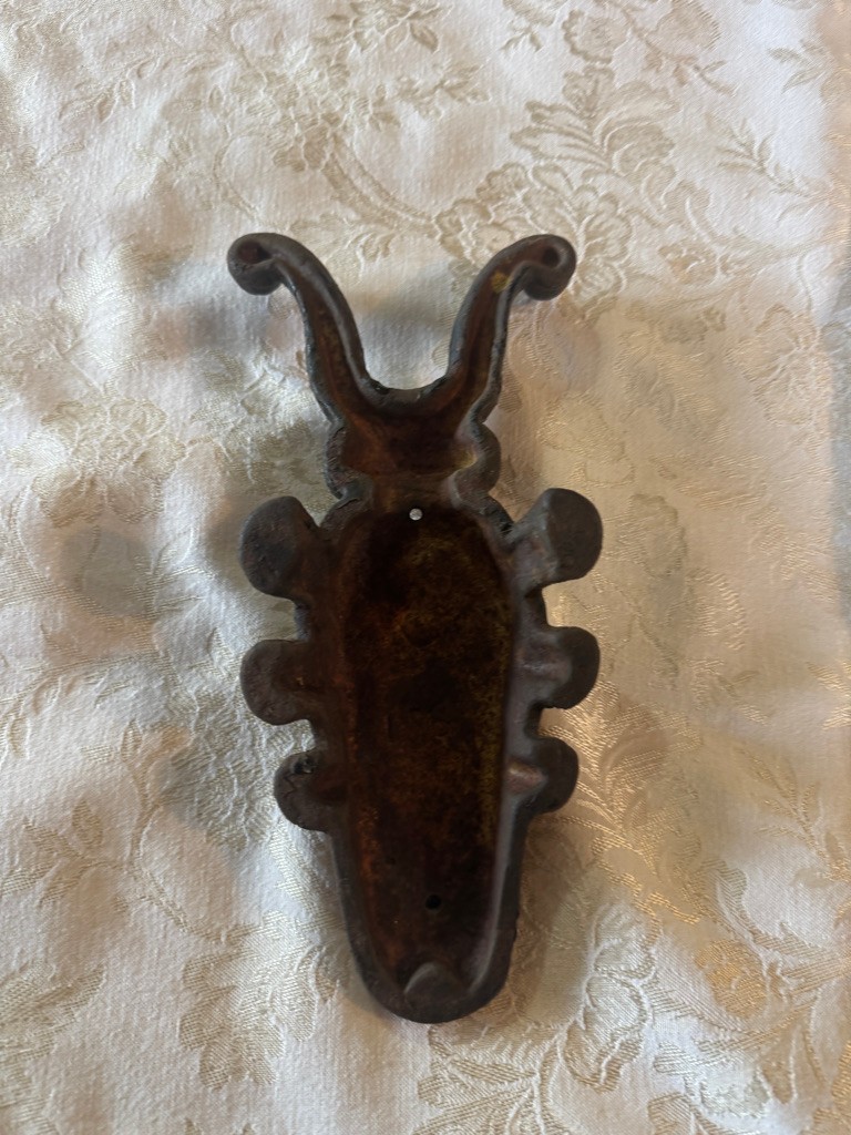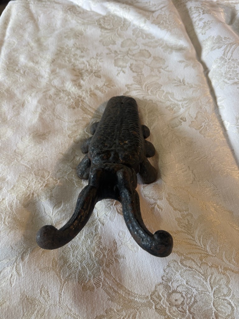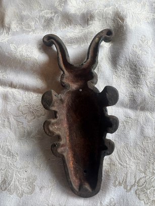 Cast-iron beetle boot jack 10 inches long 5 inches wide and 2 1/2 inches tall there's a number on the bottom of the casting 156
