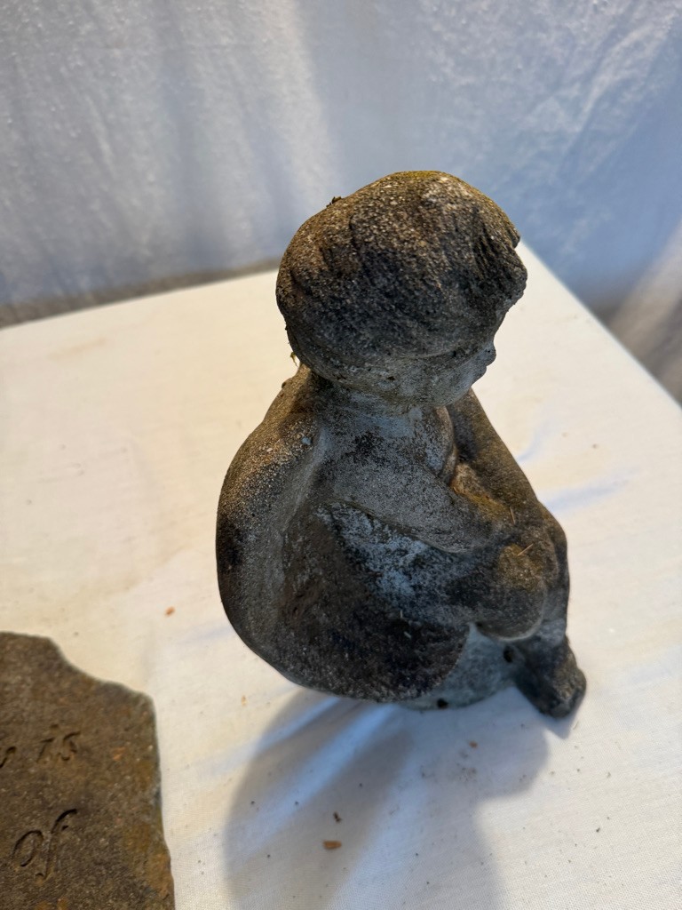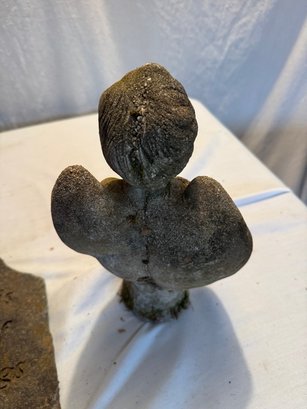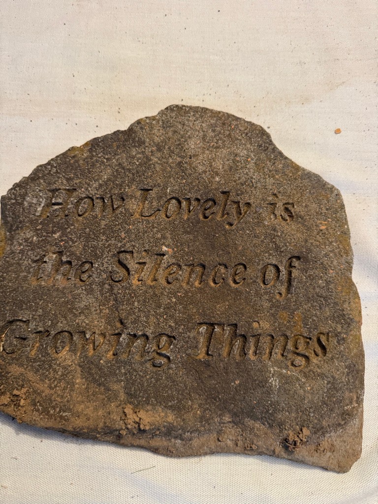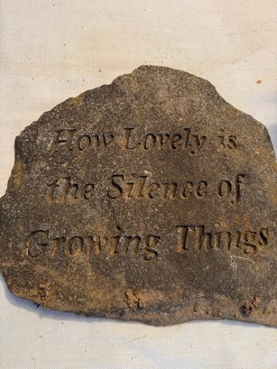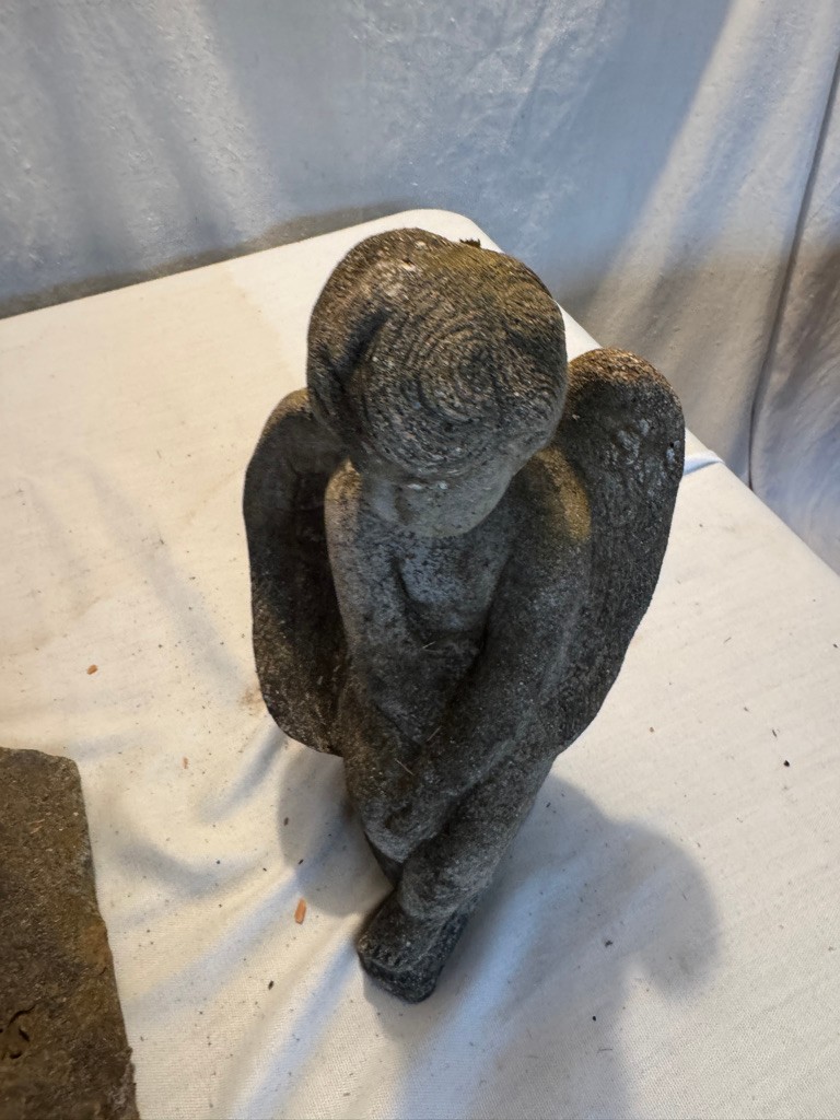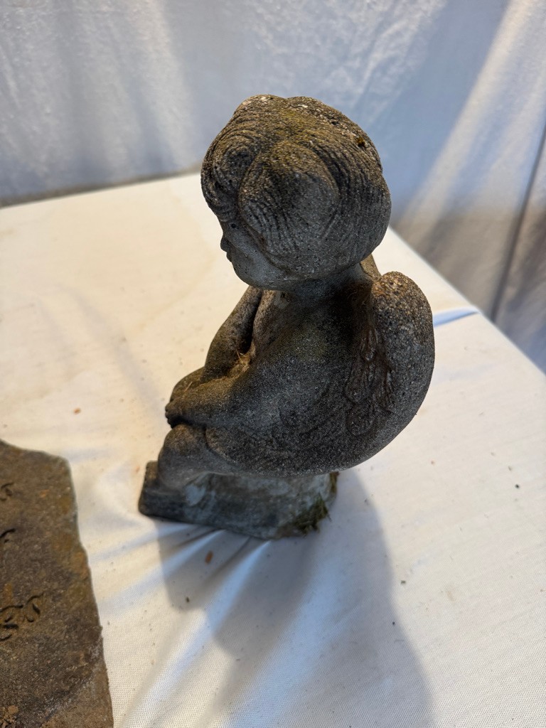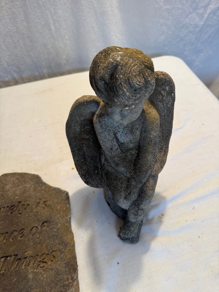Cement angel is 12" tall 8" wide and 7" deep the plaque is 10" by 11" and 1" thick . The plaque is inscribed : How lovely is the Silence of Growing Things.