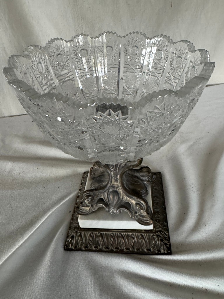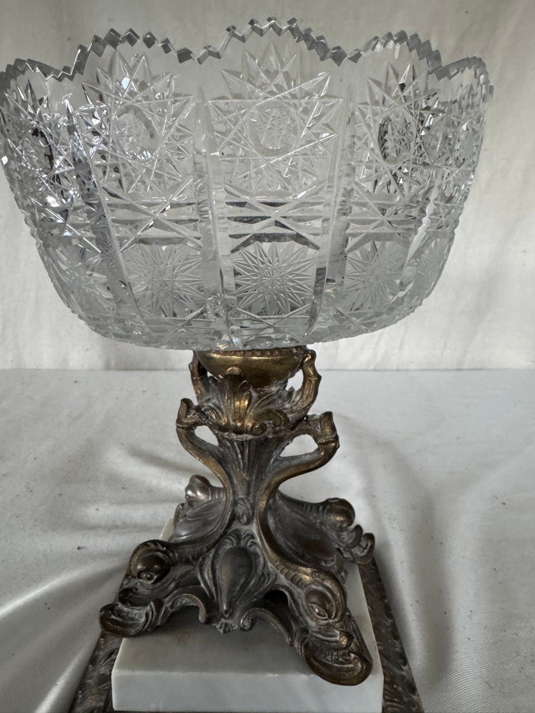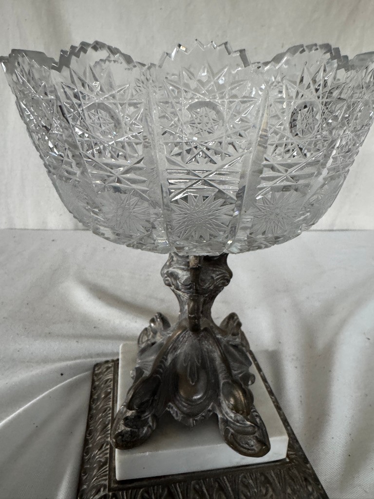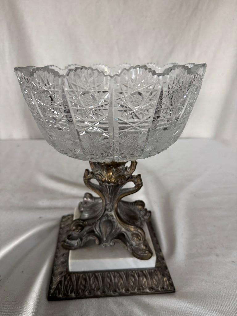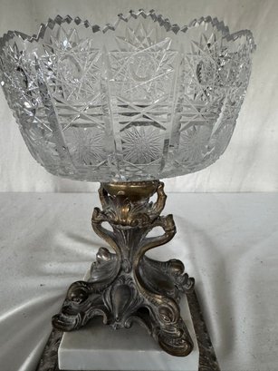 Cut glass compote on metal and marble base . Compote is 8" in diameter and 4" tall . The base is 8" by 8" . The overall height is 10" . See photos the base is very fancy.