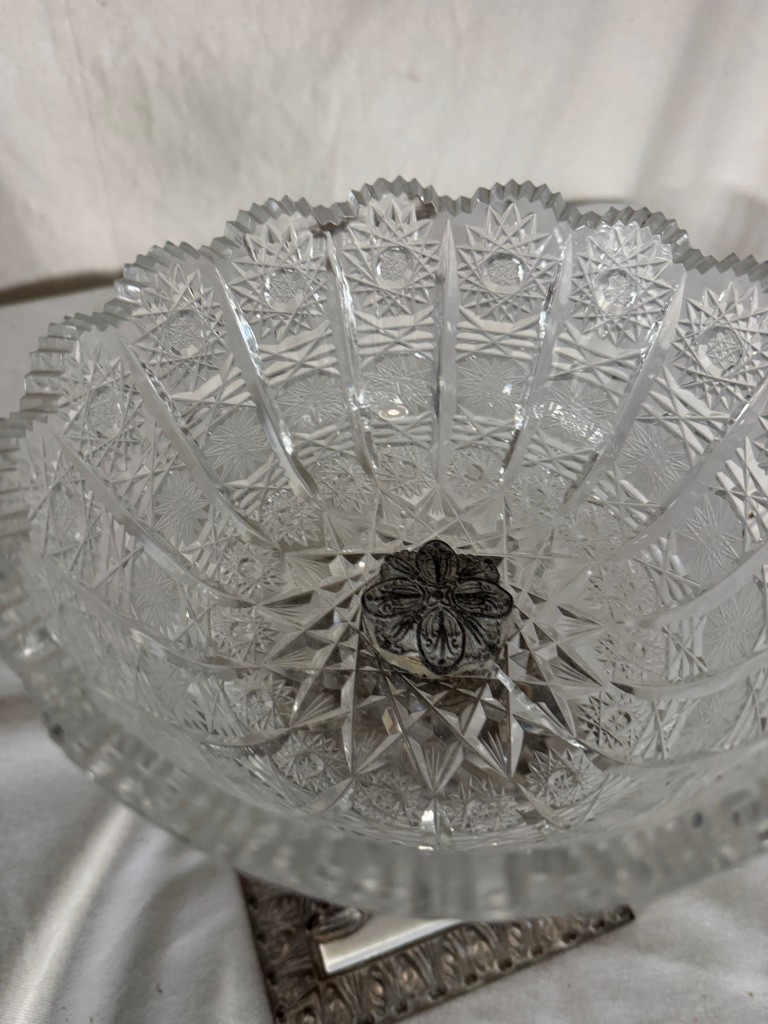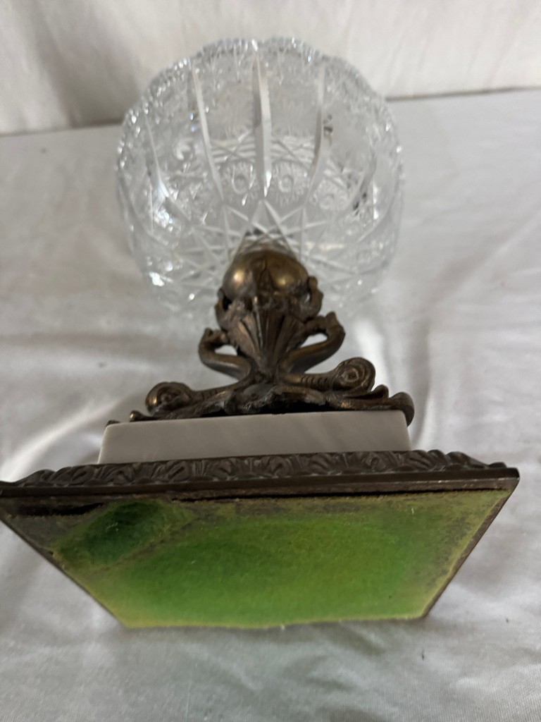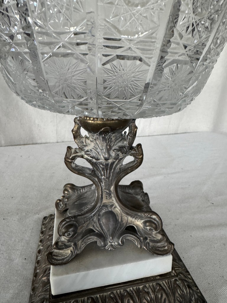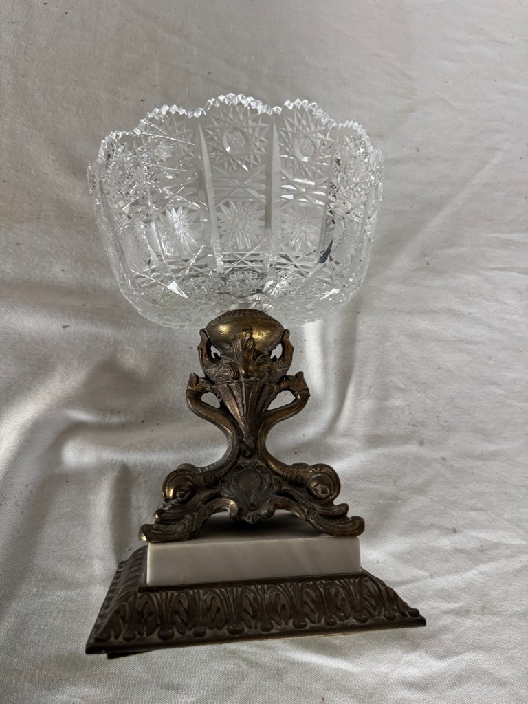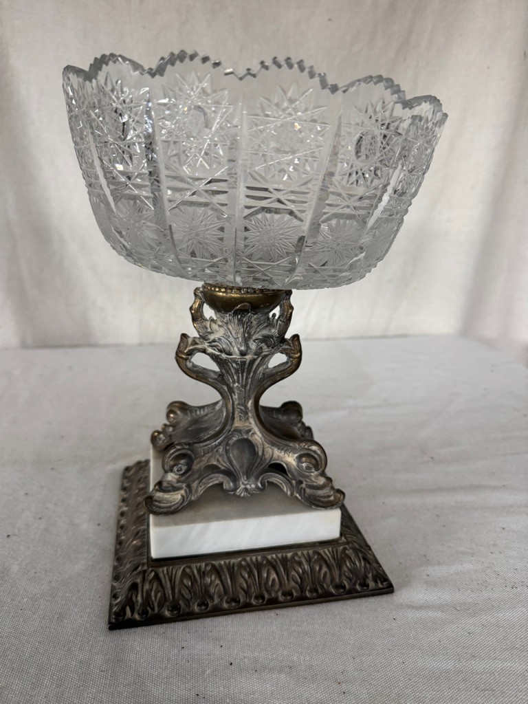 Cut glass compote on metal and marble base . Compote is 8" in diameter and 4" tall . The base is 8" by 8" . The overall height is 10" . See photos the base is very fancy.