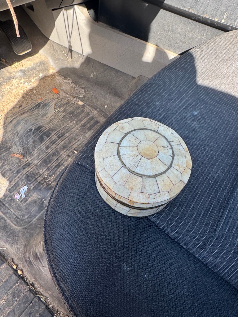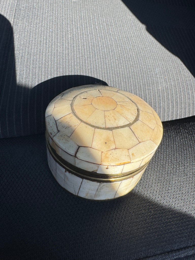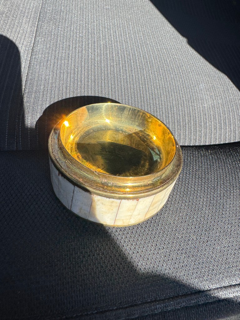 Brass trinket jar with bone inlays 2 inches tall and 3 inches in diameter Nice decorative piece