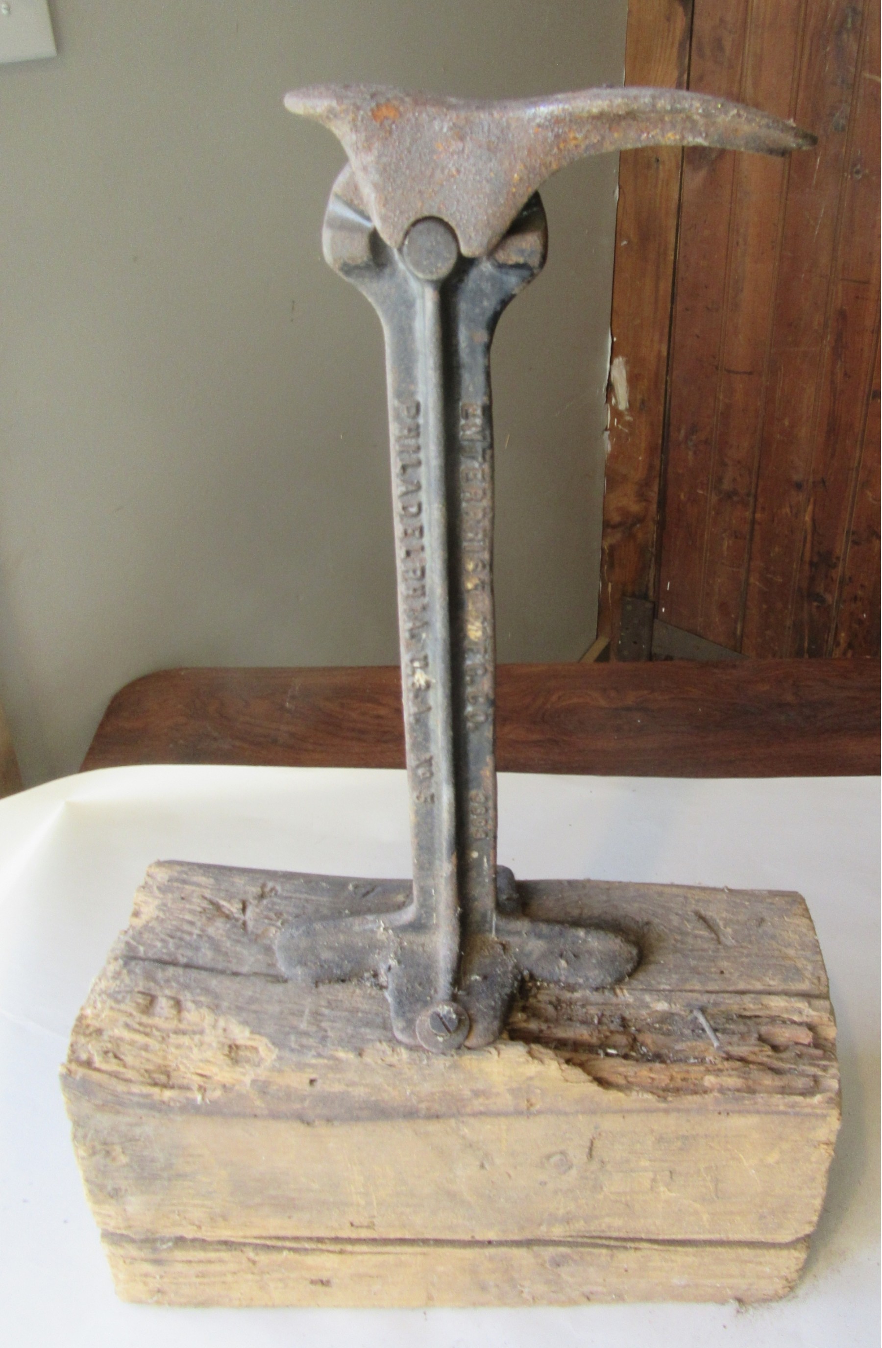 Enterprise adjustable shoe last on block of wood .Marked Enterprise Philadelphia see photos