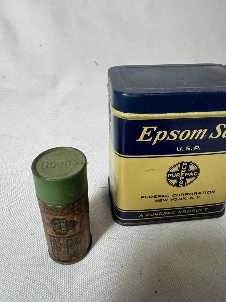 2 pieces Epsom tin and Doans container . Doans is 2 1/2" by 1 " in diameter .Epsom salt tin is 3 1/2"tall by 2" deep and 3" wide