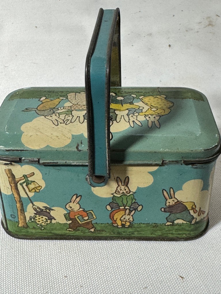 Probably for easter candy the tin is 2 1/4" tall by 4 5/8" long and 2 5/8" deep Cute see photos