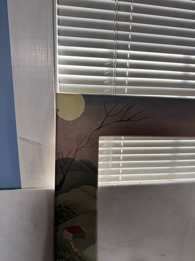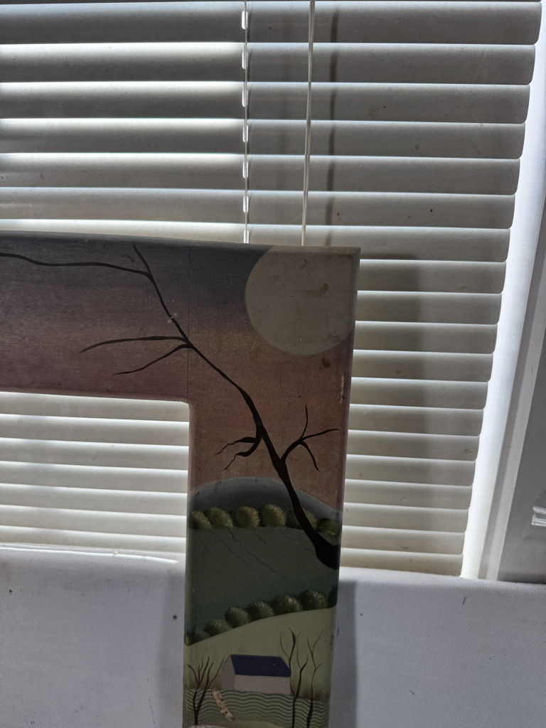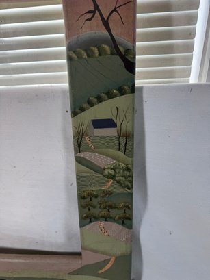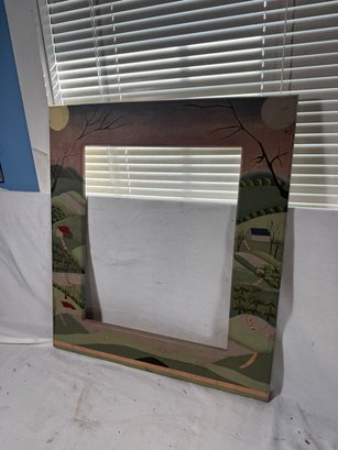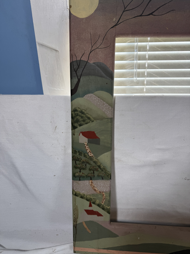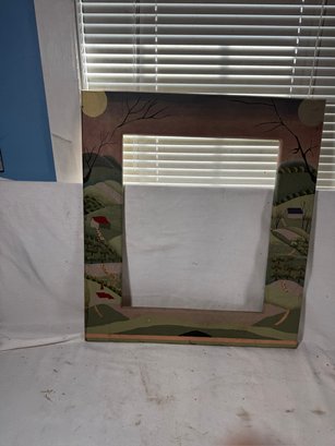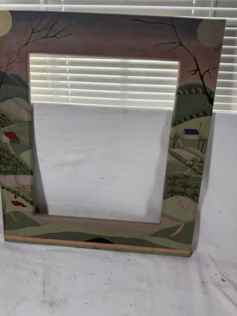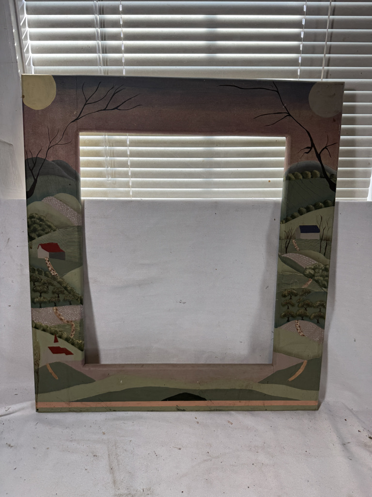 Frame with painting of barns ,fields and trees on frame. Would make a nice mirror