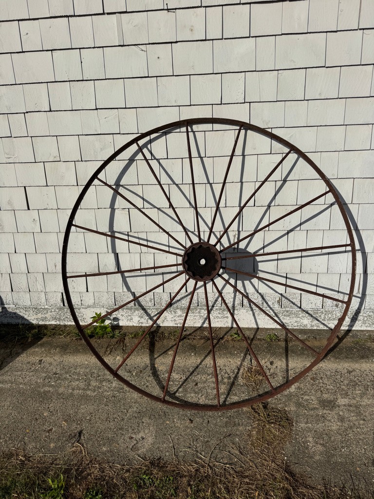 Old iron wheel 54 inches in diameter rim is 2 inches hub depth of 6 1/2 inches.Good item to repurpose or use as lawn art