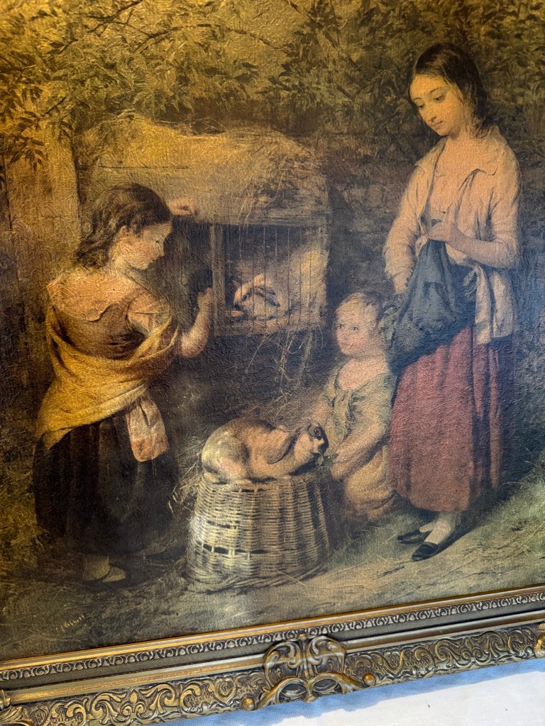 Large vintage print of rabbits and people 36 inches tall by 30 inches wide on print COBBETT .