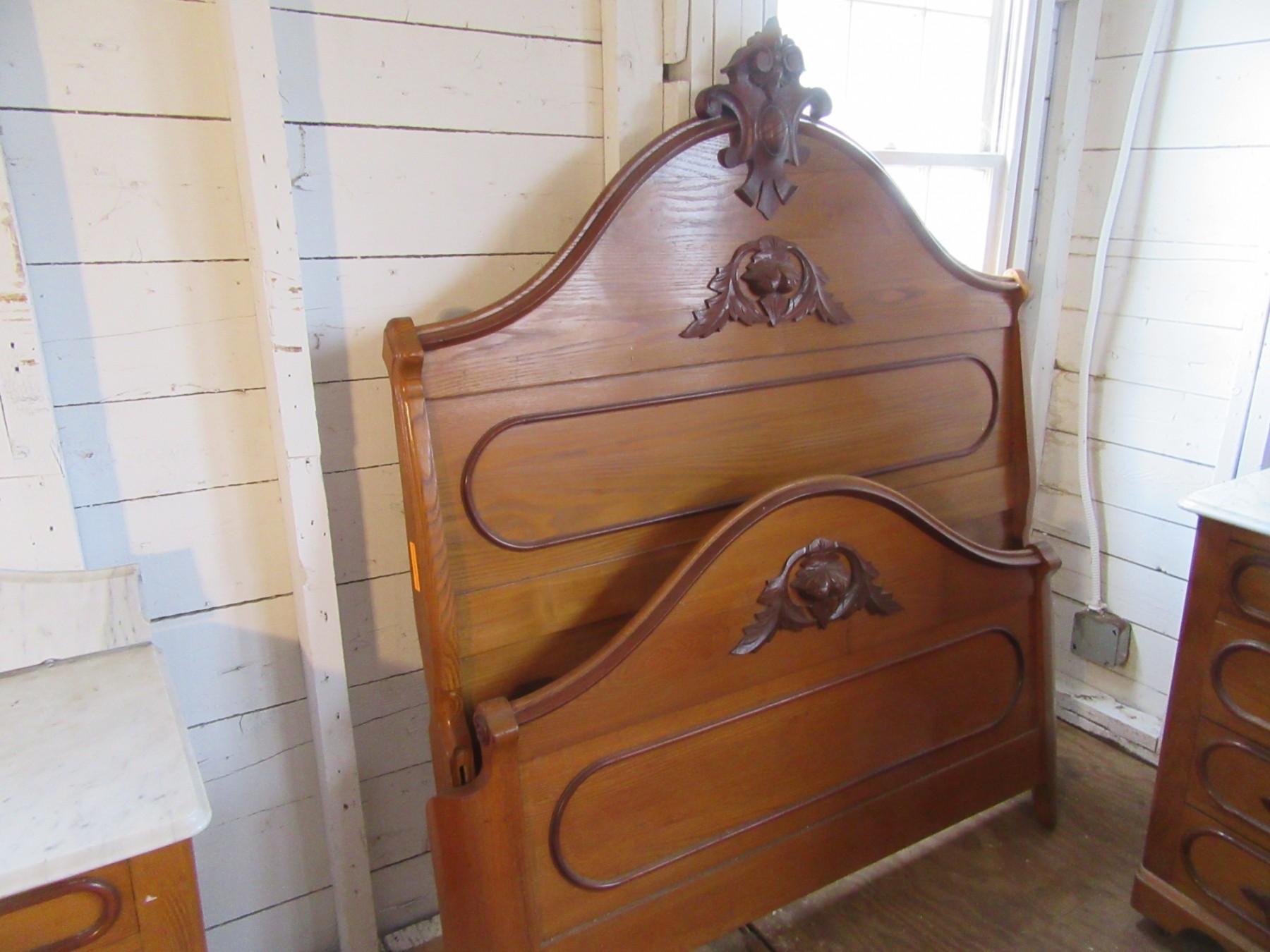 Ash and walnut bedroom set consisting of bed head and footboard and rails ,marble top chest with mirror and marble top commode .headboard height 66"footboard 36" Chest height to top of mirror80",width 40" depth 19" Commode height 38" width 31" depth 18"