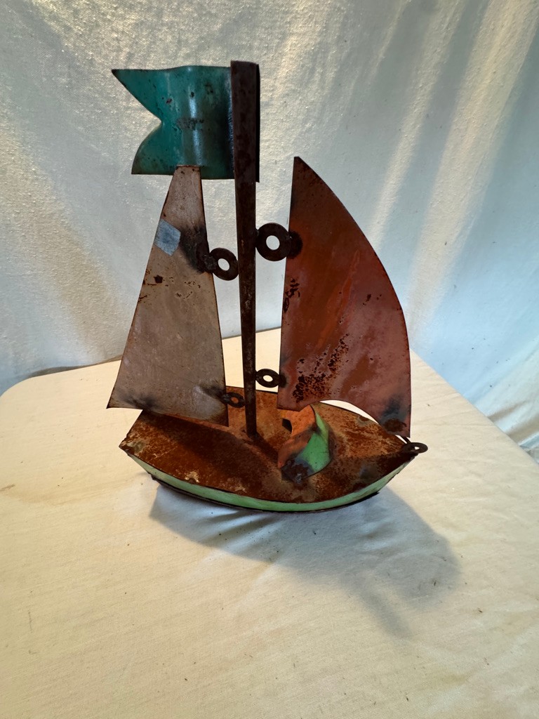 Metal boat sculpture 16 inches long 6 inches deep and 18 inches tall. Fun piece for yard or house decoration.