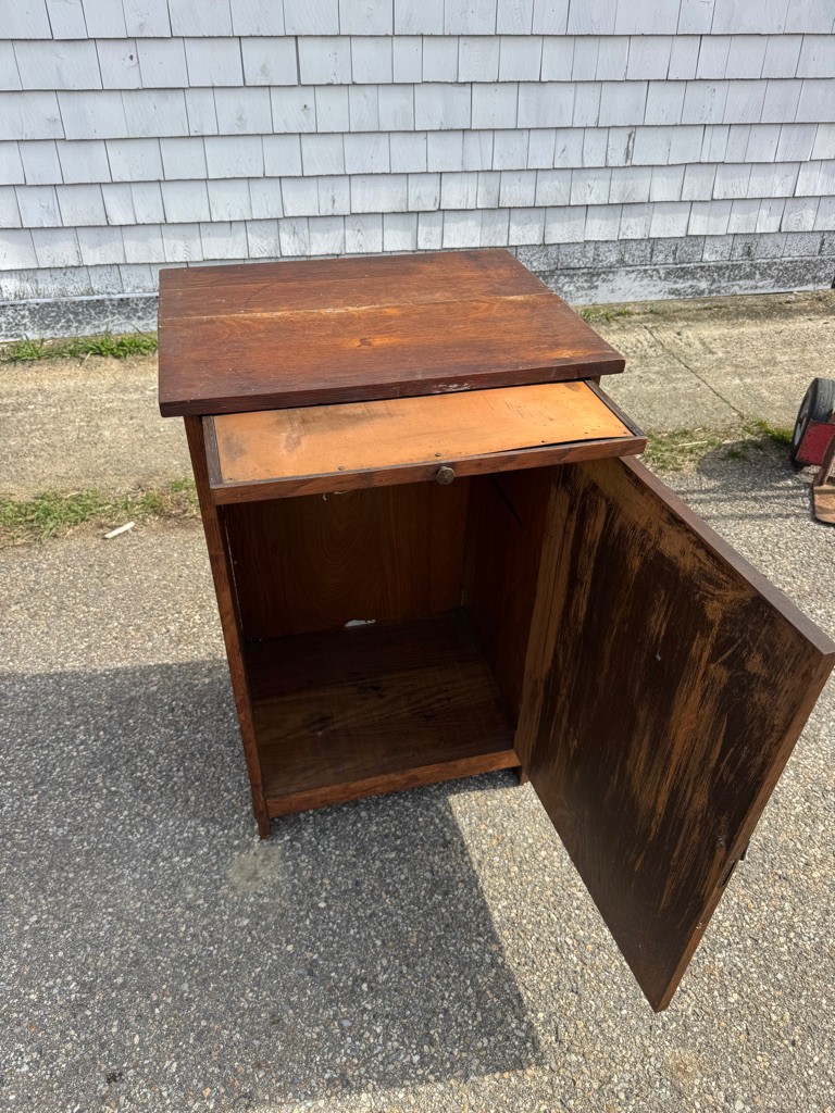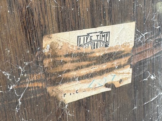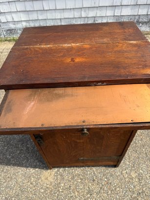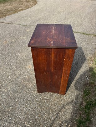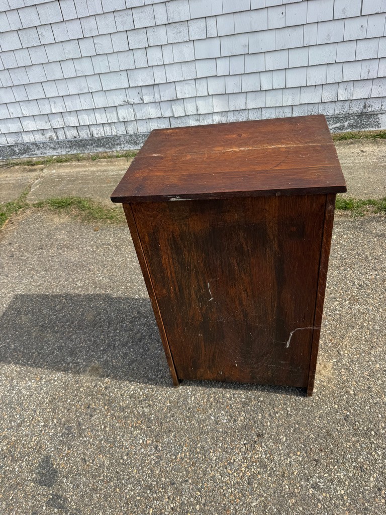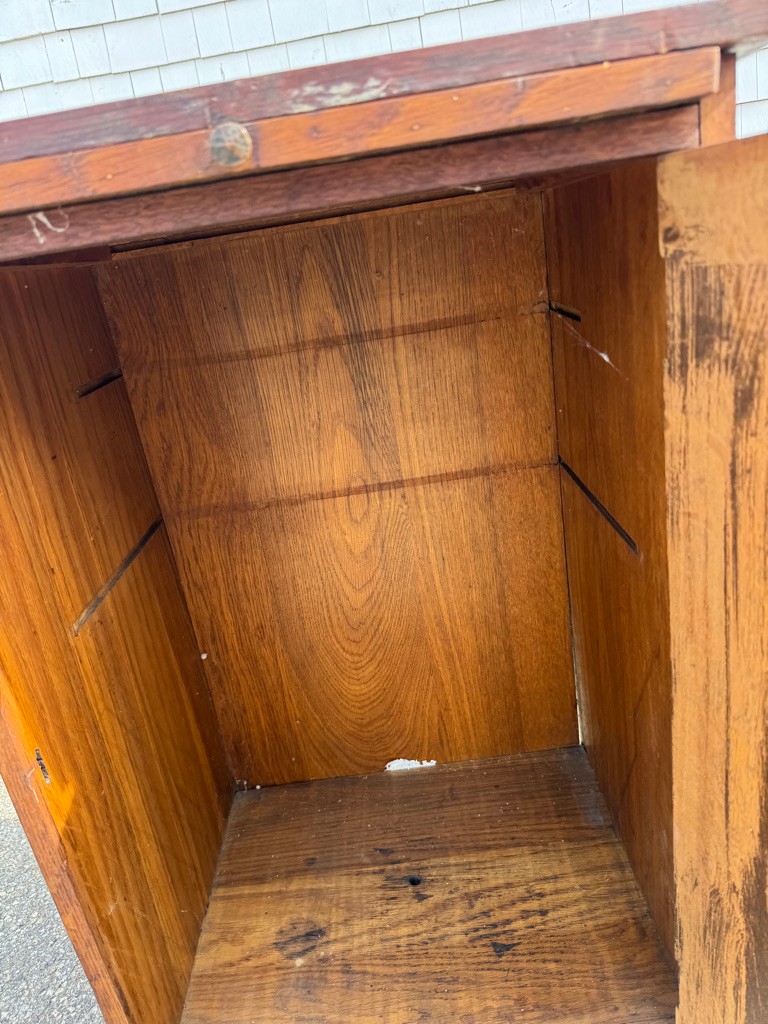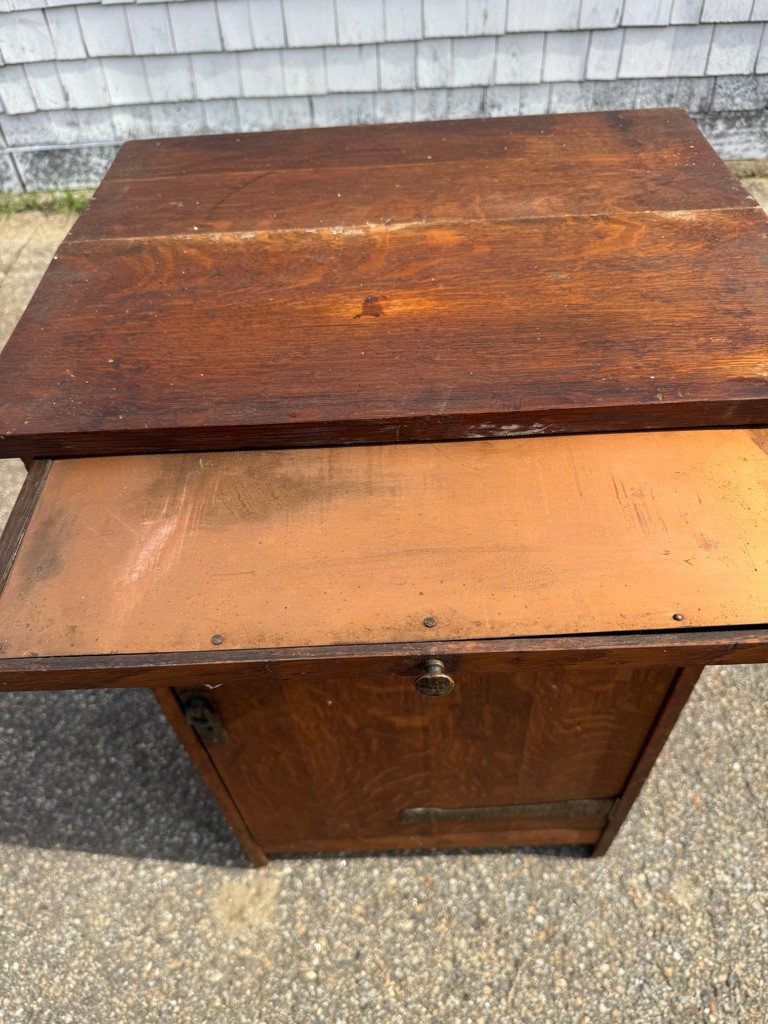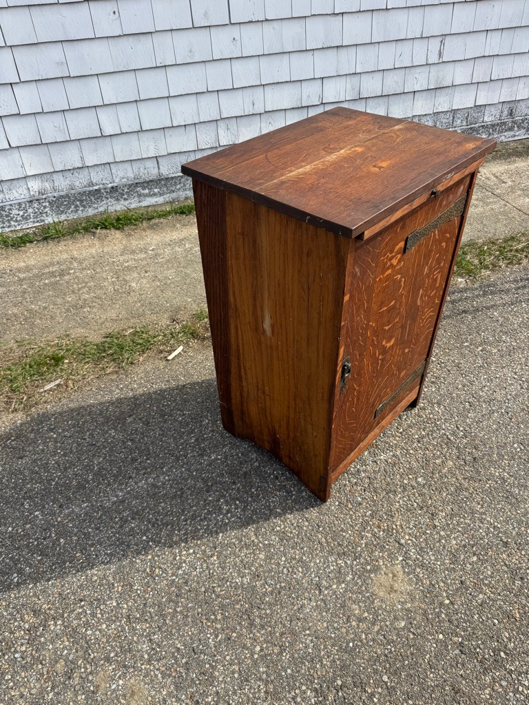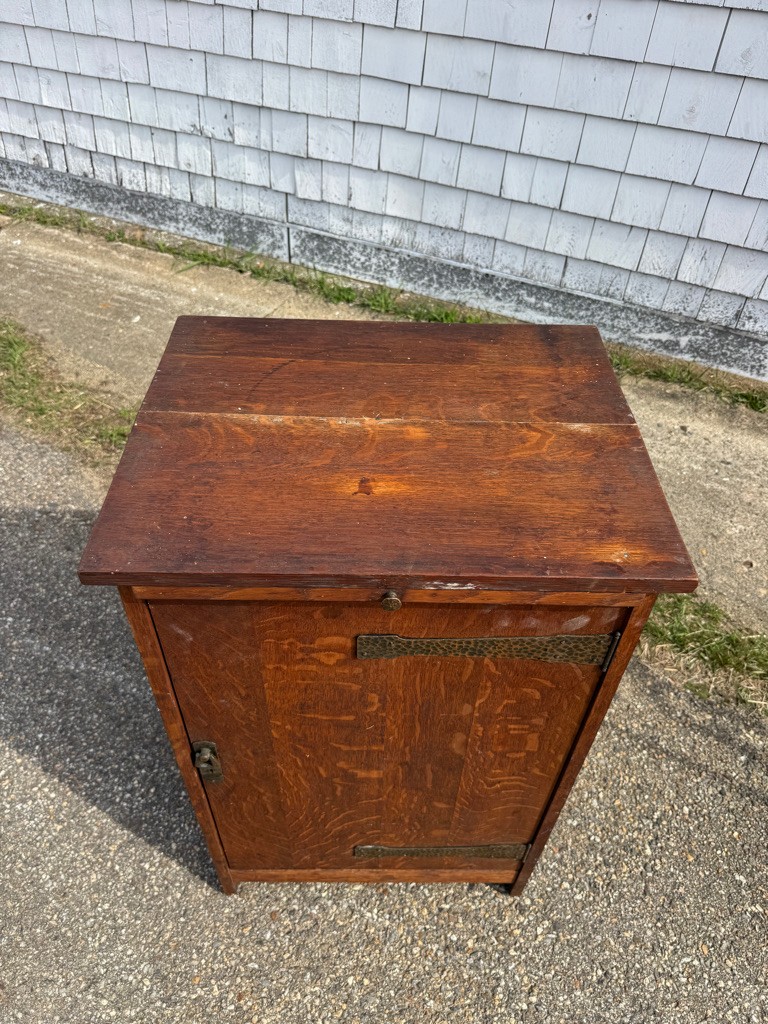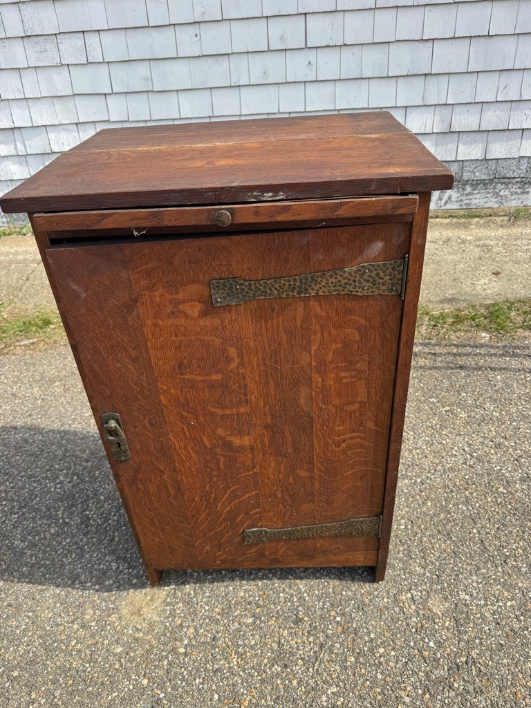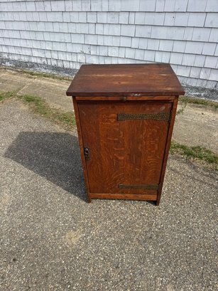 Oak Mission style cabinet 32 1/2 inches tall 20 1/2 inches wide and 16 1/2 inches deep there is a label on bottom of the cabinet Lifetime.Cabinet has pull out with copper on it . Take a look !!
