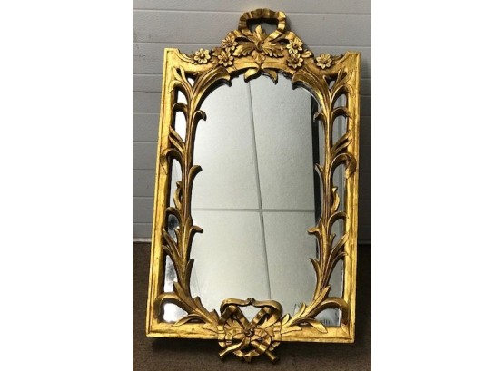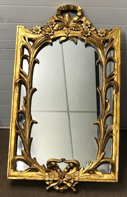 Fancy modern gold mirror . Not sure what this made from but it is not wood . The previous owner covered the back with something to protect wall. The wire to hang it with needs to be reattached . Piece is 23 1/2" by 43 3/4"