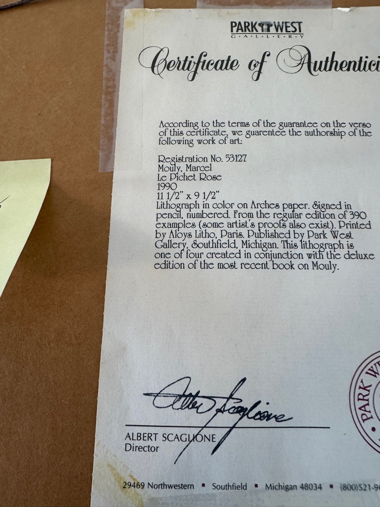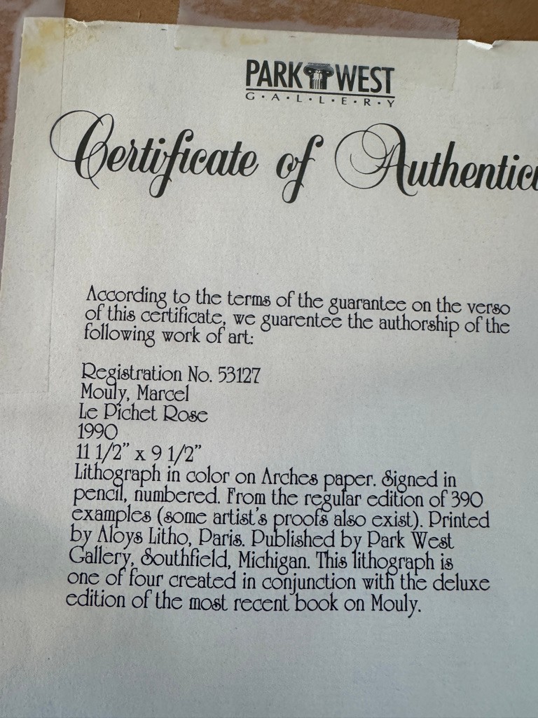 See on back of frame certificate of authenticity 280/390 size 11 1/2" x 9 1/2" signed in pencil Mouly