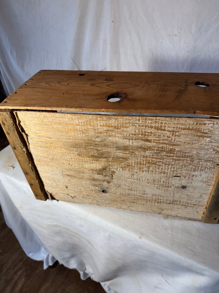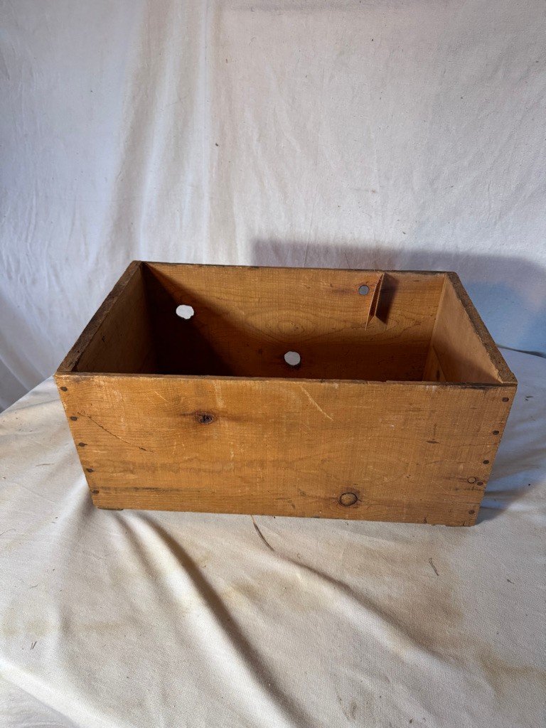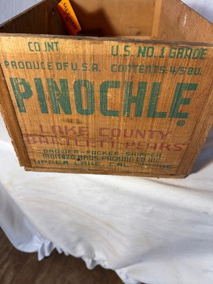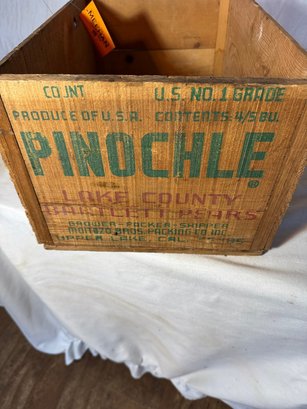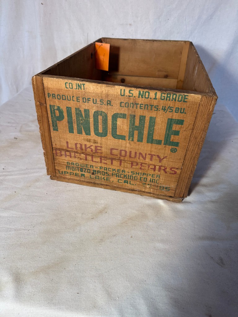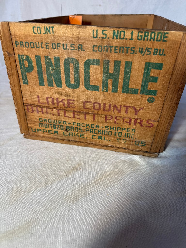 Vintage Wooden box 19 1/2" long 12" deep and 9" tall with Pinochle Lake County Bartlett pears advertising on box
