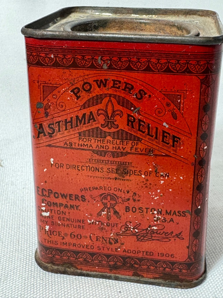 Powers asthma relief tin 3 1/2 inches tall by 2 1/2" x 2 1/2"