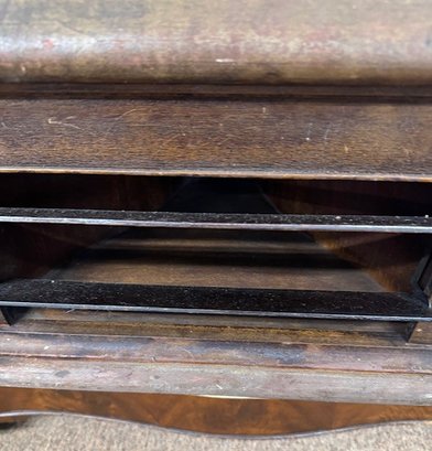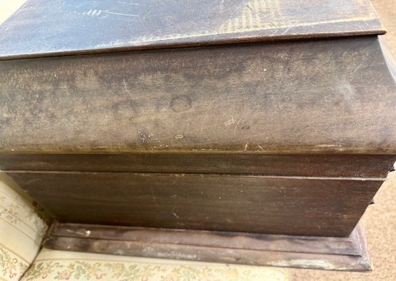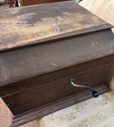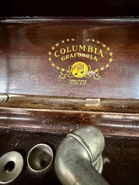 Columbia Grafonola in working condition. Case needs restoration. Spring appears to be fine. Case is 18" wide 21" deep and 14" tall. Louvers in front open to help control volume. Case needs refinishing.
