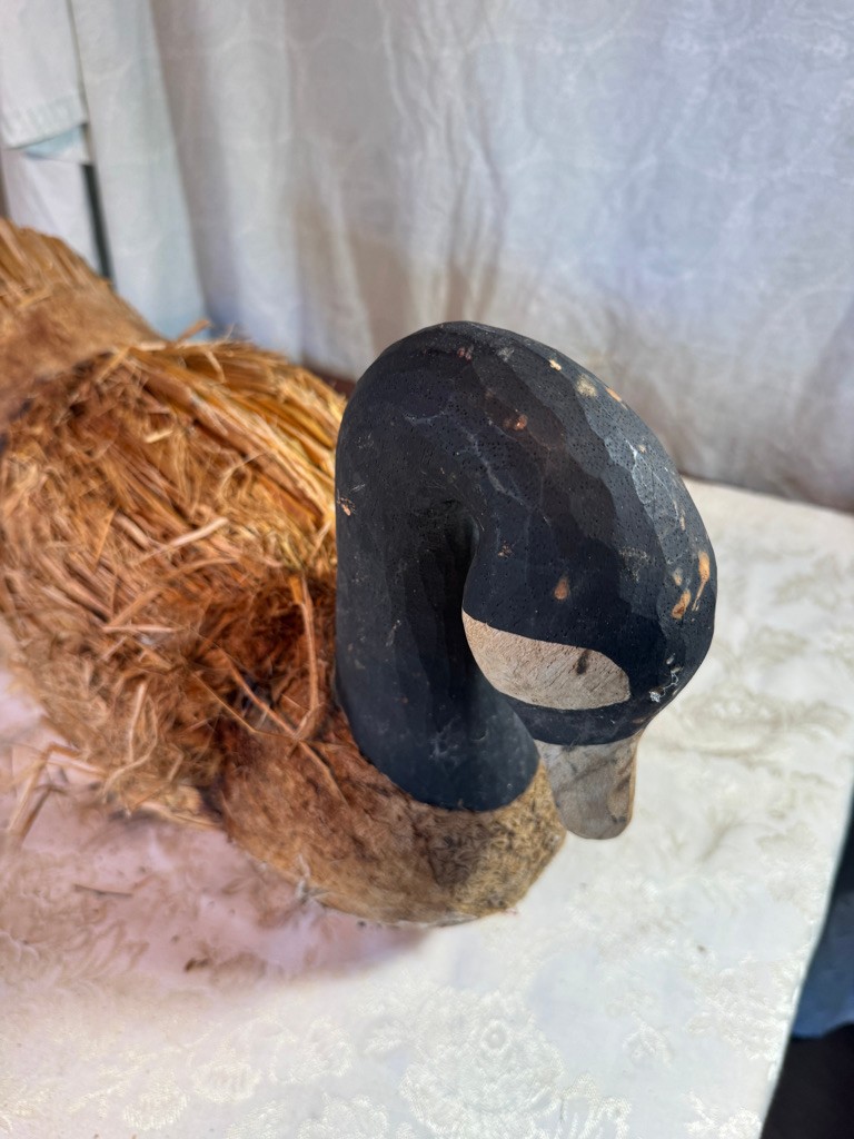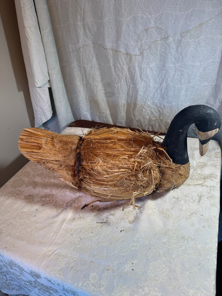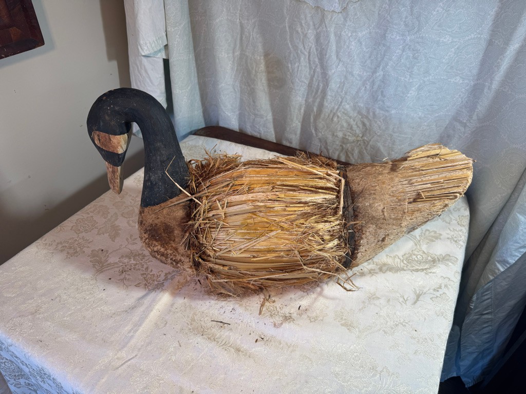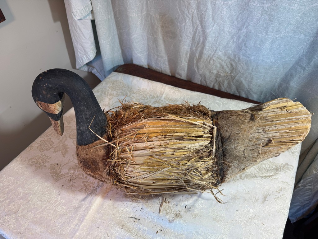 The Primitive Goose isconstructed of multiple material , wood ,metal etc. the goose is 24 inches long 10 inches deep and 14 inches tall, Very unusual goose decoy