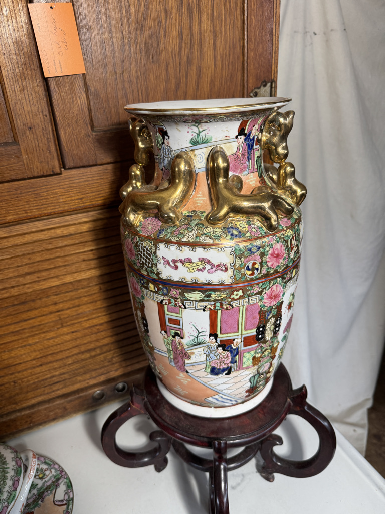 Rose medallion vase and stand vase is 14" tall and vase base is 6 5/8" in diameter